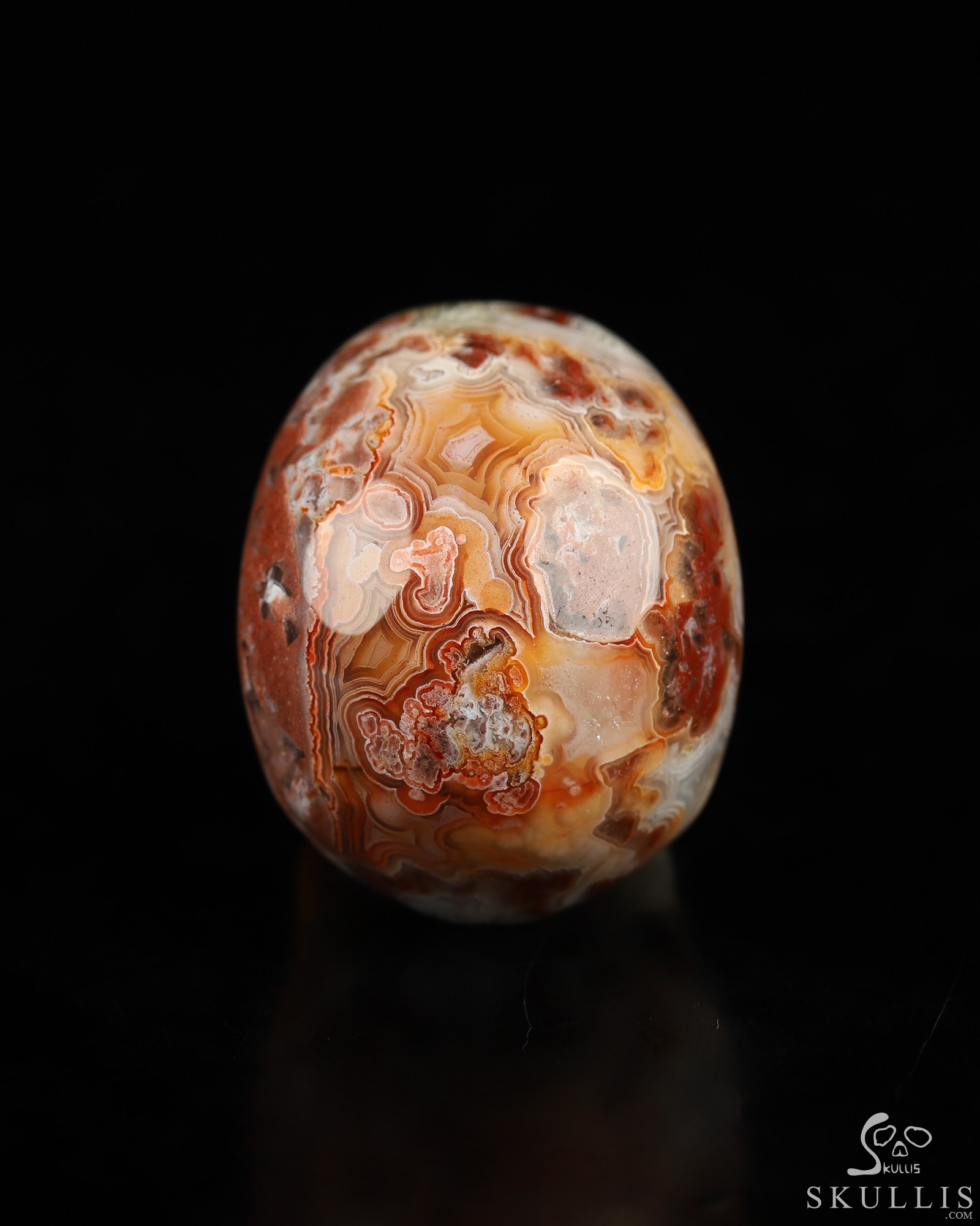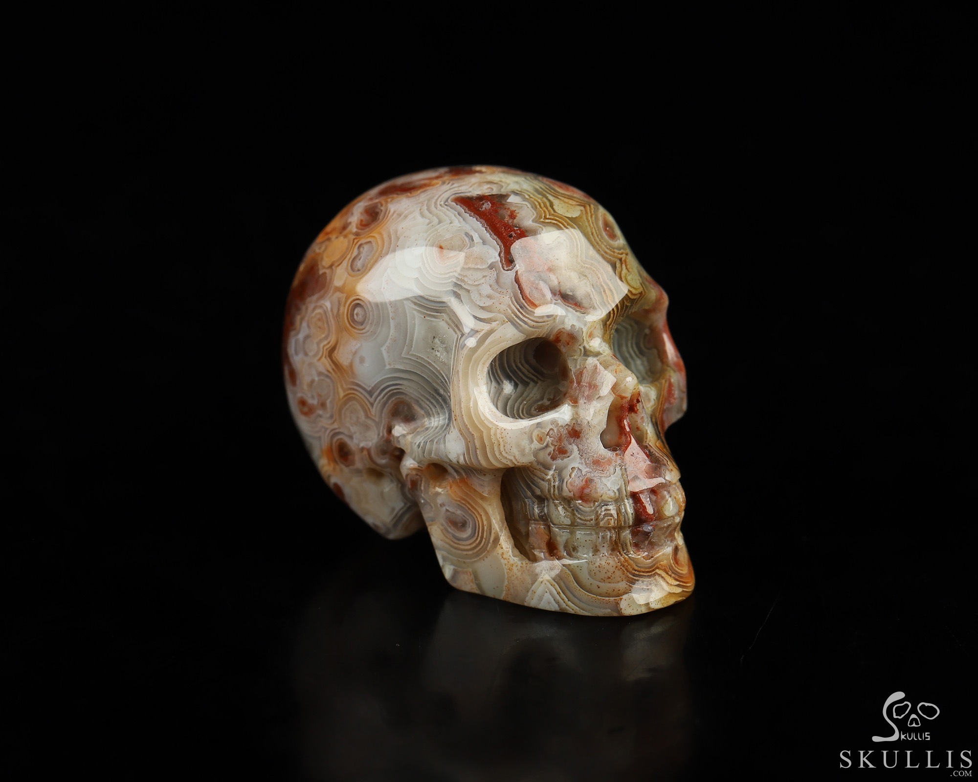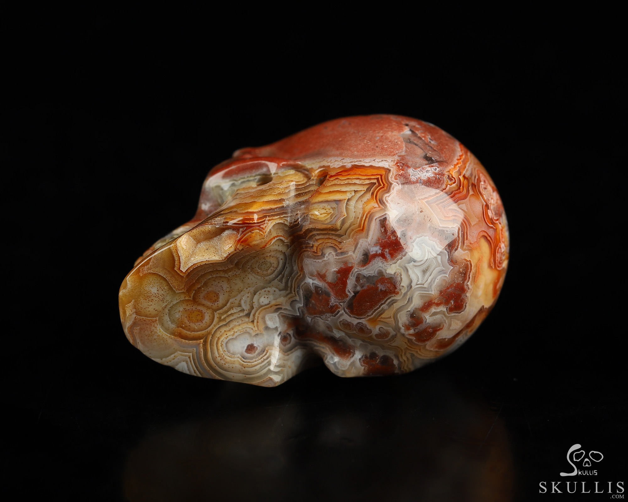 You are looking at a Red Crazy Lace Agate skull. The skull is 1.3 inches from front to back.