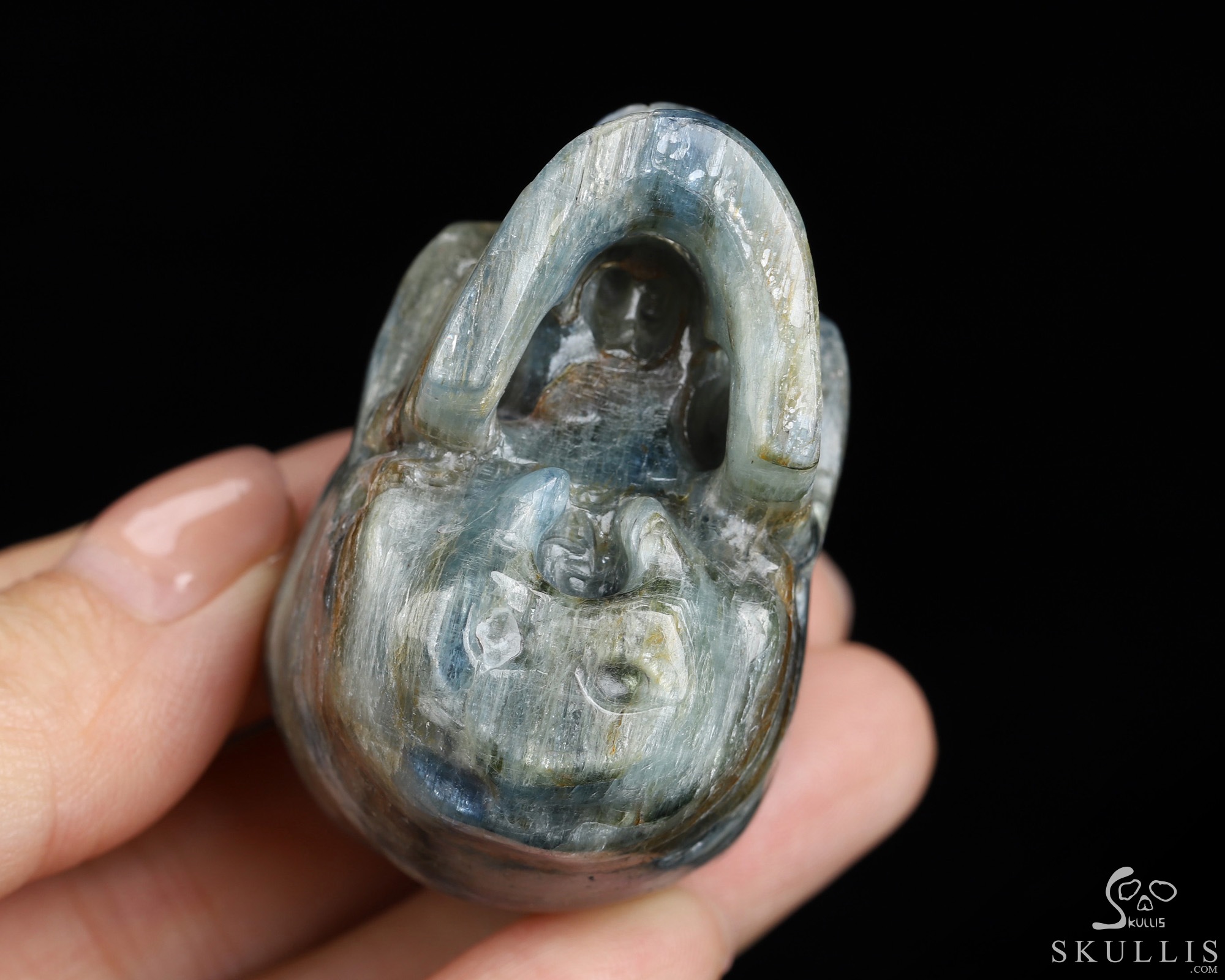 You are looking at a Kyanite skull. The skull is 1.8 inches from front to back.