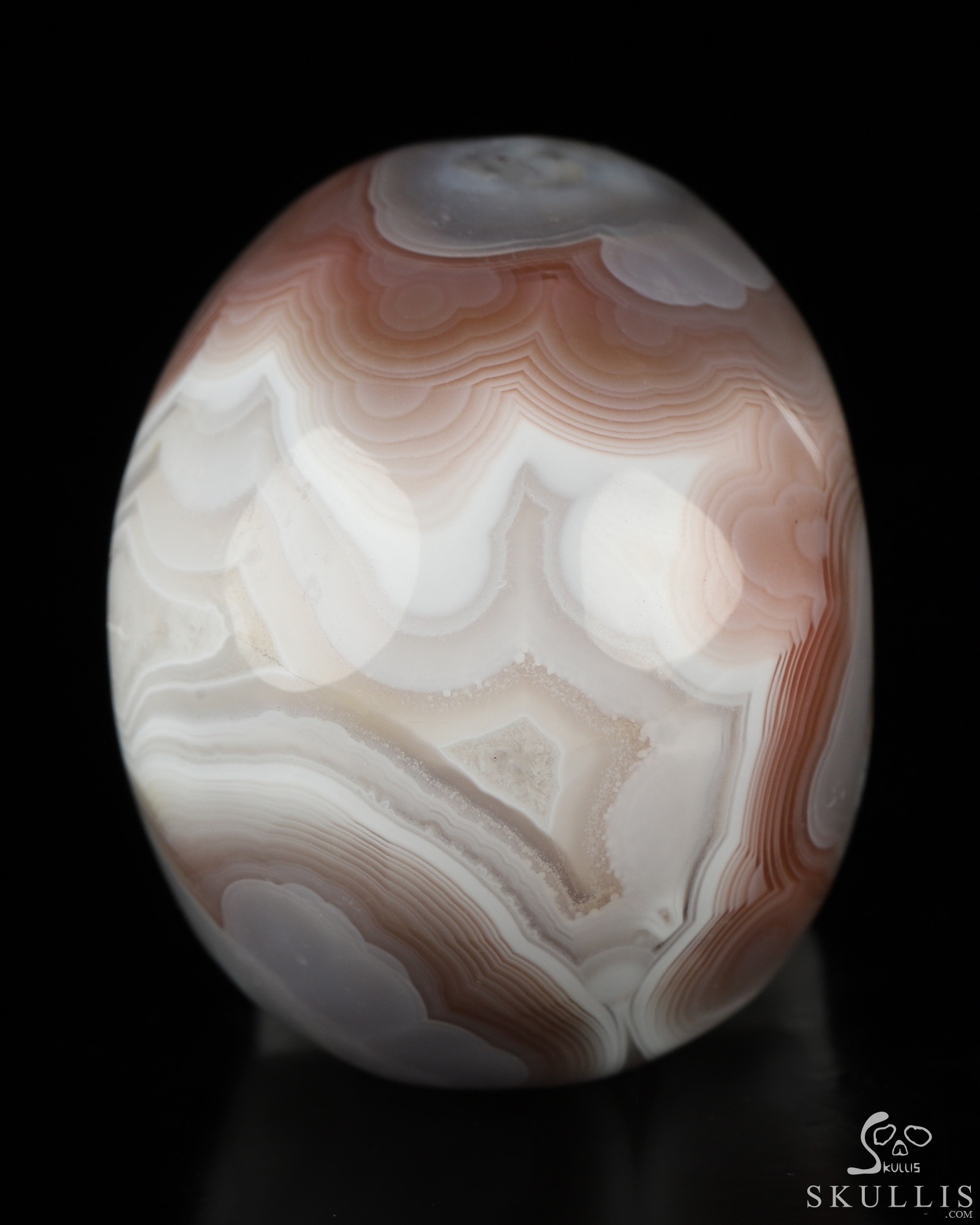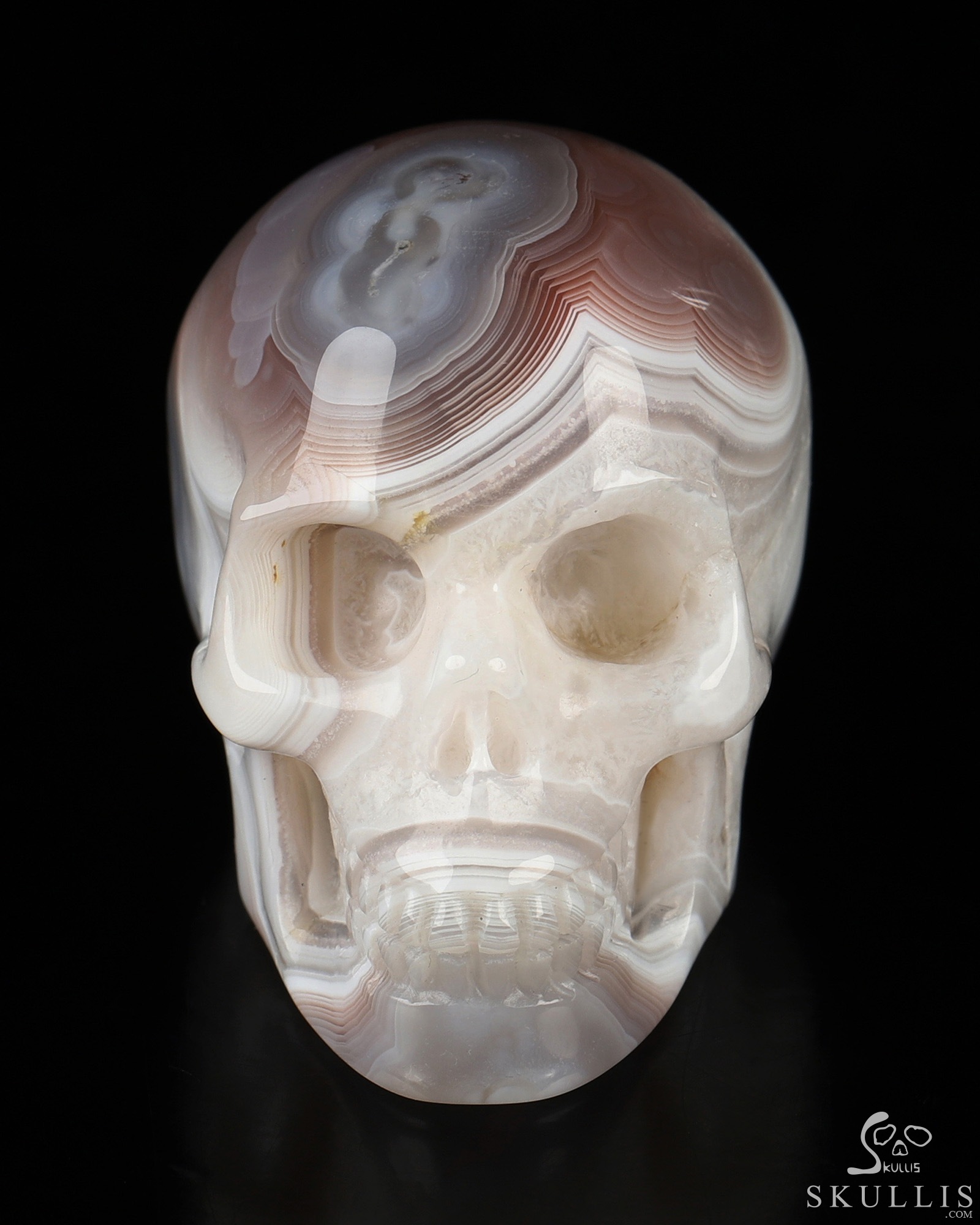 You are looking at a Mozambique Agate skull. The skull is 2 inches from front to back.