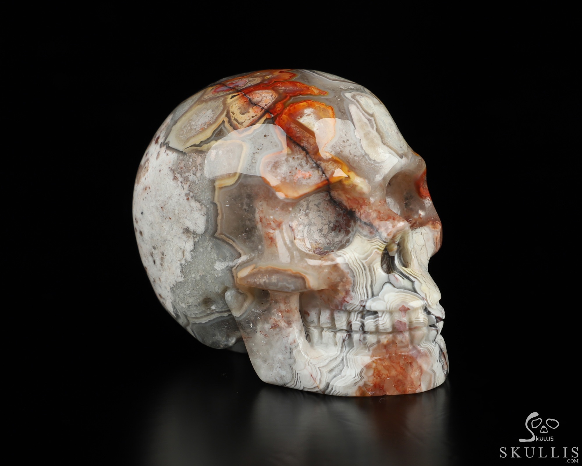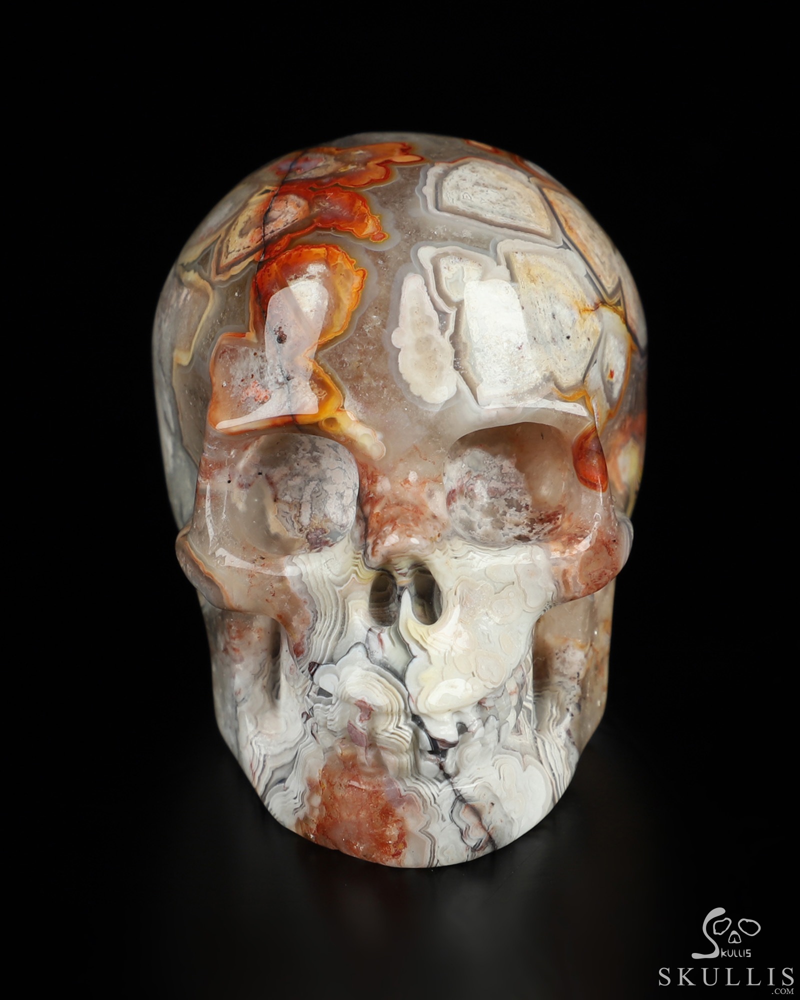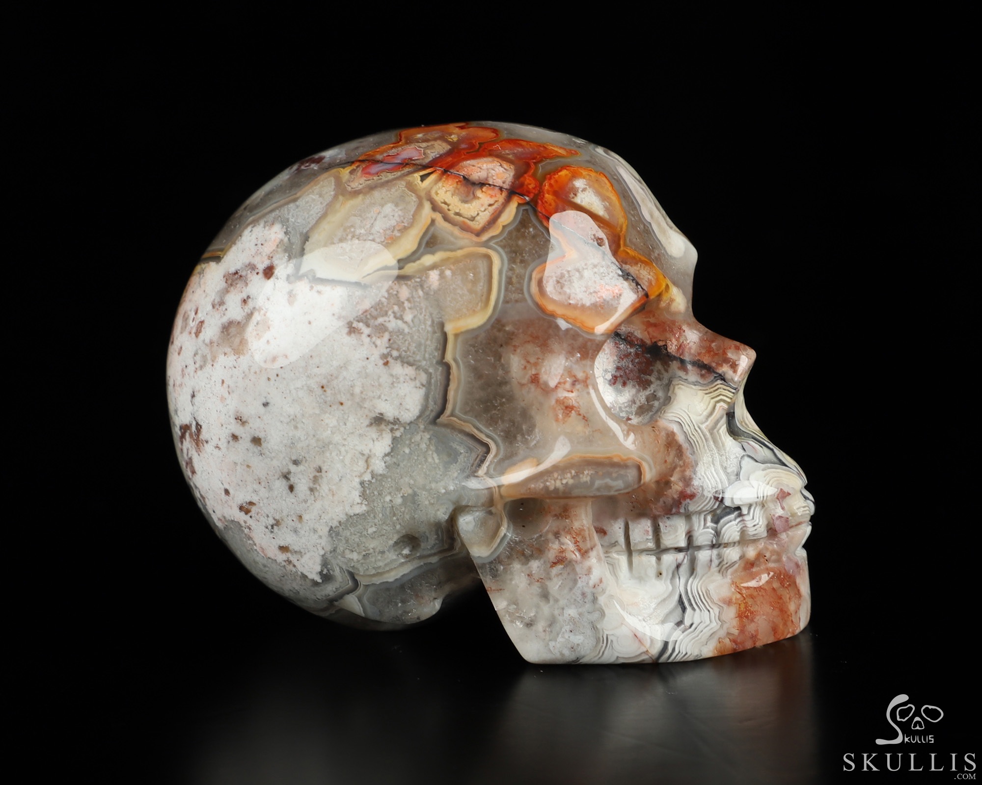 You are looking at a Red Crazy Lace Agate skull. The skull is 2 inches from front to back.
