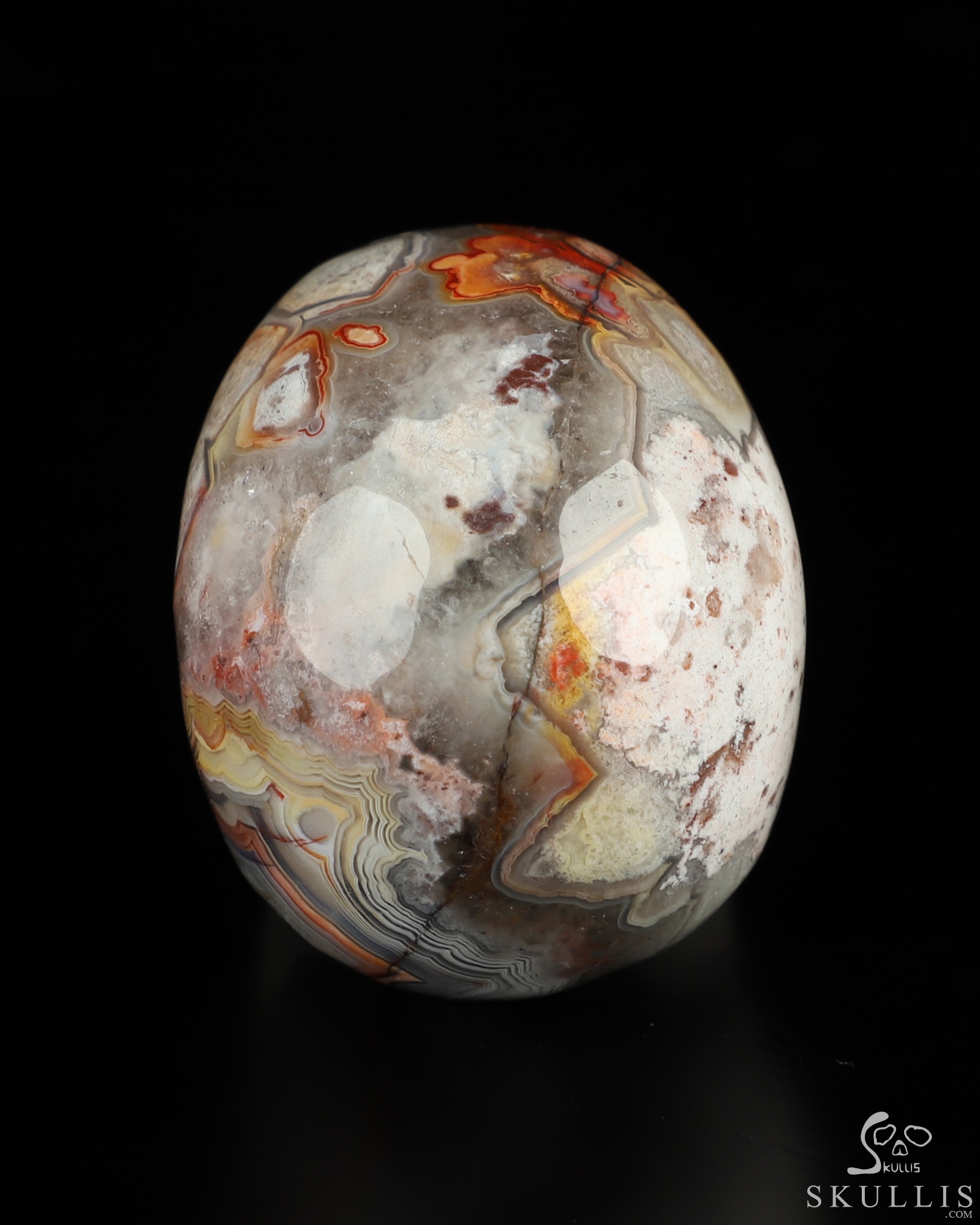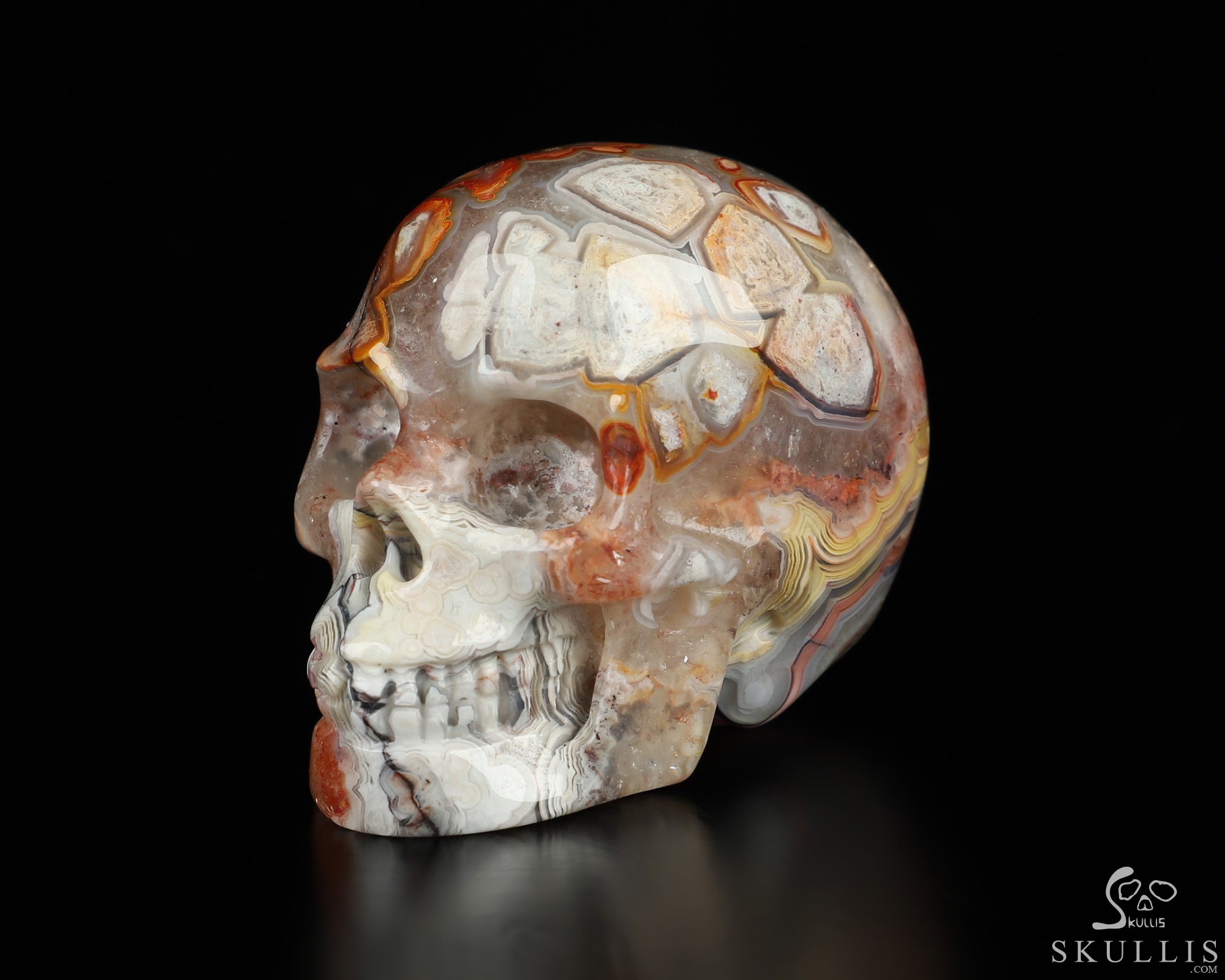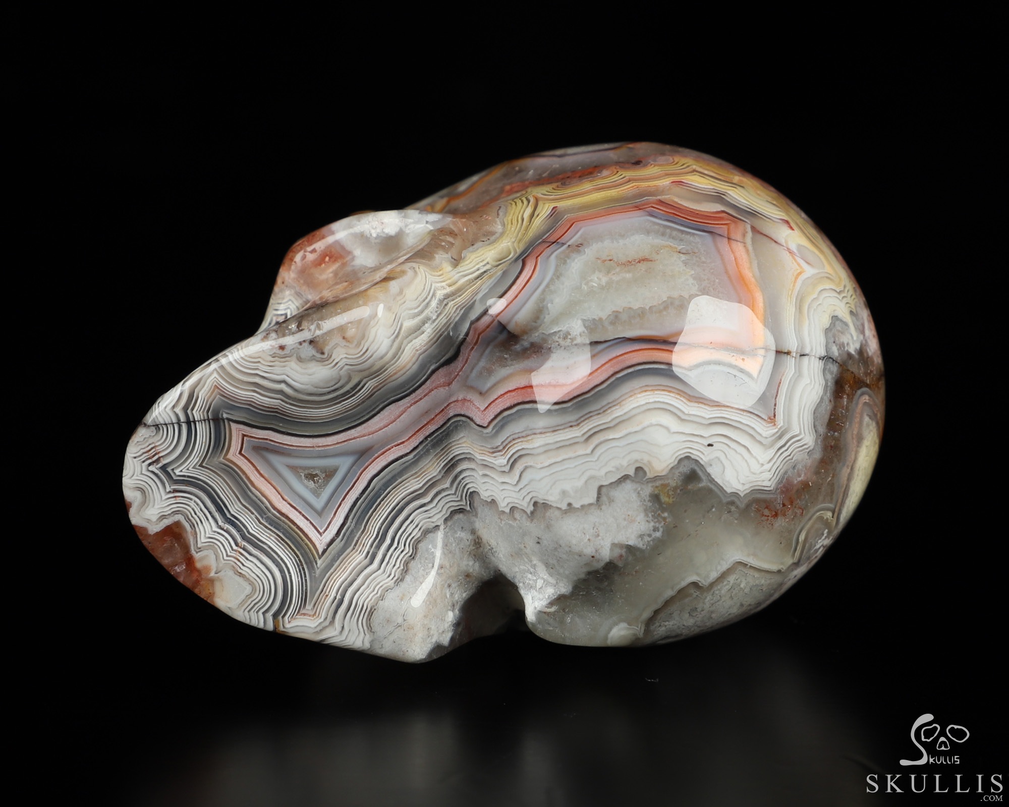 You are looking at a Red Crazy Lace Agate skull. The skull is 2 inches from front to back.