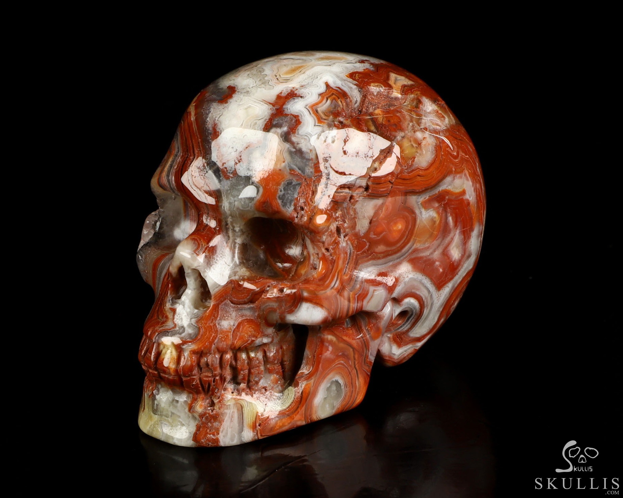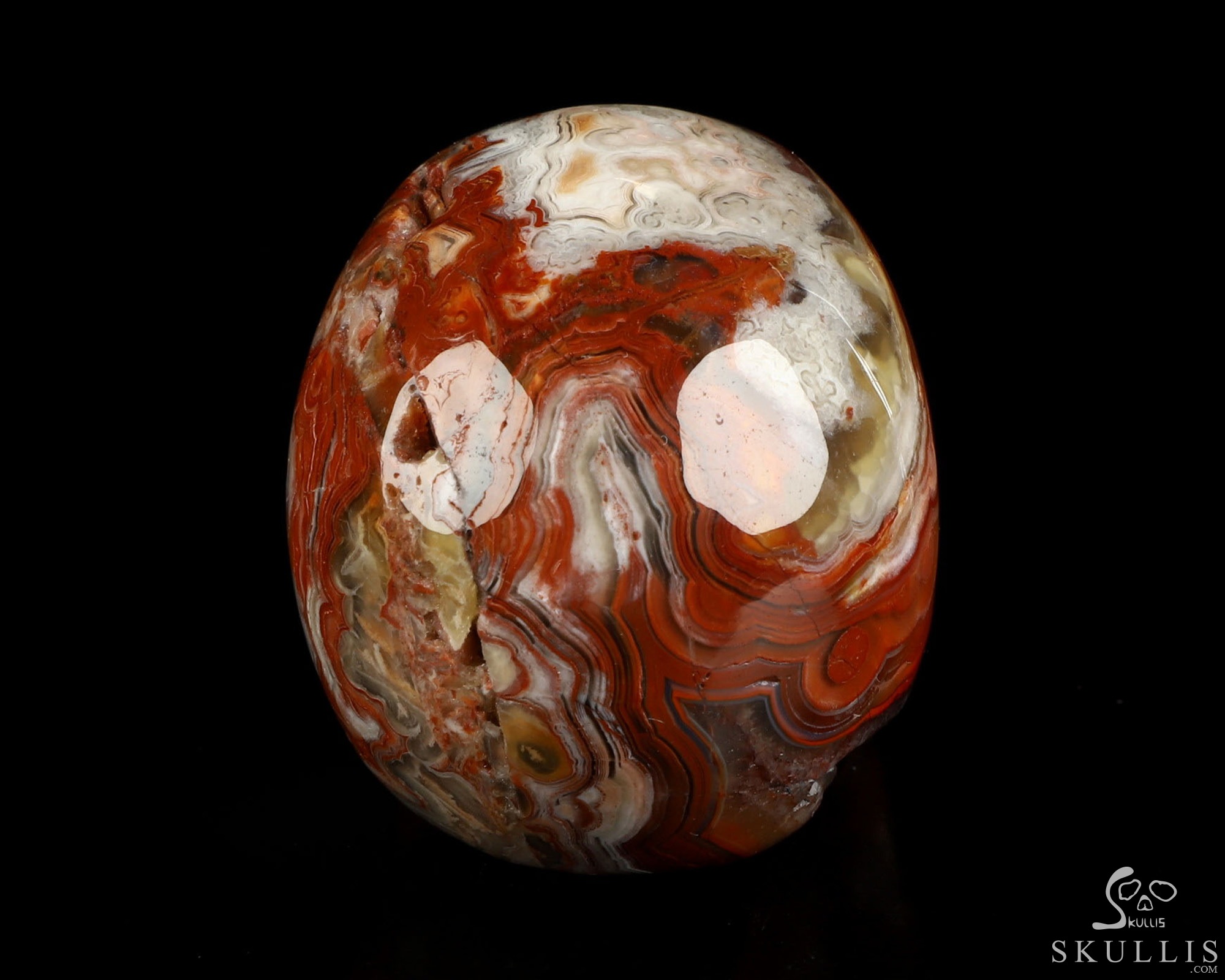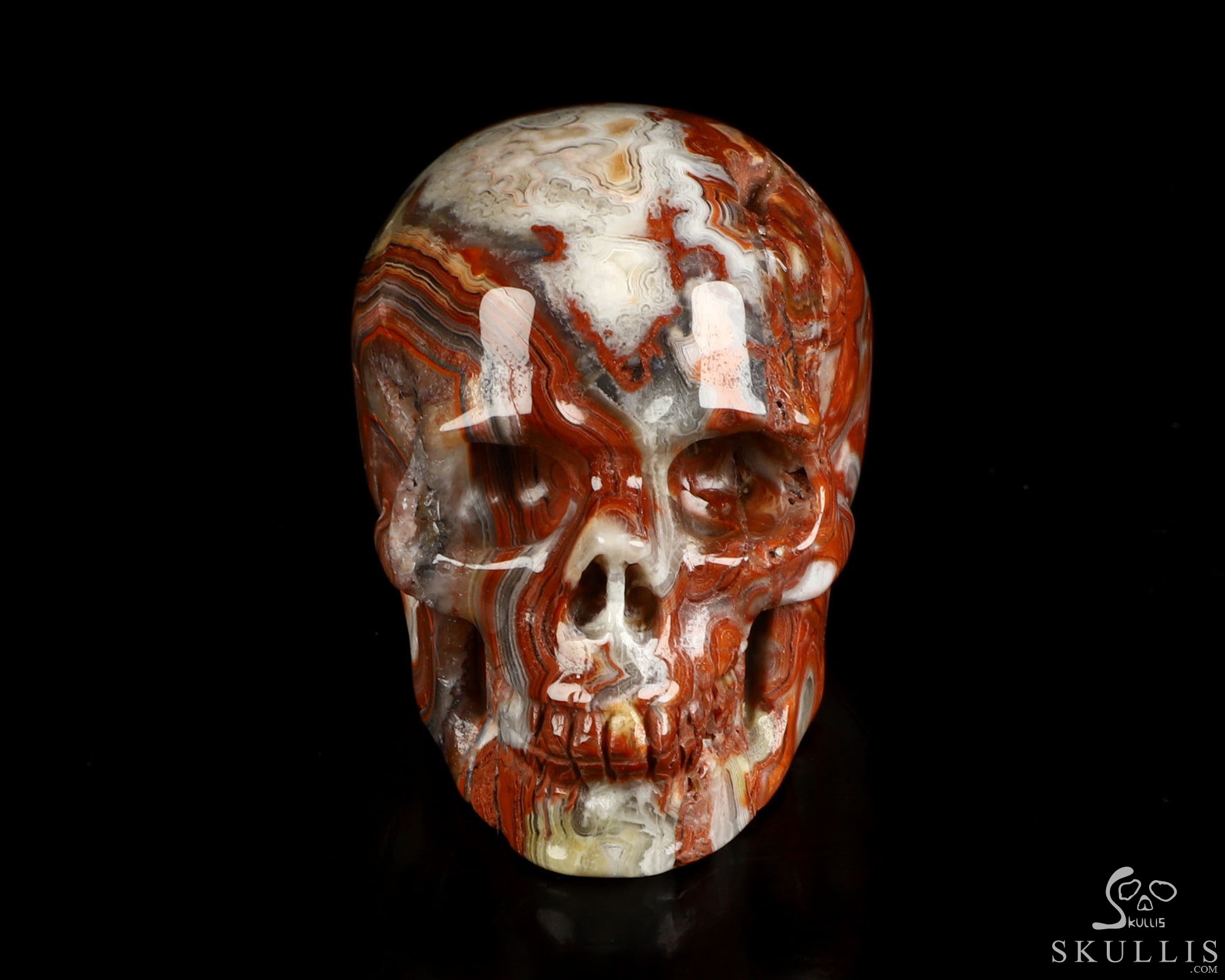 You are looking at a Red Crazy Lace Agate skull. The skull is 2 inches from front to back.