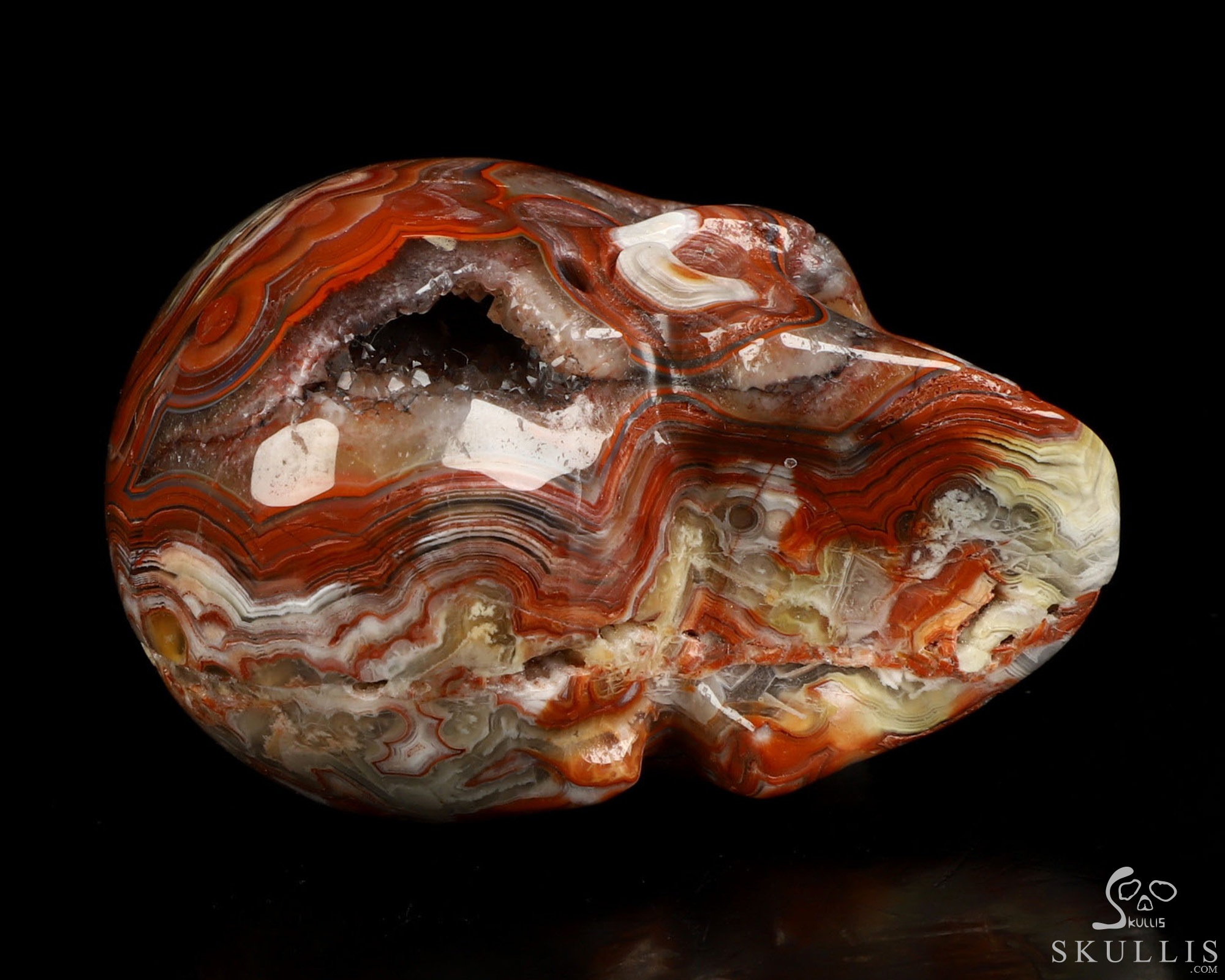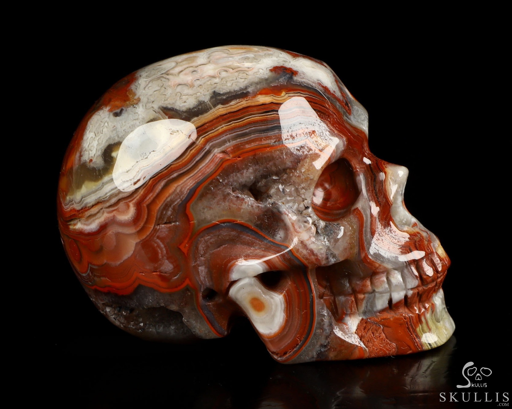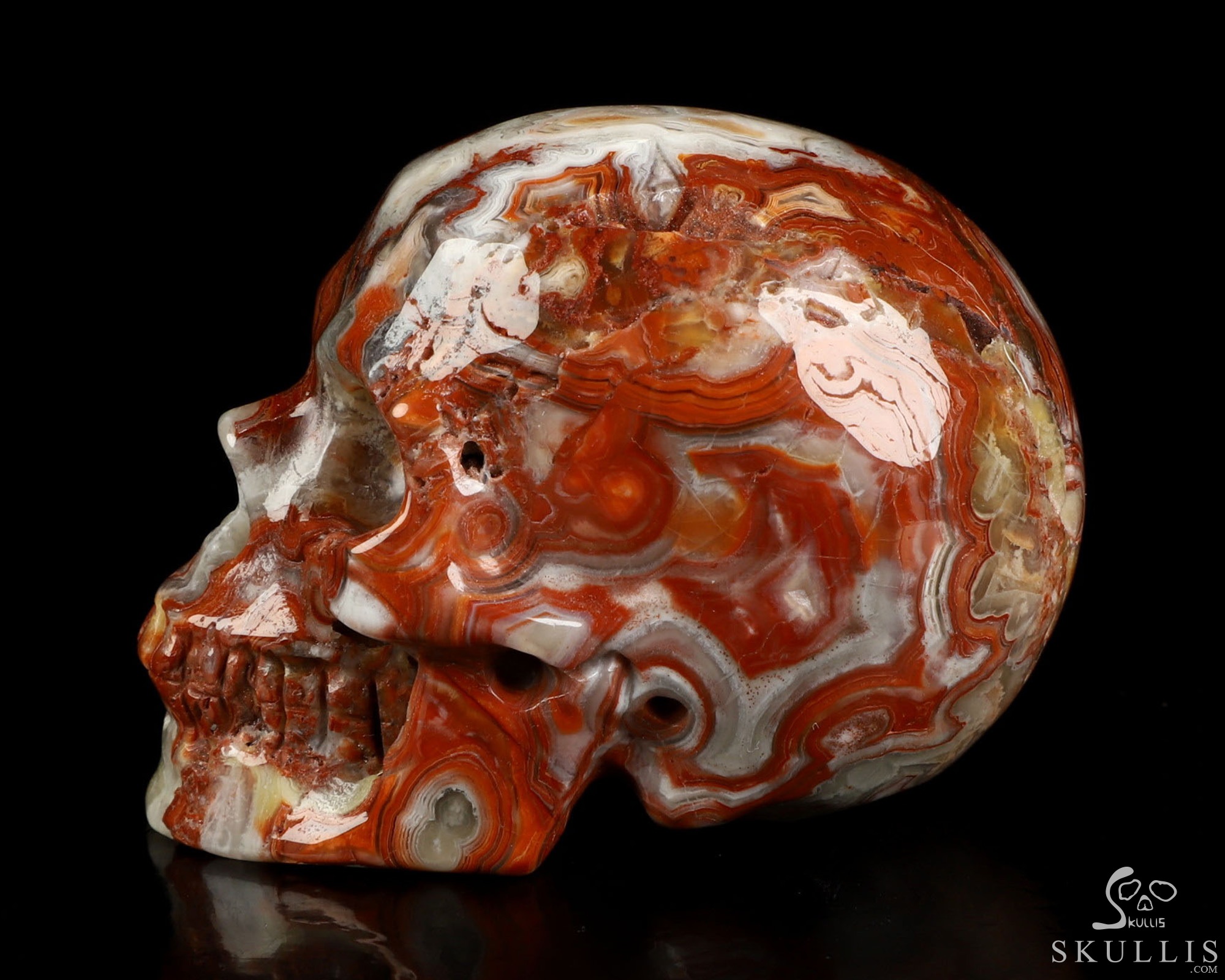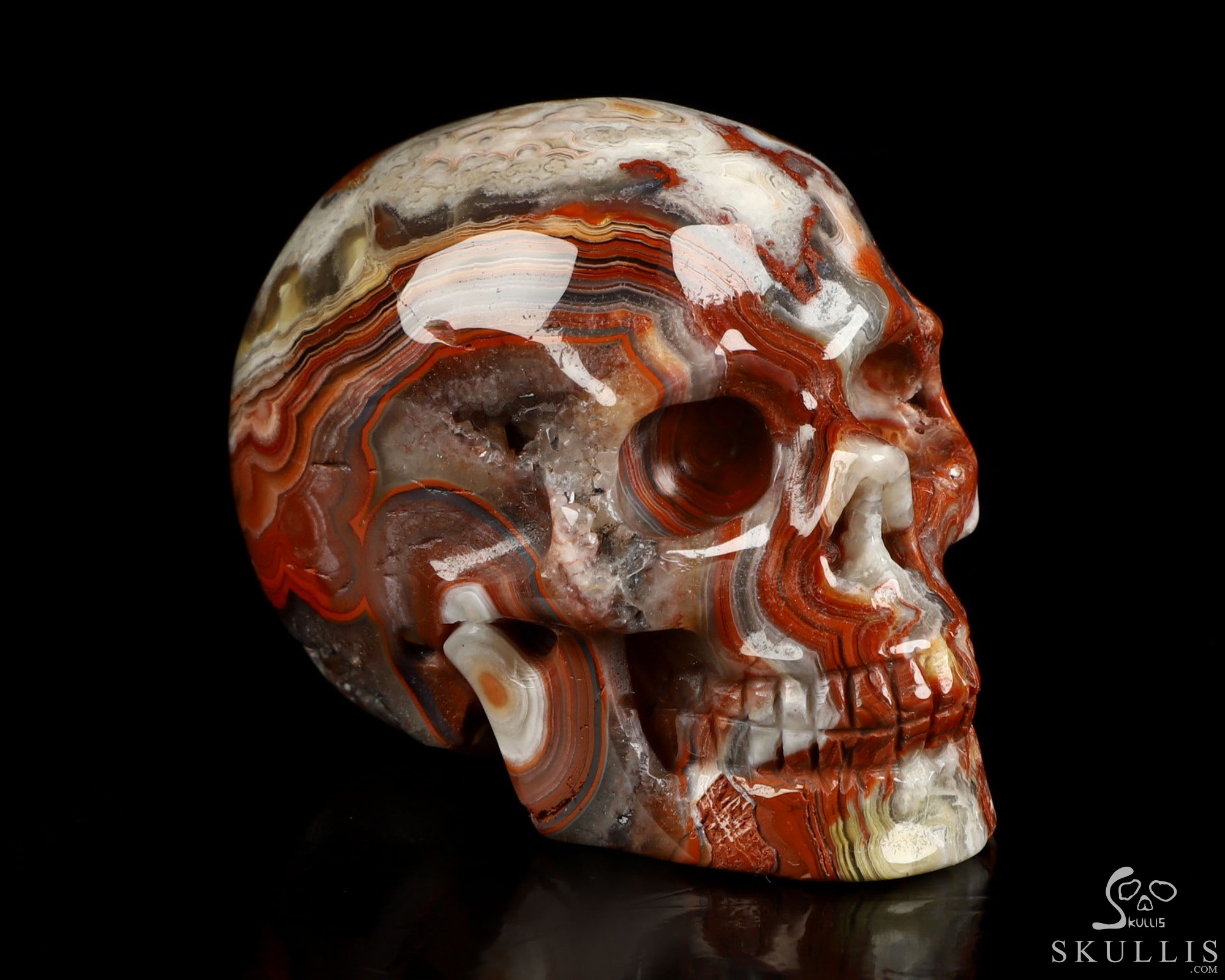 You are looking at a Red Crazy Lace Agate skull. The skull is 2 inches from front to back.