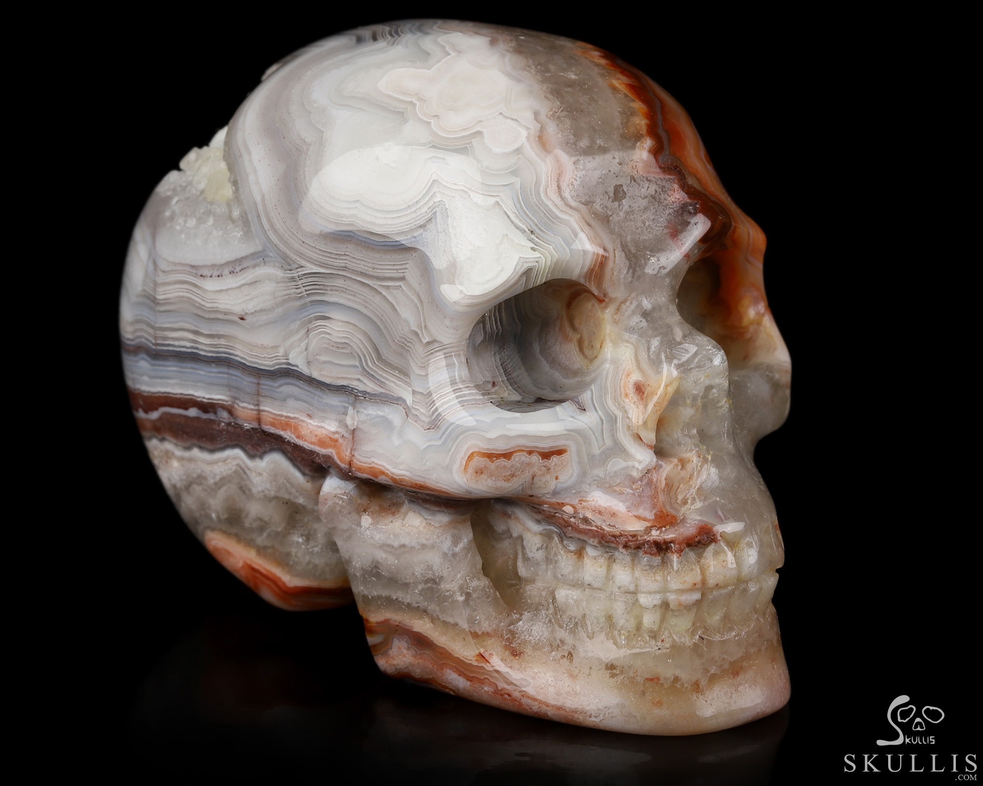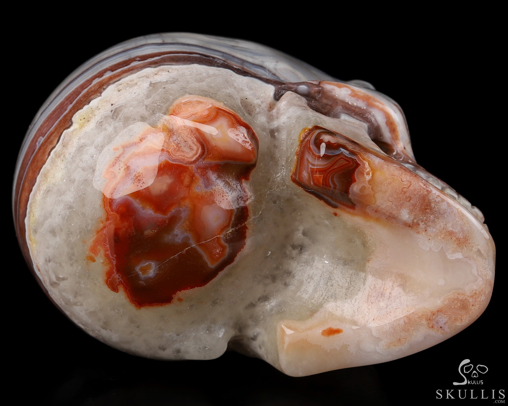 You are looking at a Red Crazy Lace Agate skull. The skull is 2 inches from front to back.