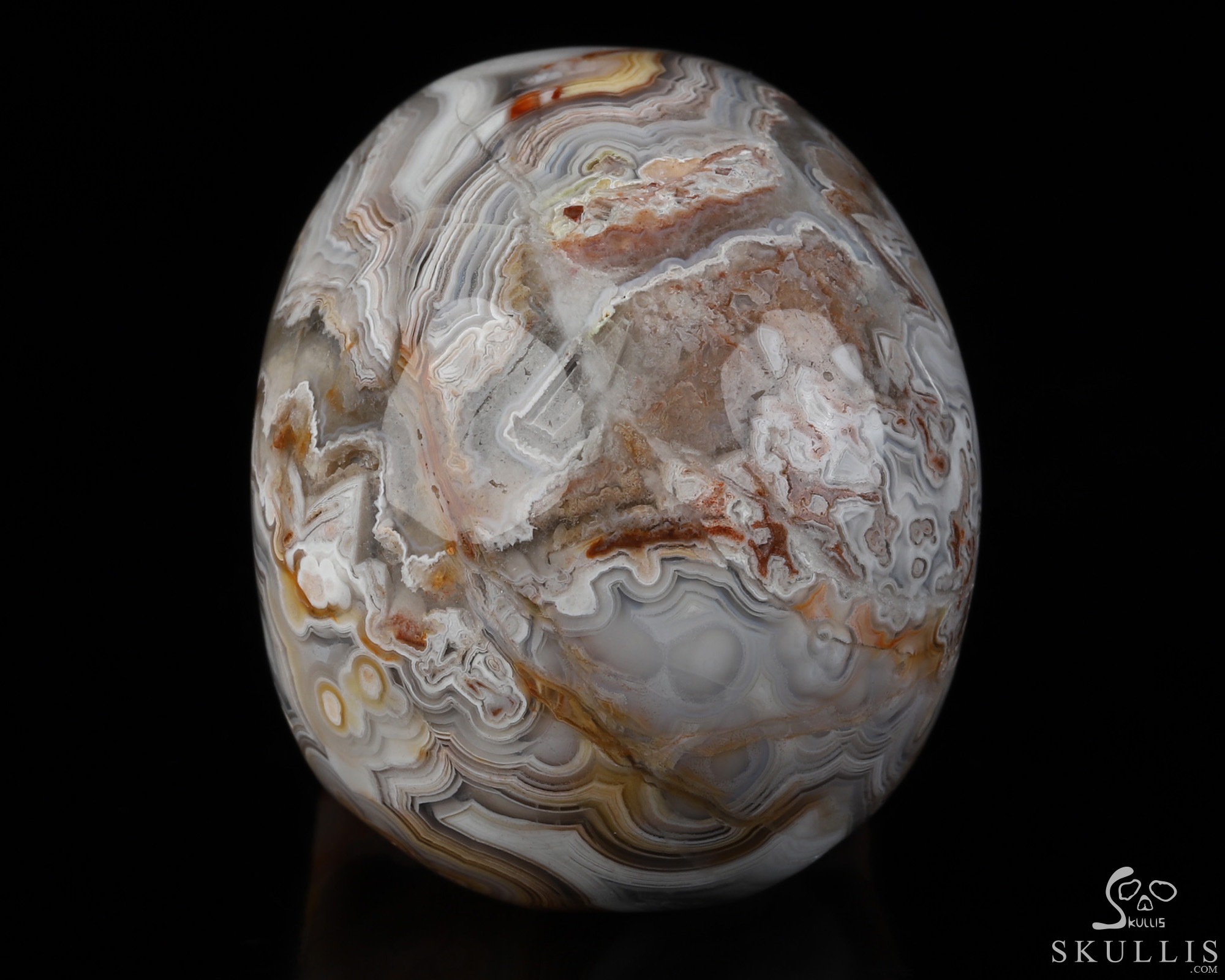 You are looking at a Red Crazy Lace Agate skull. The skull is 2 inches from front to back.