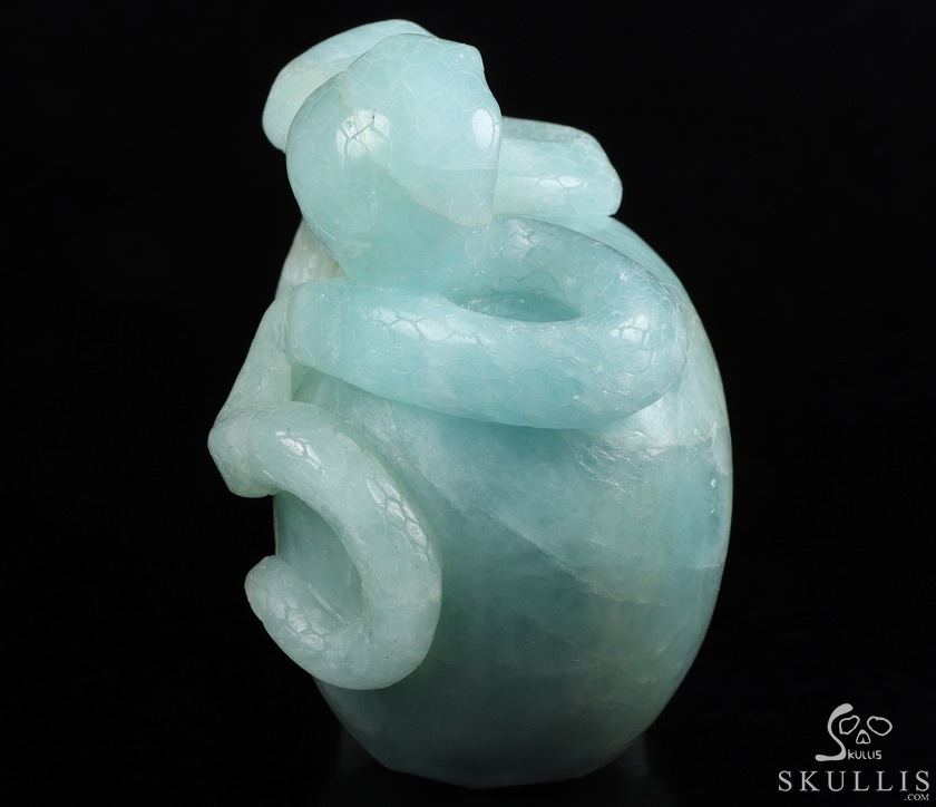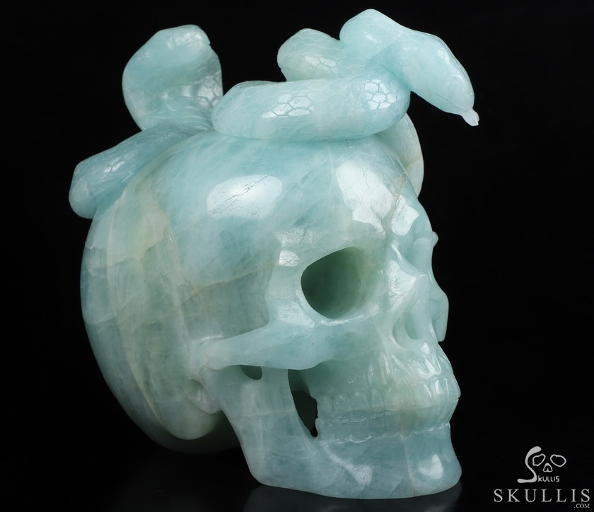 Gemstone 5.7" Aquamarine Carved Crystal Skull & Snakes, Crystal Healing