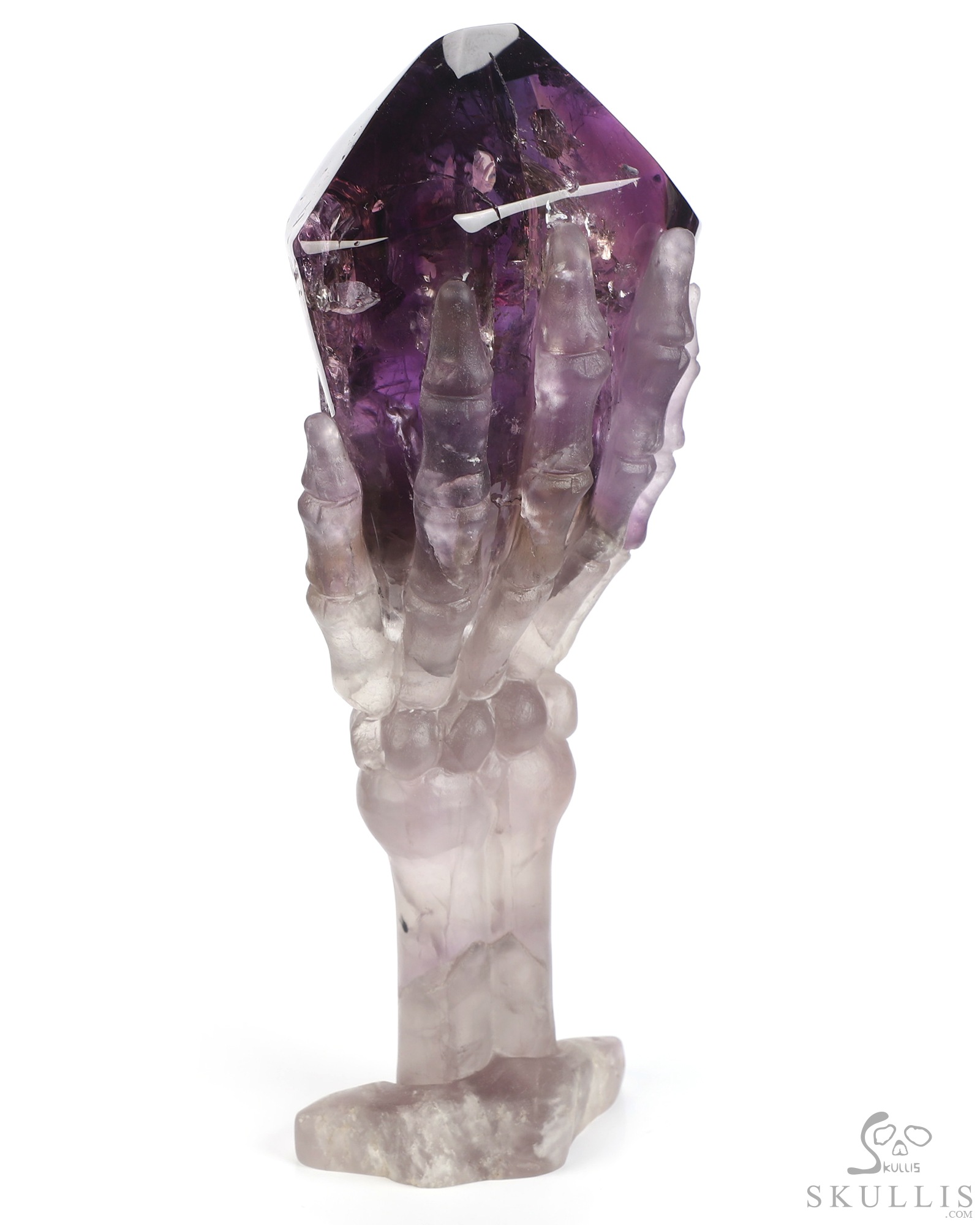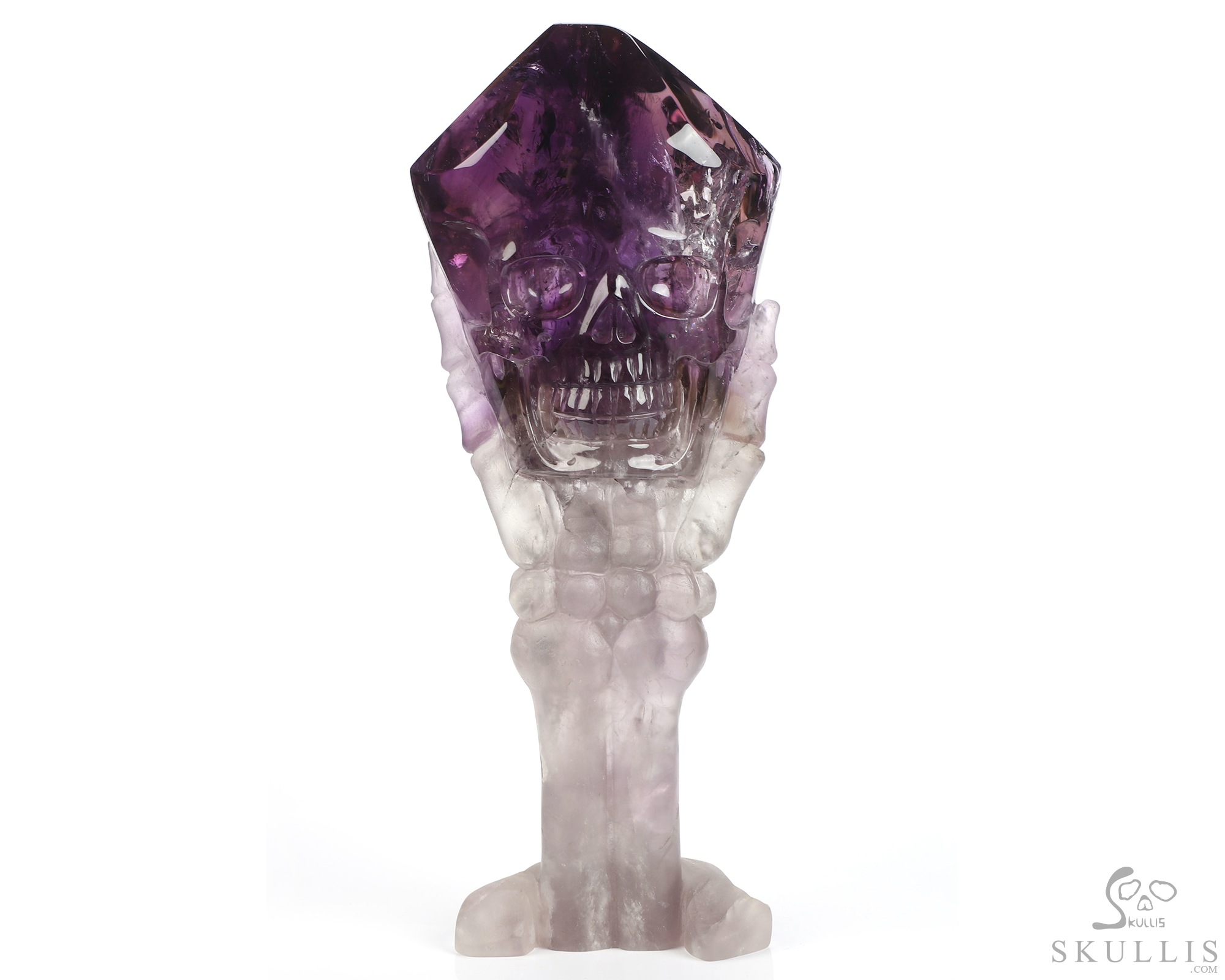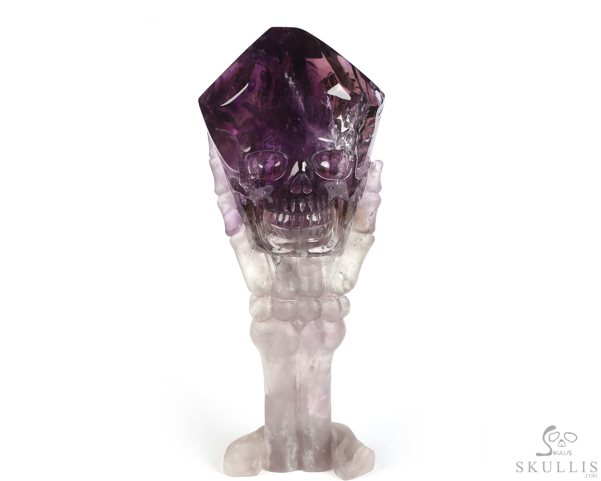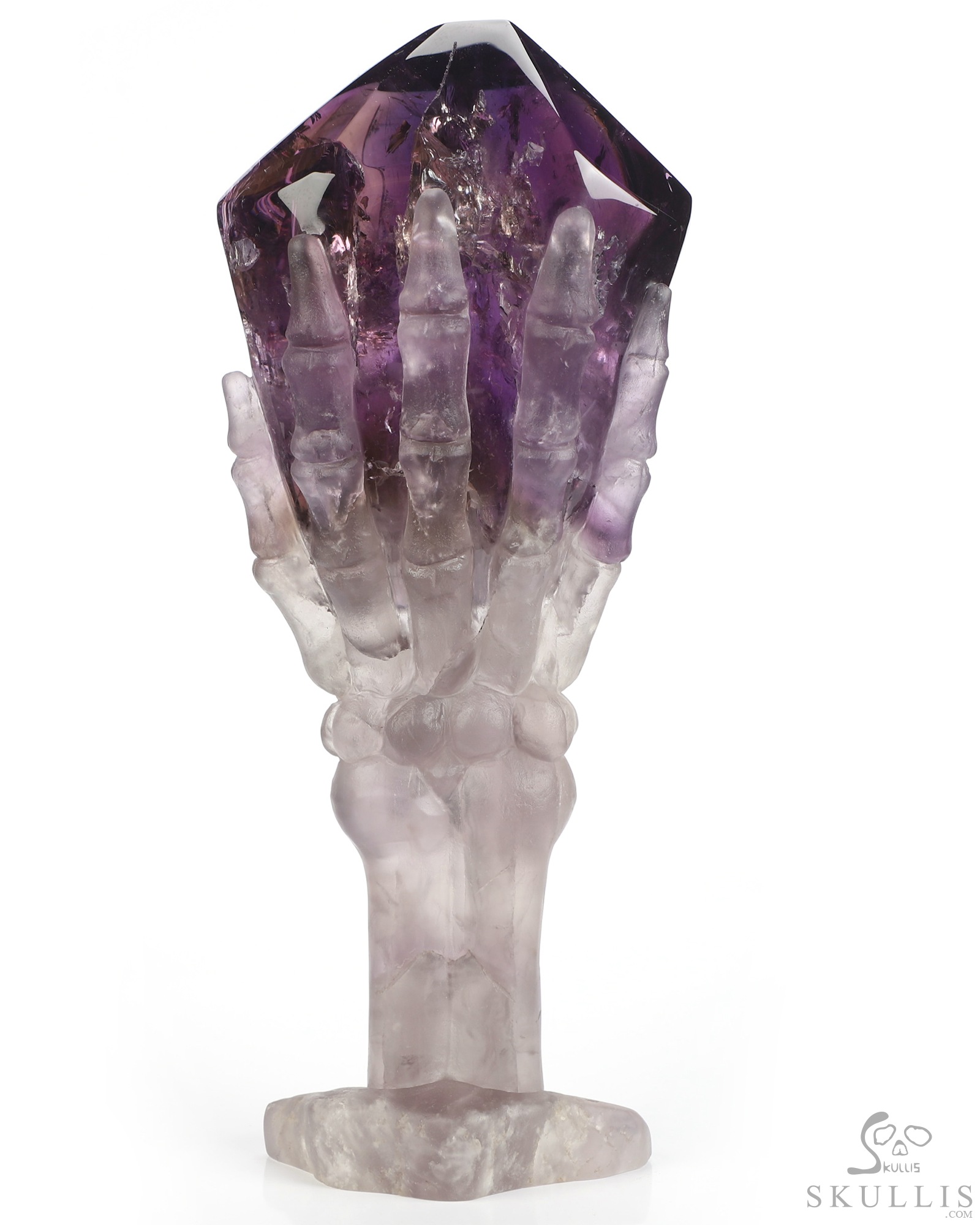 Gemstone 6.7" Amethyst Hand Carved Crystal Skull Skull and Hand Bone Fine Art Sculpture, Crystal Healing