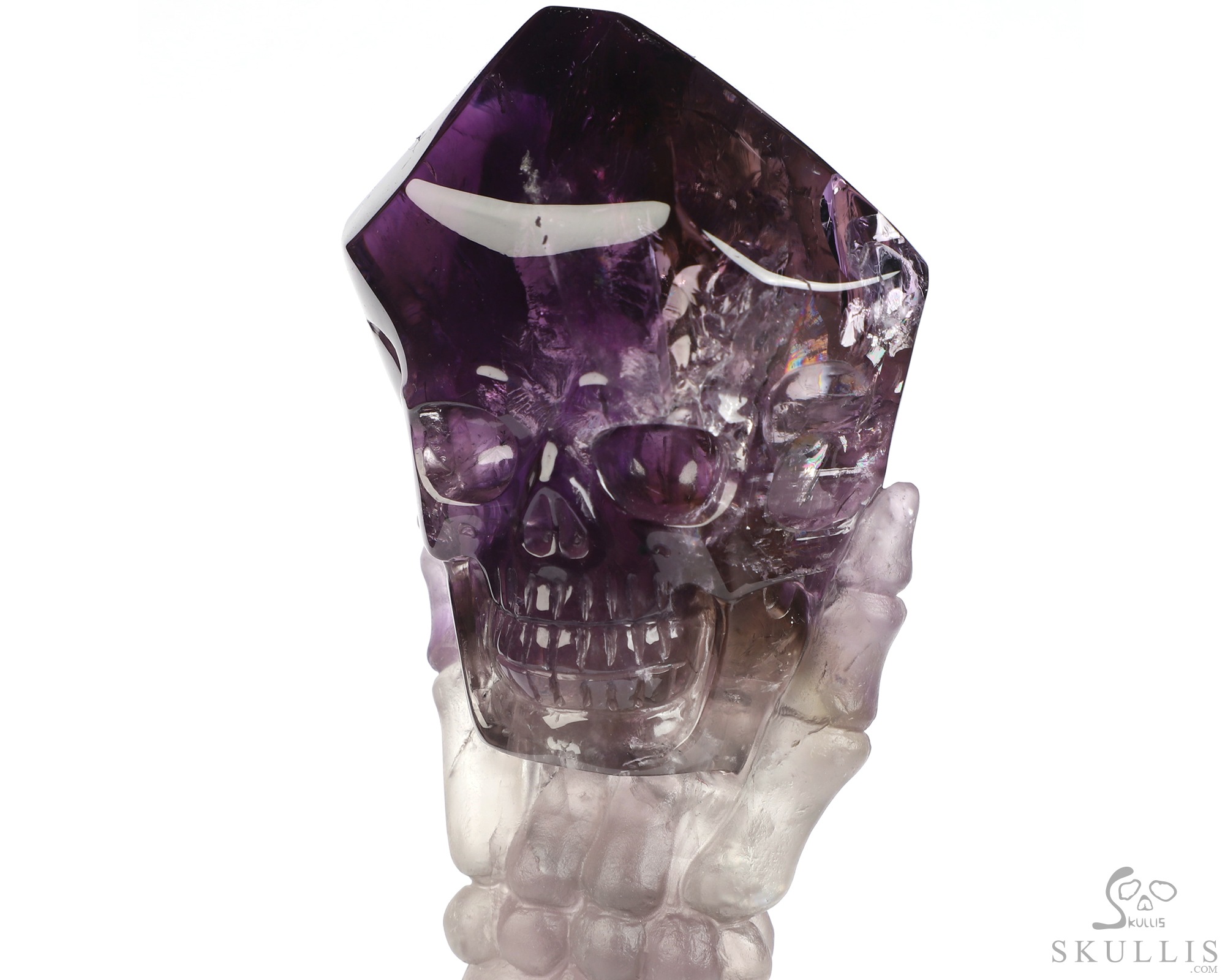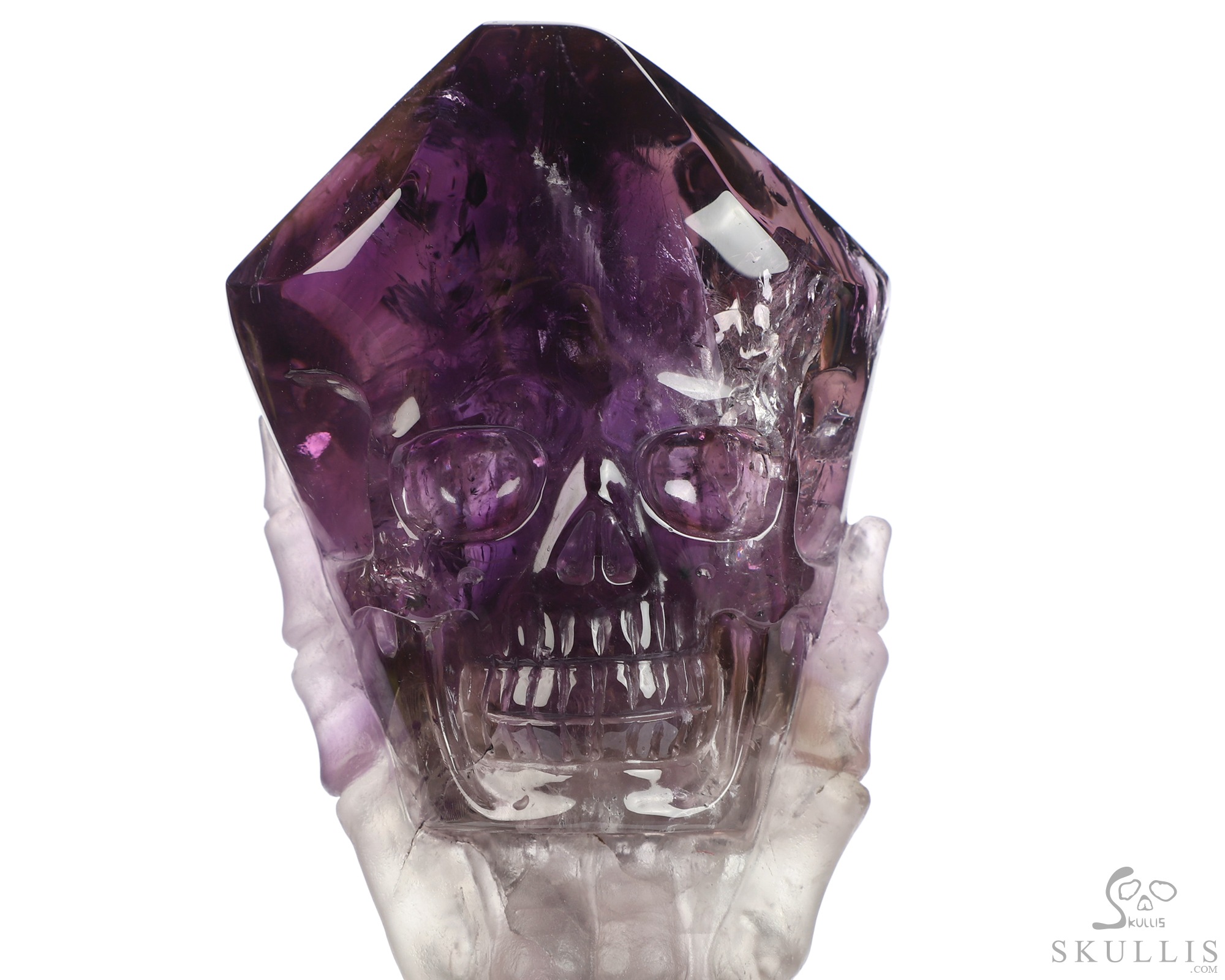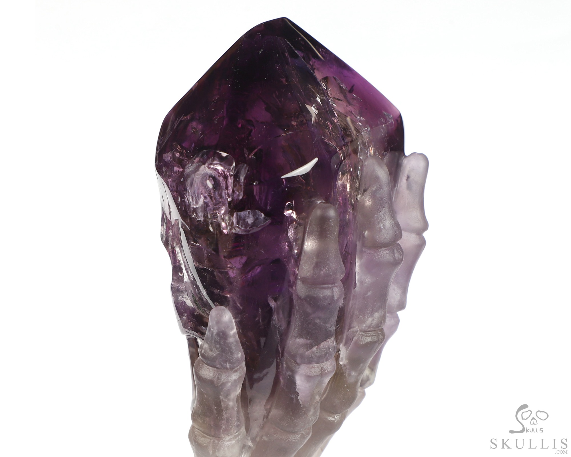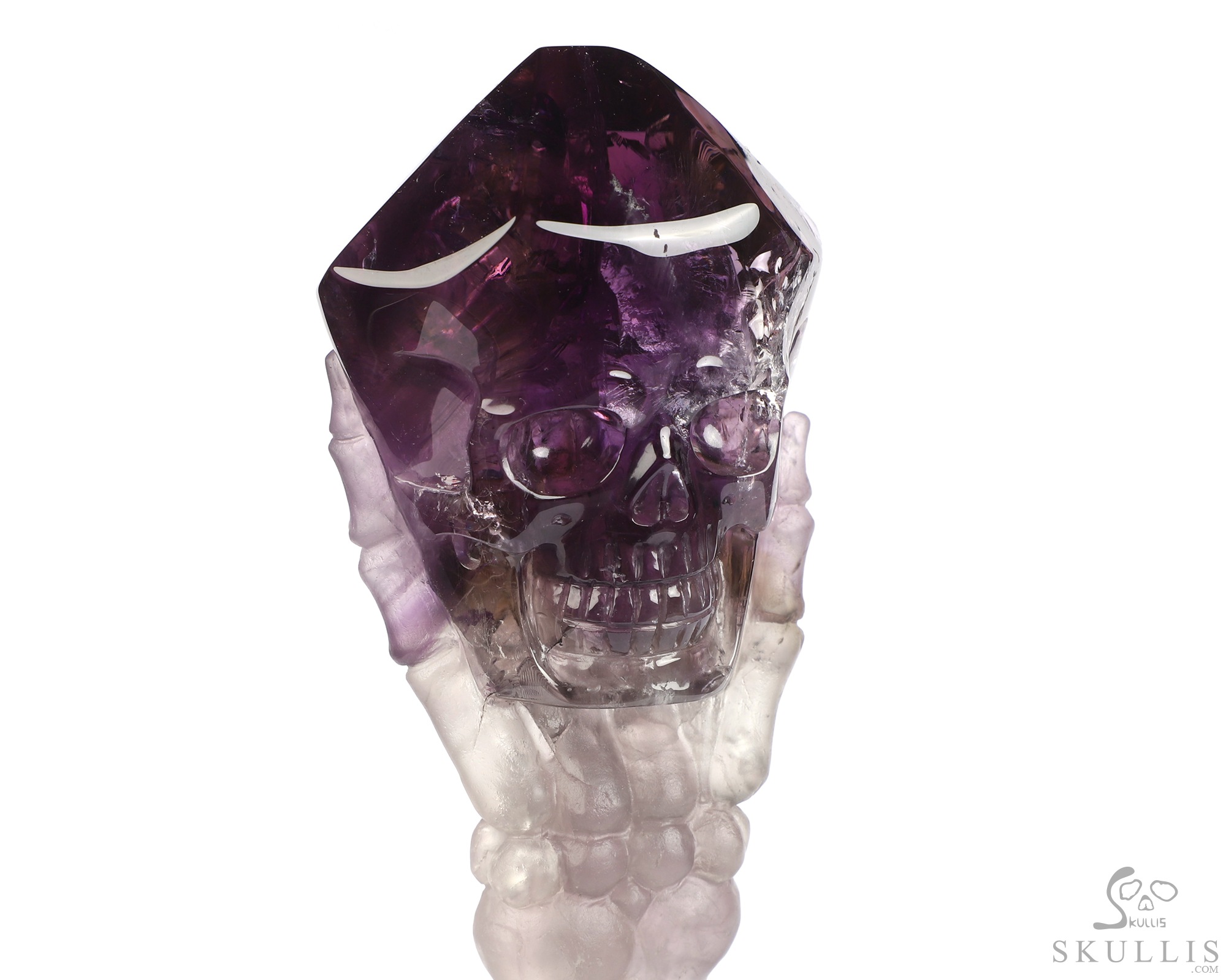 Gemstone 6.7" Amethyst Hand Carved Crystal Skull Skull and Hand Bone Fine Art Sculpture, Crystal Healing