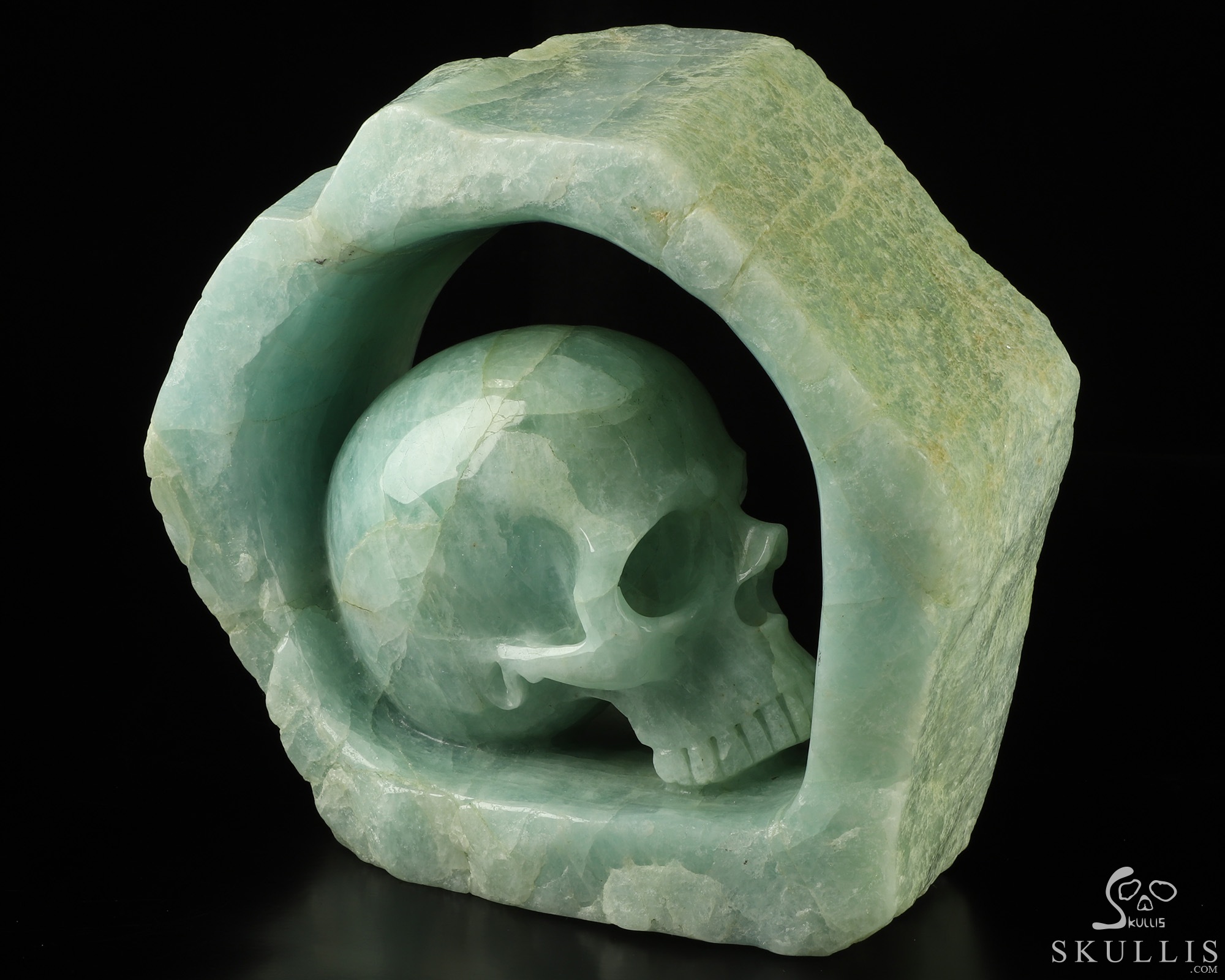 Gemstone 7.6" Aquamarine Carved Crystal Skull Inside Six-sided cylinder, Crystal Healing