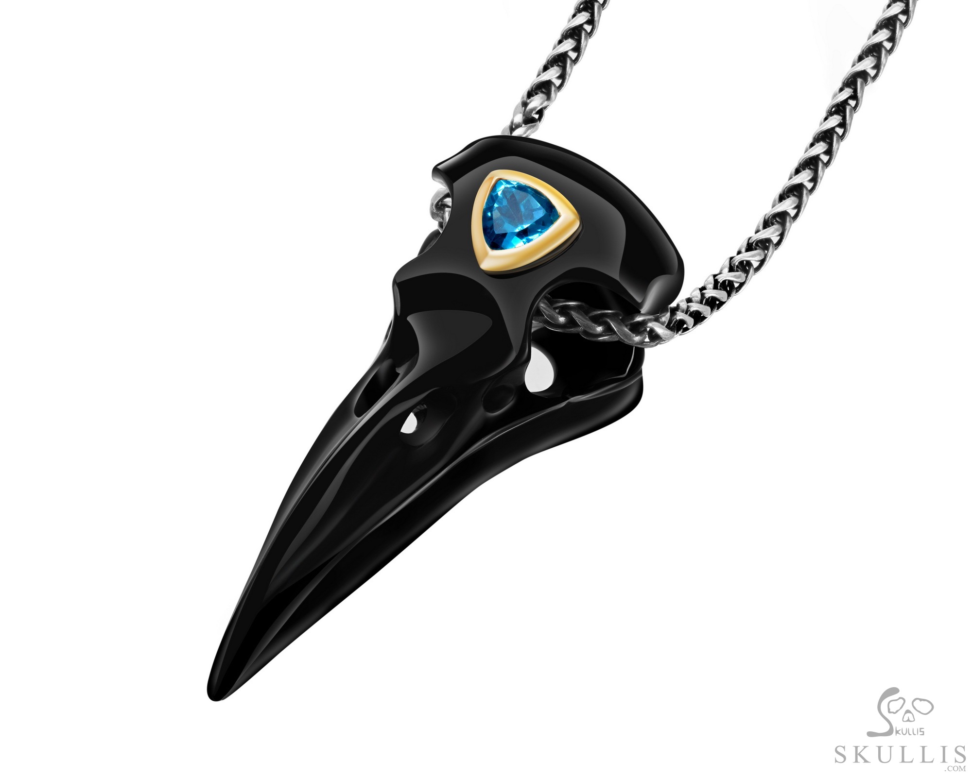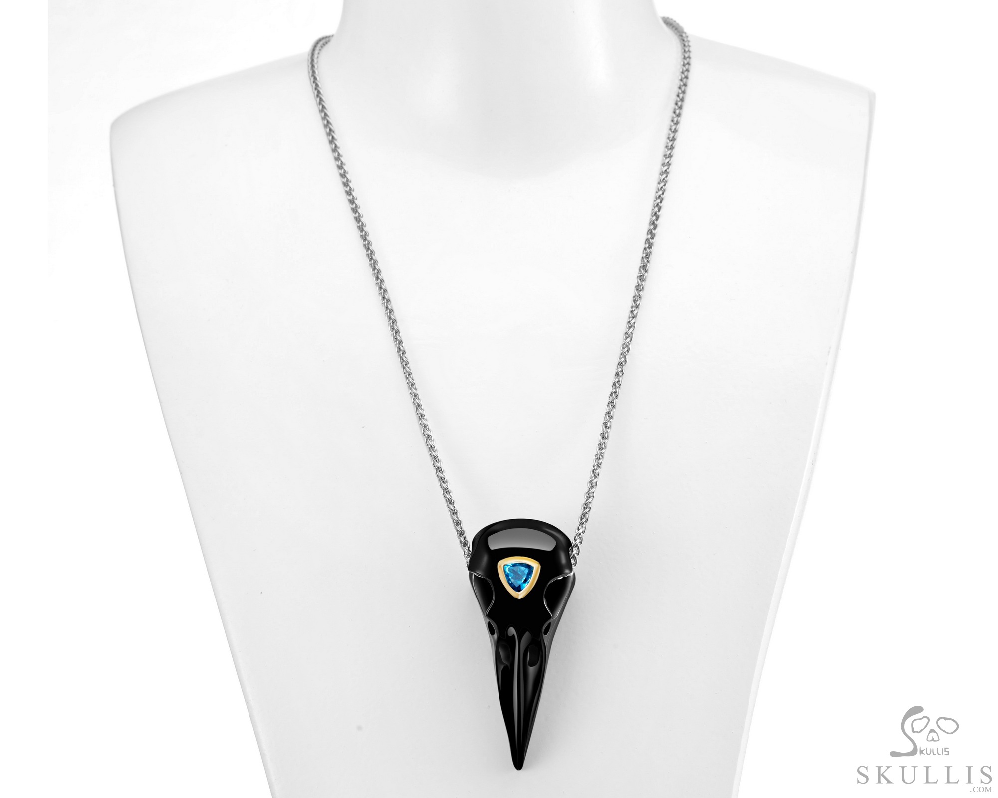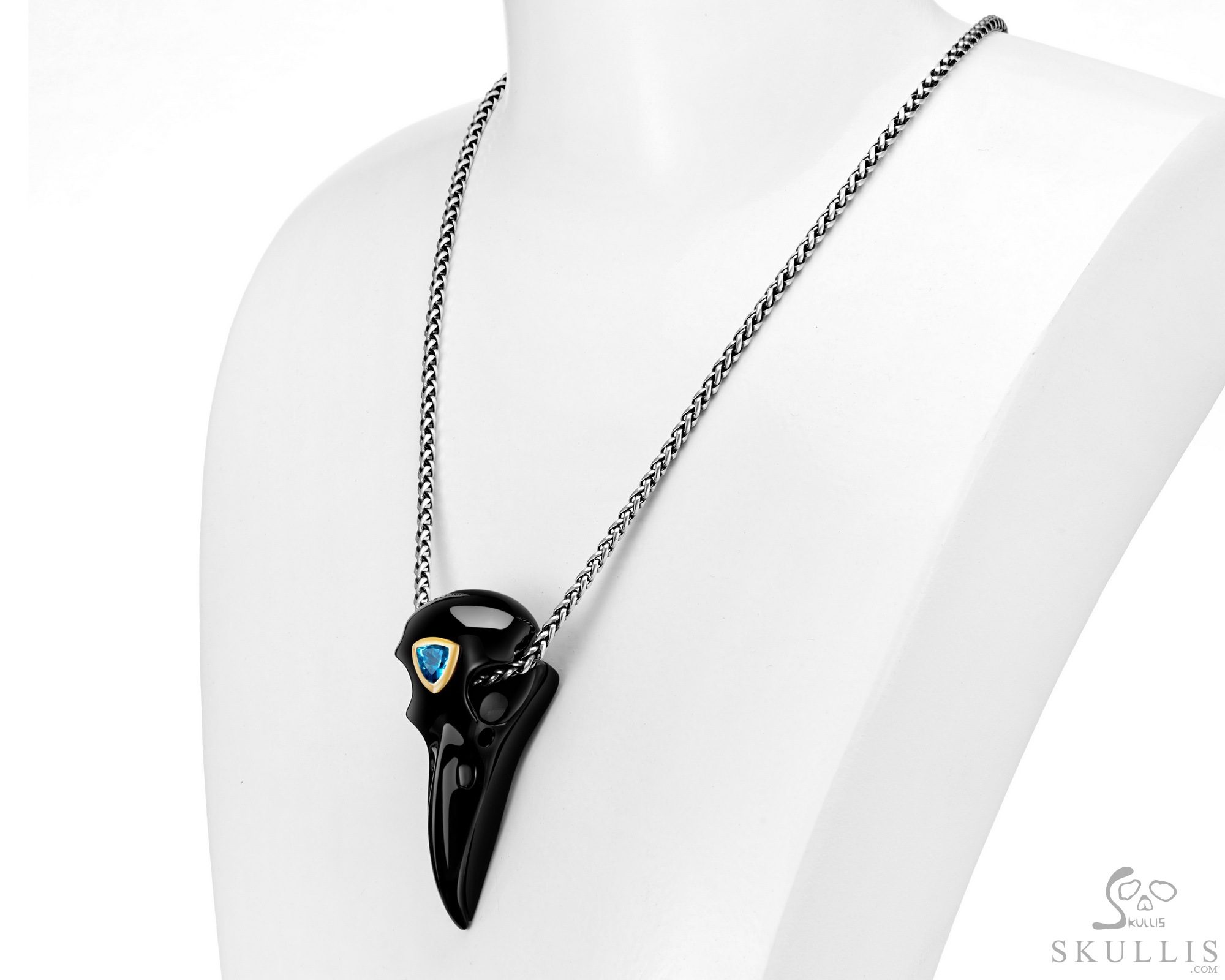 Necklace of Black Obsidian Carved Crystal Raven Skull Pendant with Blue Sky Topaz and 925 Sterling Silver Chain, Gold over Sterling Silver