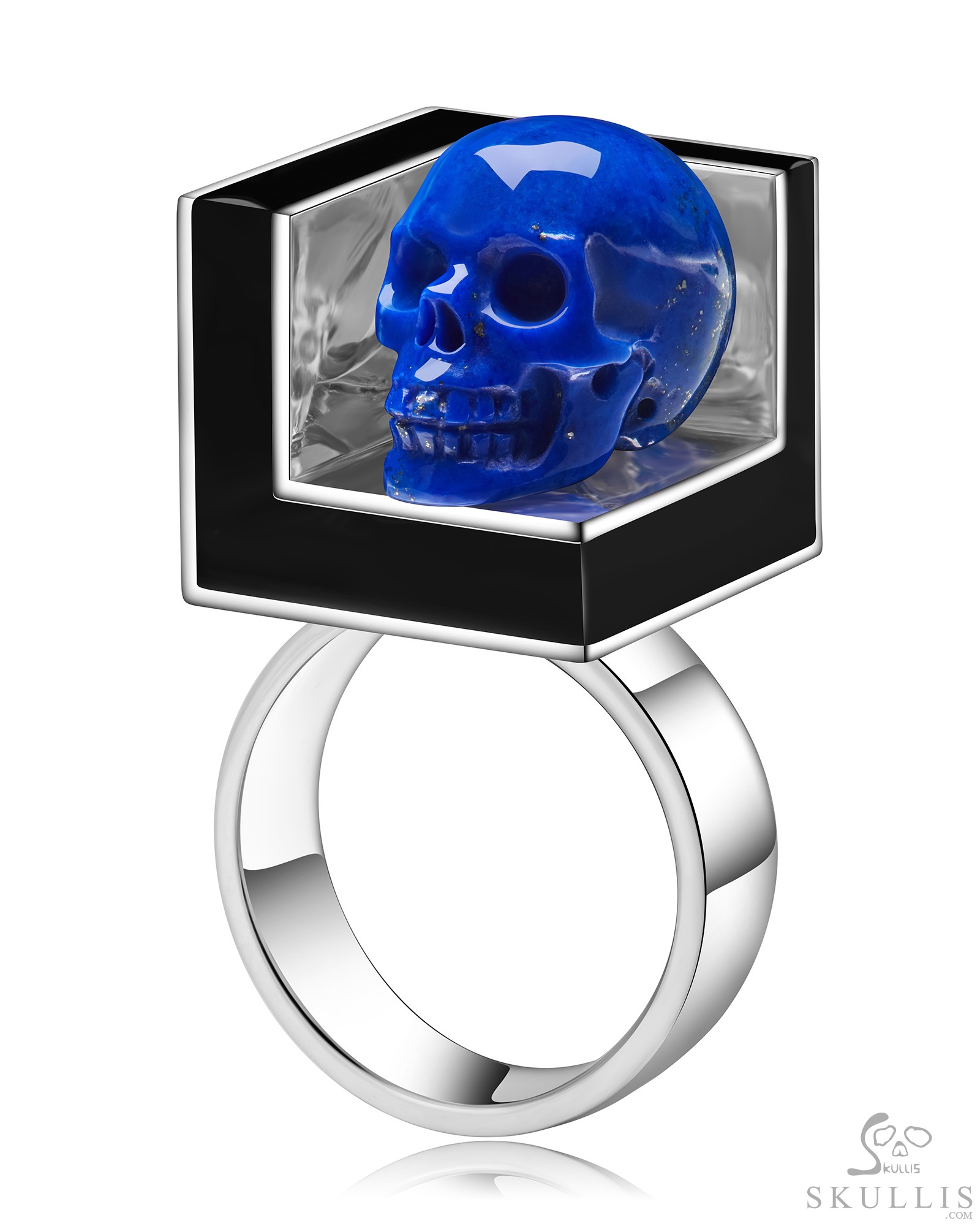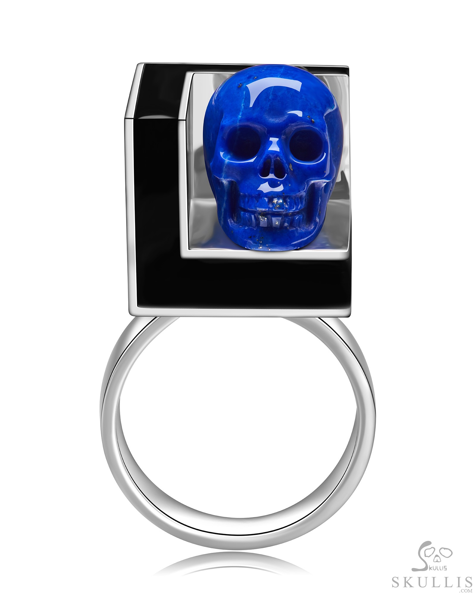 Gemstone Lapis Lazuli Hand Carved Crystal Skull Ring with Black Enamel, Skull Jewelry