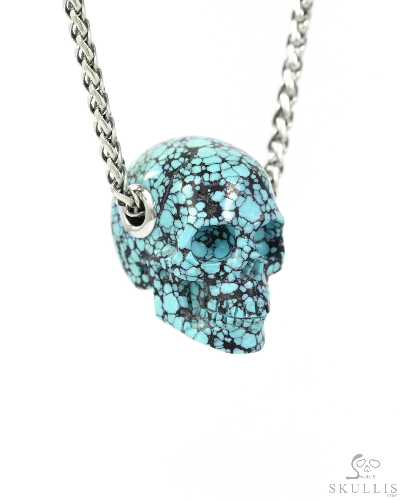 Gemstone Necklace of 1.1" Turquoise Hand Carved Crystal Skull Pendant, Skull Jewelry