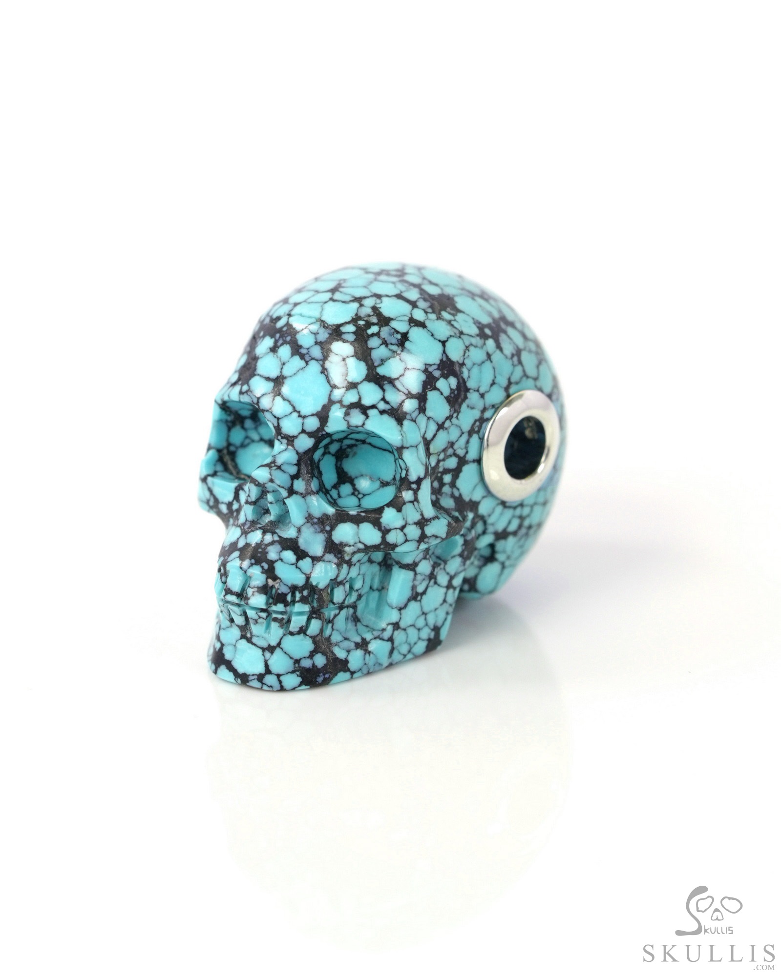 1.5" Turquoise Carved Crystal Skull Silver Disk Pendant, Crystal Healing