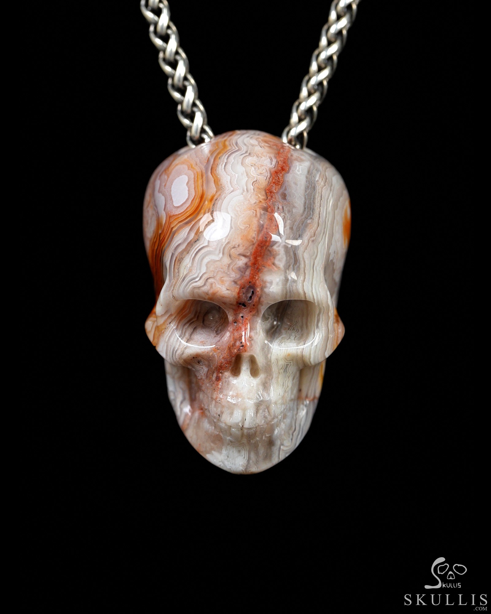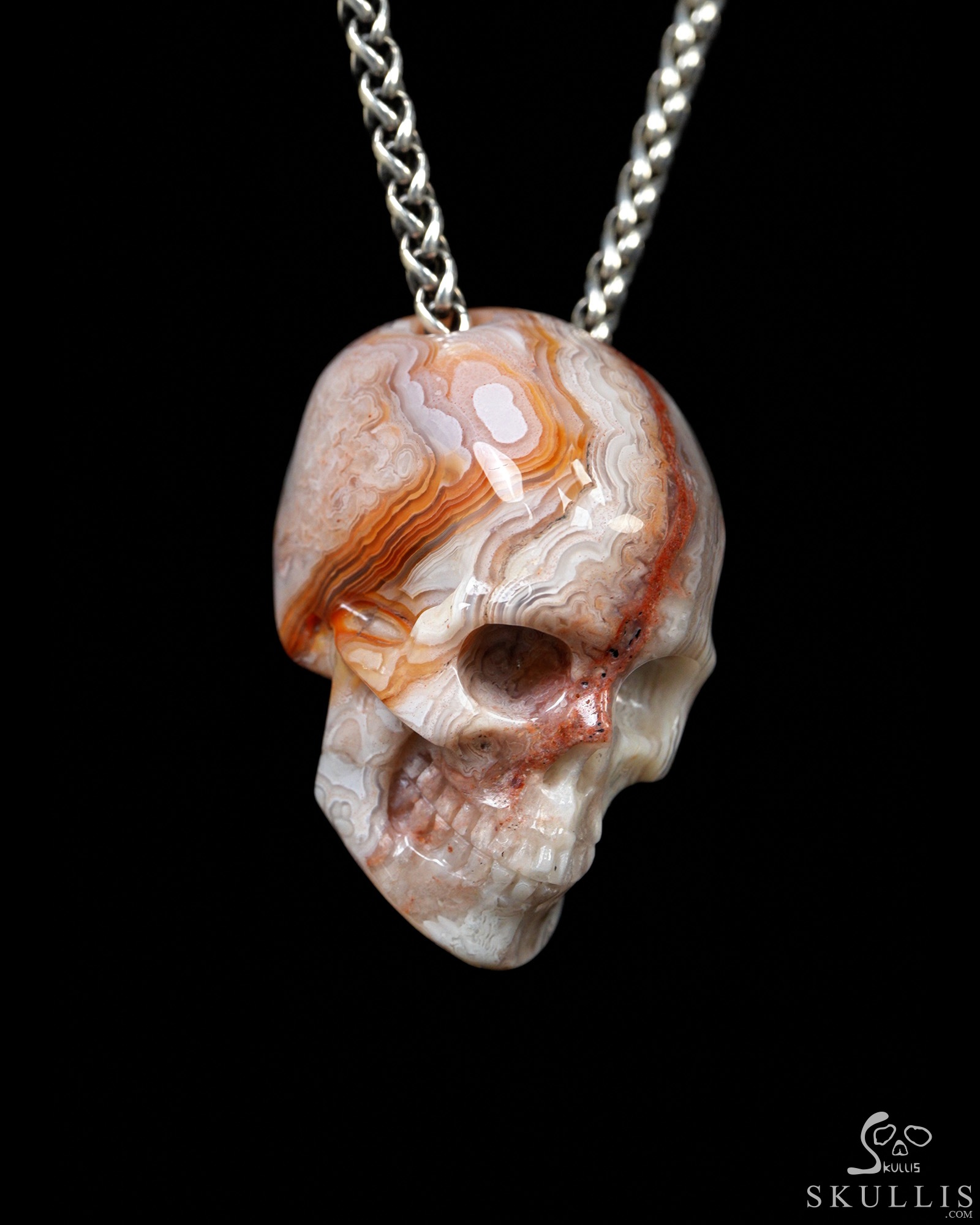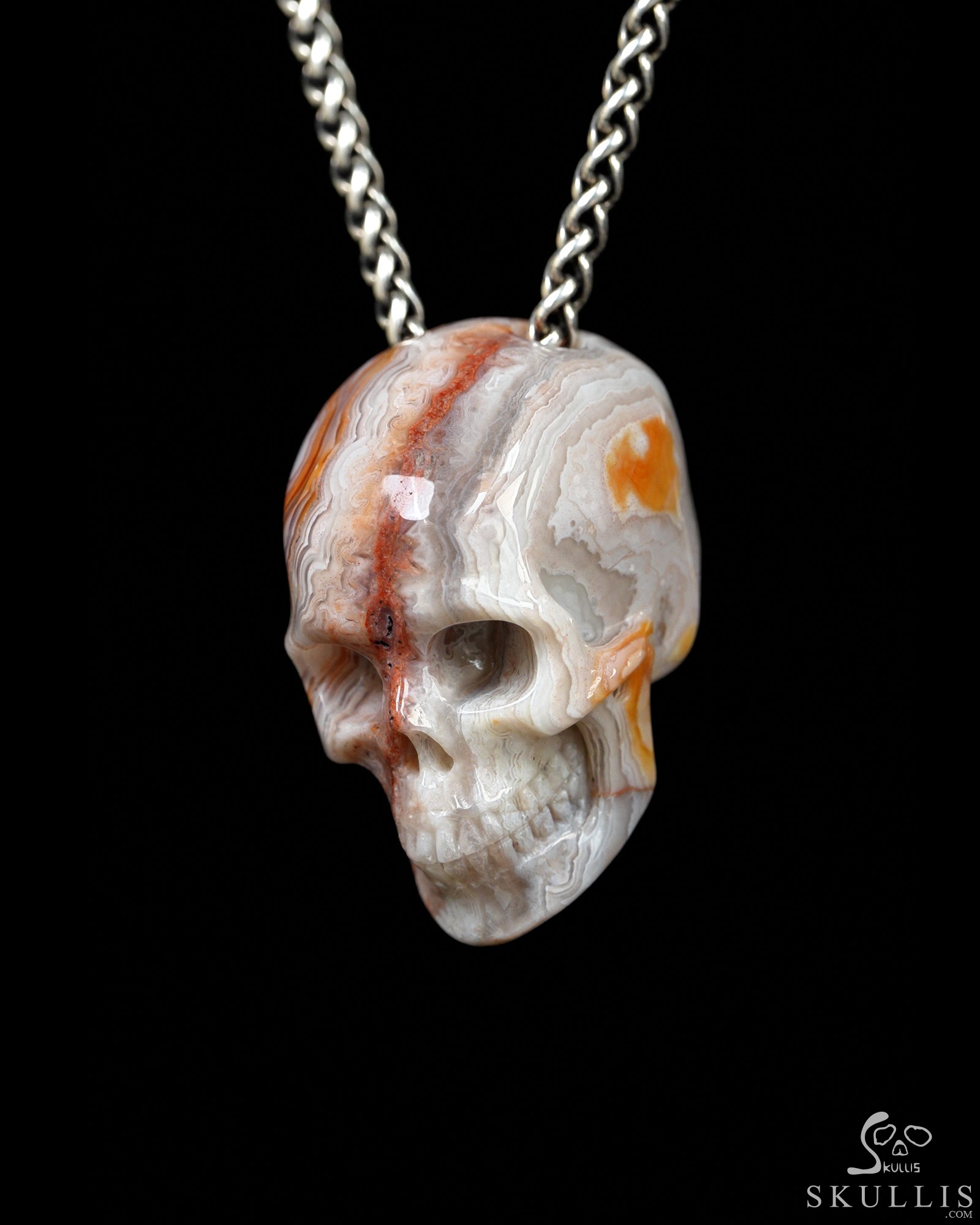 Gemstone Necklace of 2.3" Red Crazy Lace Agate Hand Carved Crystal Skull Pendant, Skull Jewelry