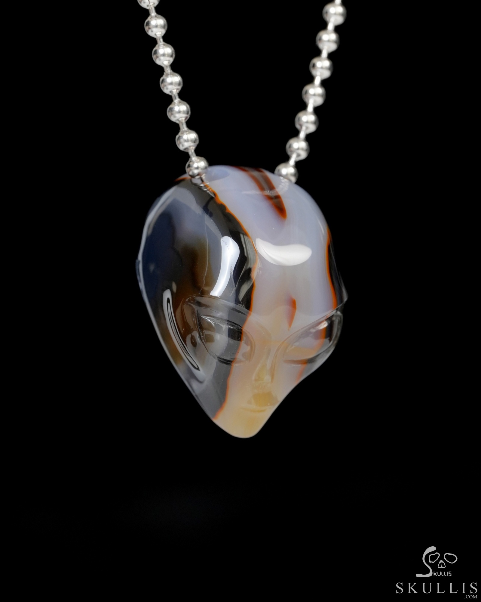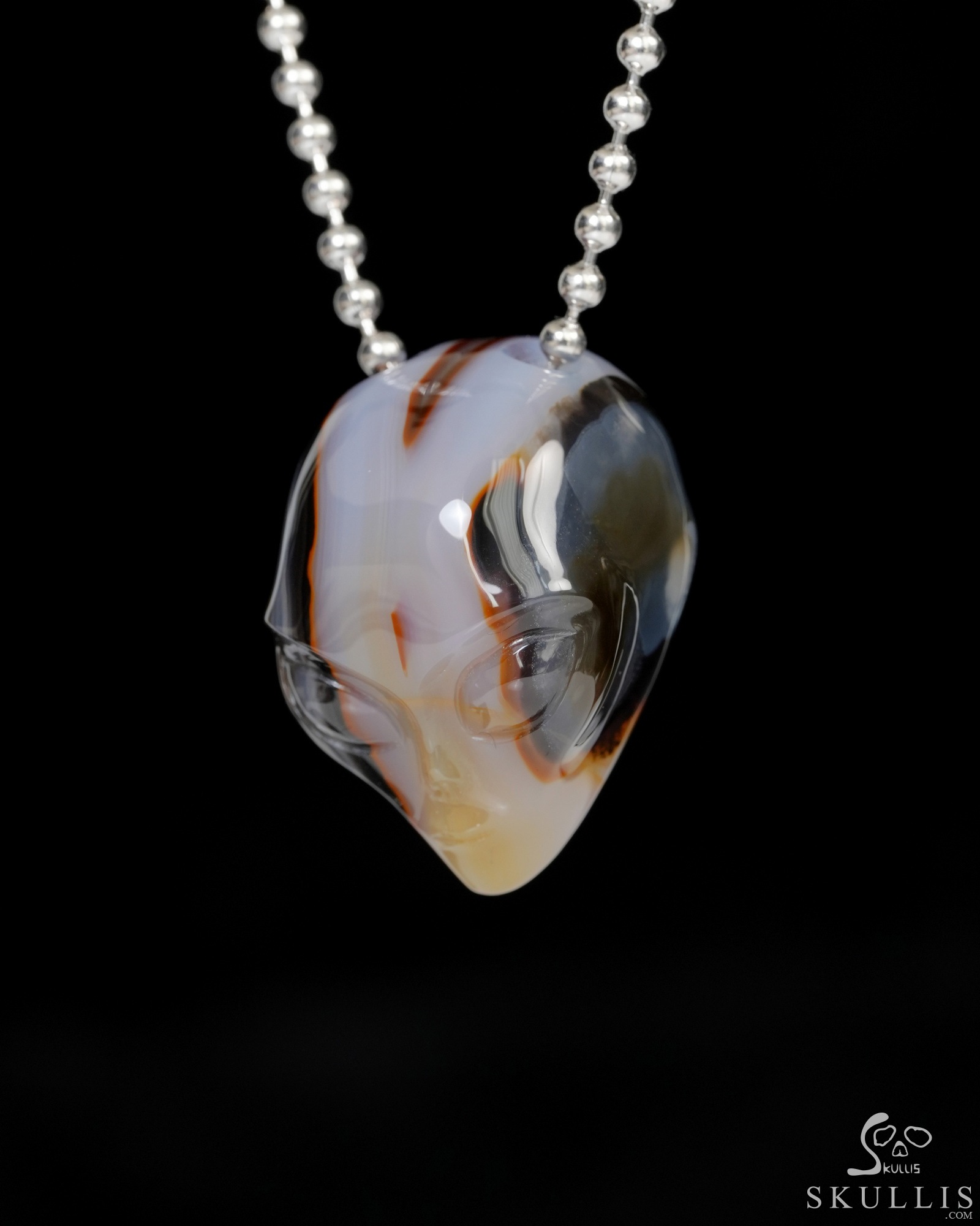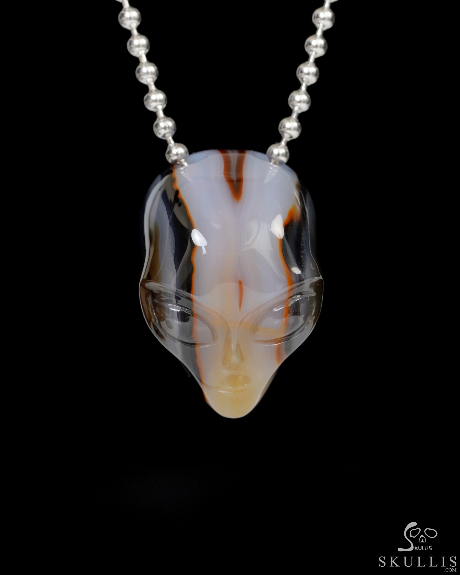 Hollow Essence - Necklace of 1.3" Agate Hand Carved Crystal Alien Pendant, Skull Jewelry
