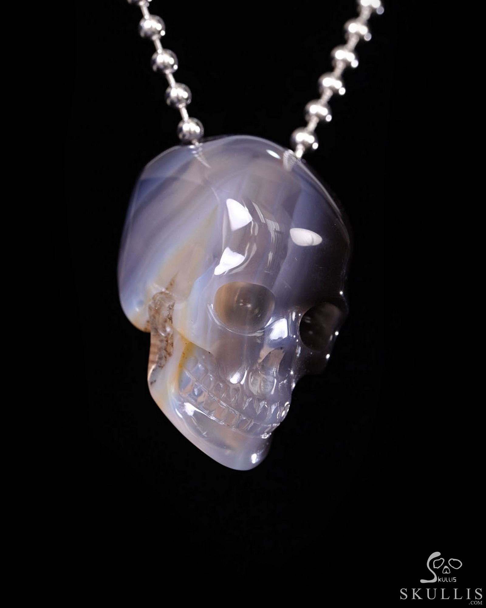 You are looking at a Agate skull pendant. The skull is 1.4 inches from front to back.