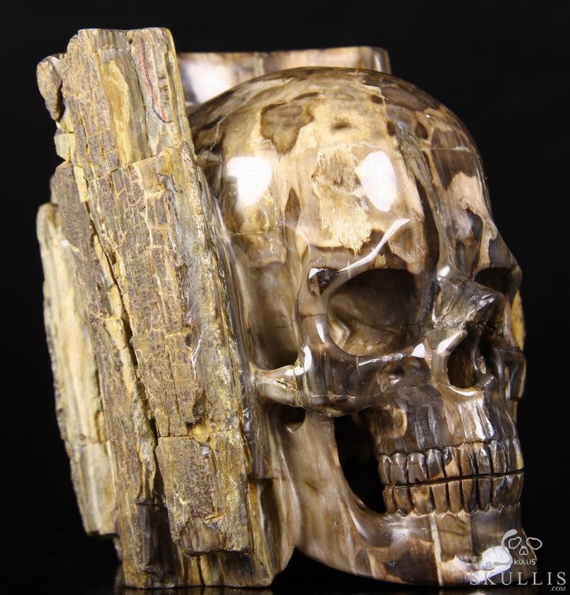 The skull is carved from a sole piece of Petrified Wood stone. You can see the clear texture of bark.