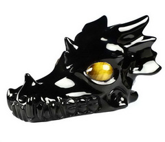 Huge 5.3" Black Obsidian Carved Crystal Dragon Skull, Tiger Eye Eyes, Crystal Healing