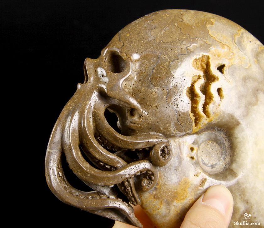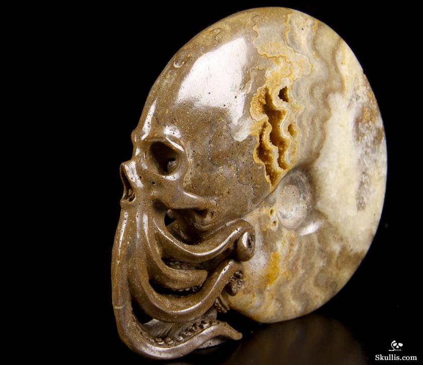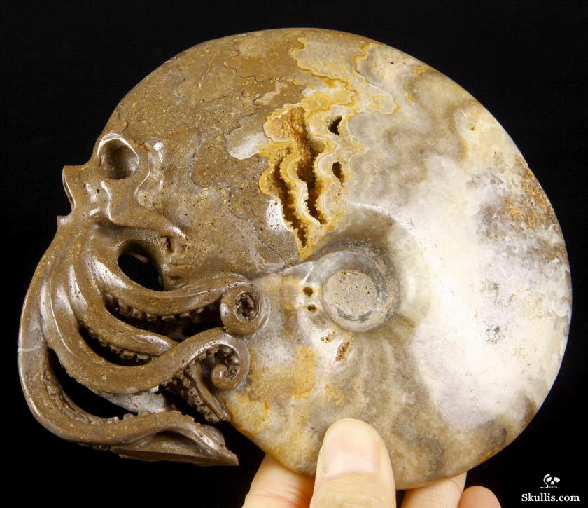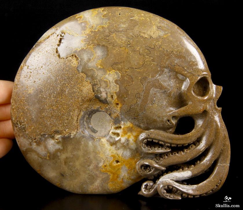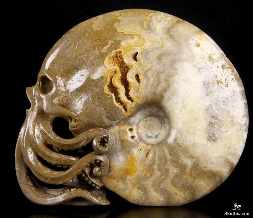 Huge 5.5" Chamber Ammonite Fossil Carved Crystal Skull & Octopus Sculpture