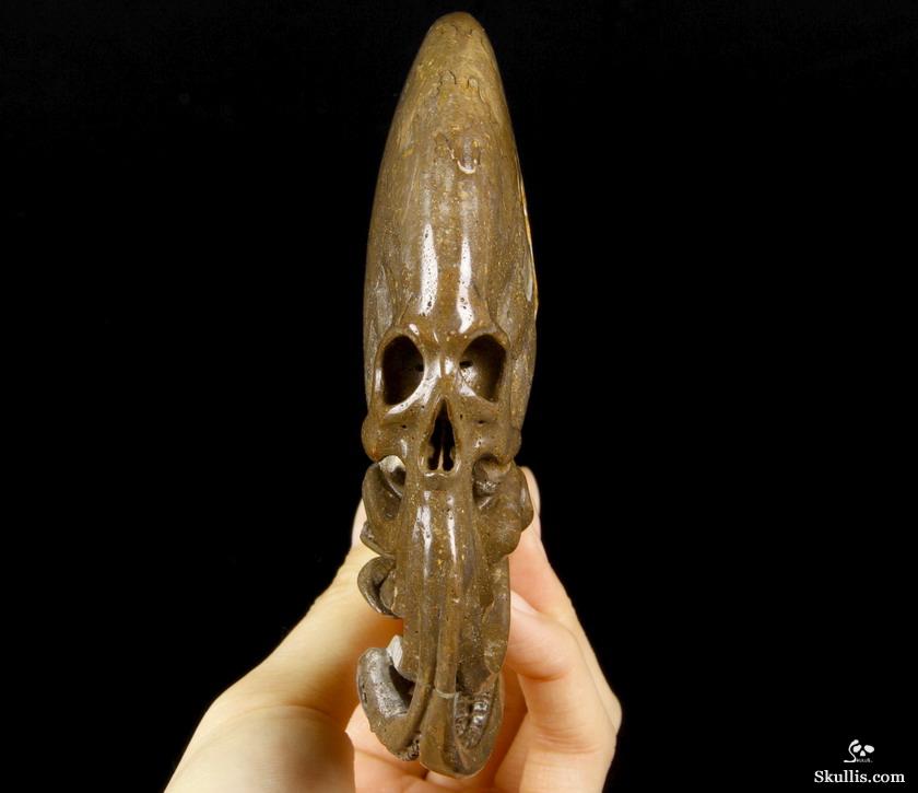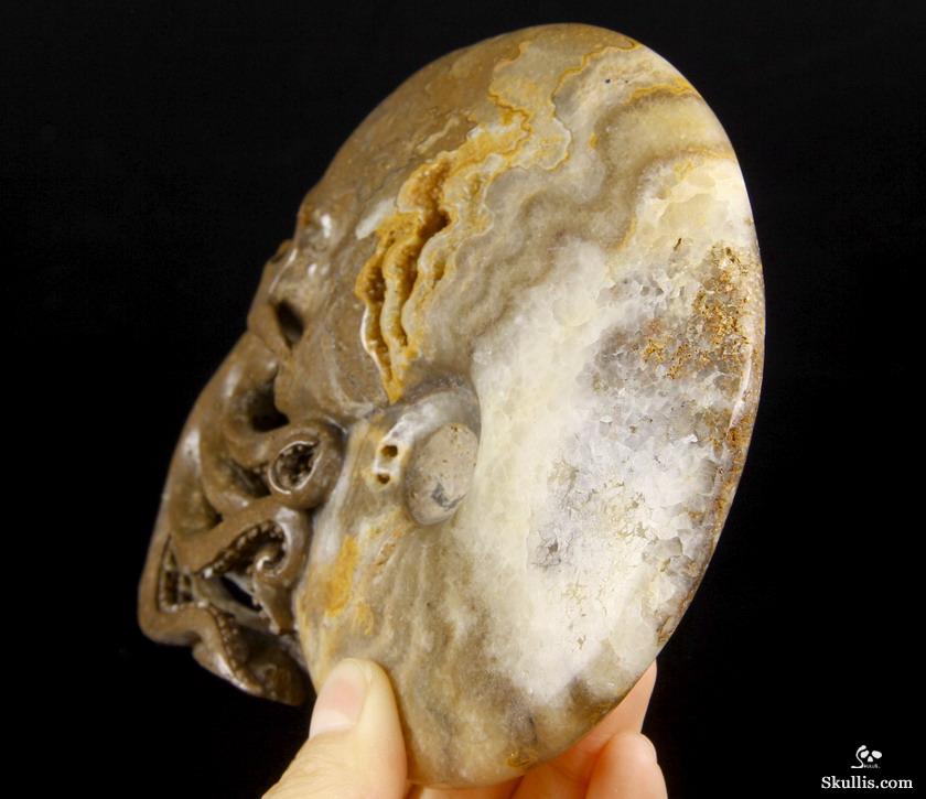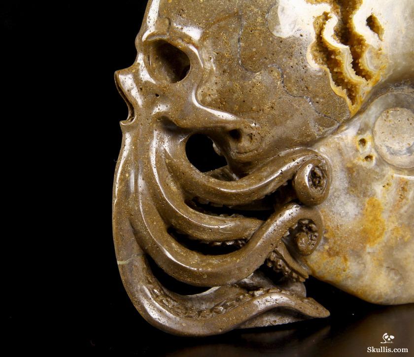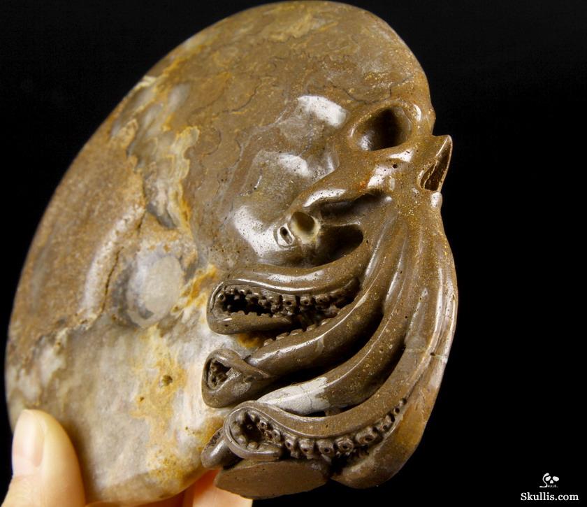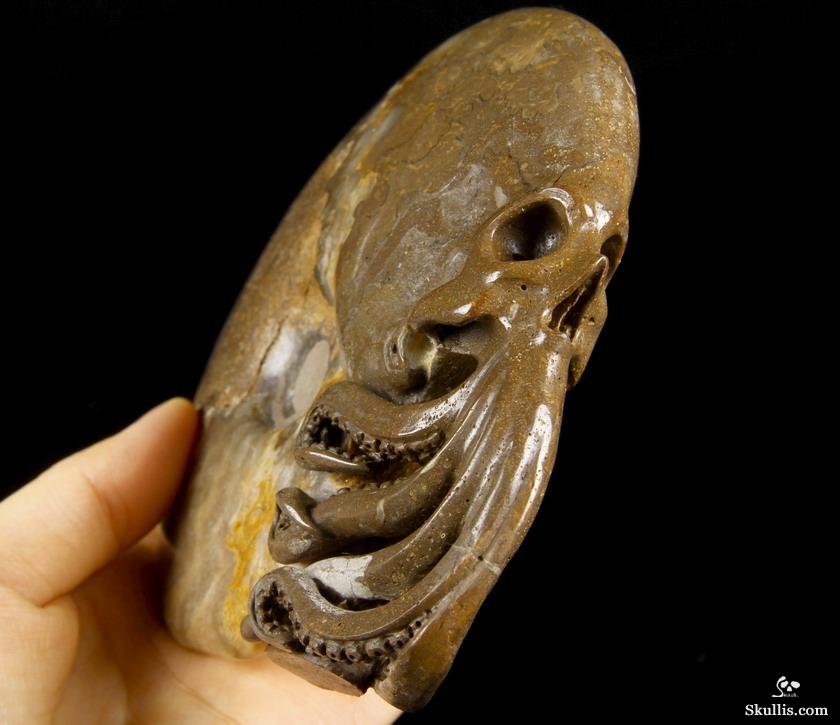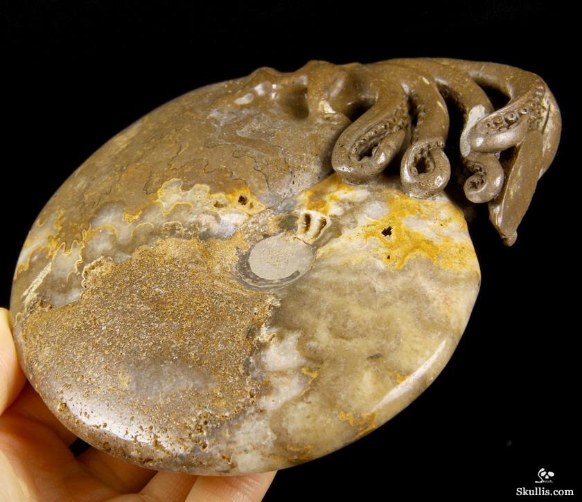 Huge 5.5" Chamber Ammonite Fossil Carved Crystal Skull & Octopus Sculpture