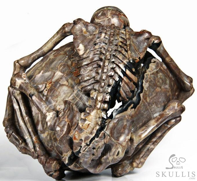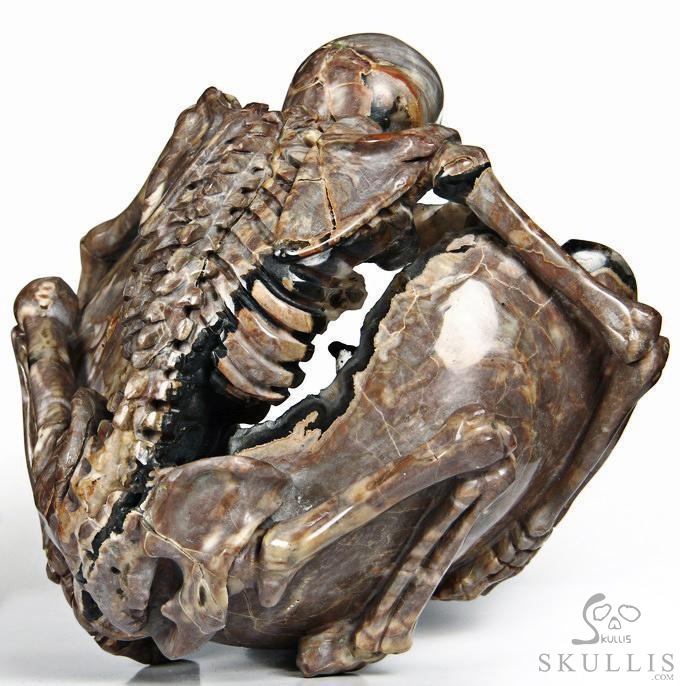 NOTE: Skullis does not prescribe treatment for medical issues. Skullis offers information for reference to assist with the selection and understanding of crystal skulls, including this dinosaur egg agate with geode crystal skull and skeleton sculpture.