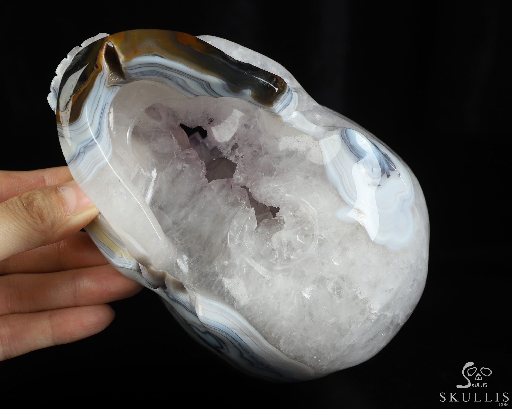 Lifesized 6.0" Agate Amethyst Geode Hand Carved Crystal Skull, Super Realistic, Crystal Healing