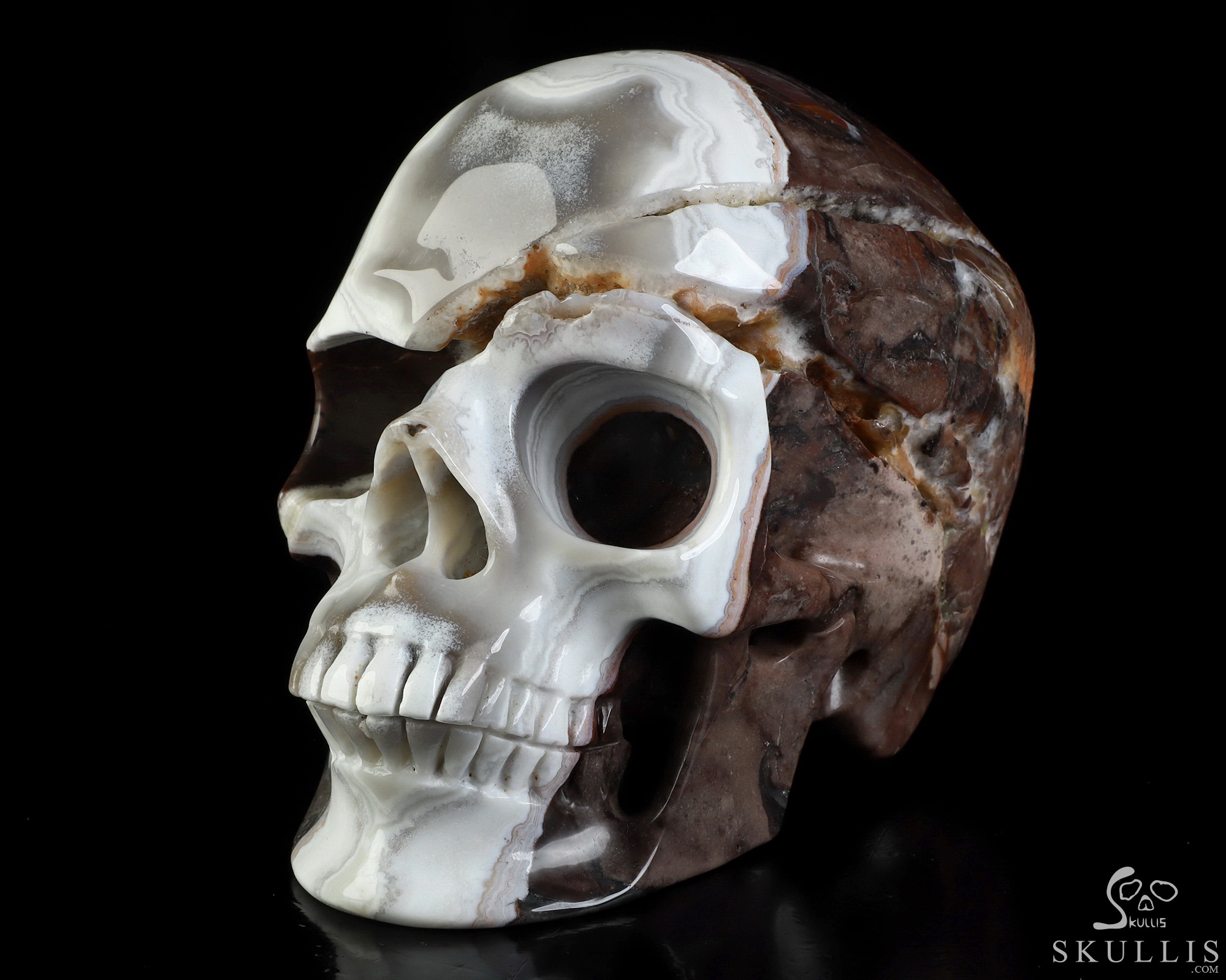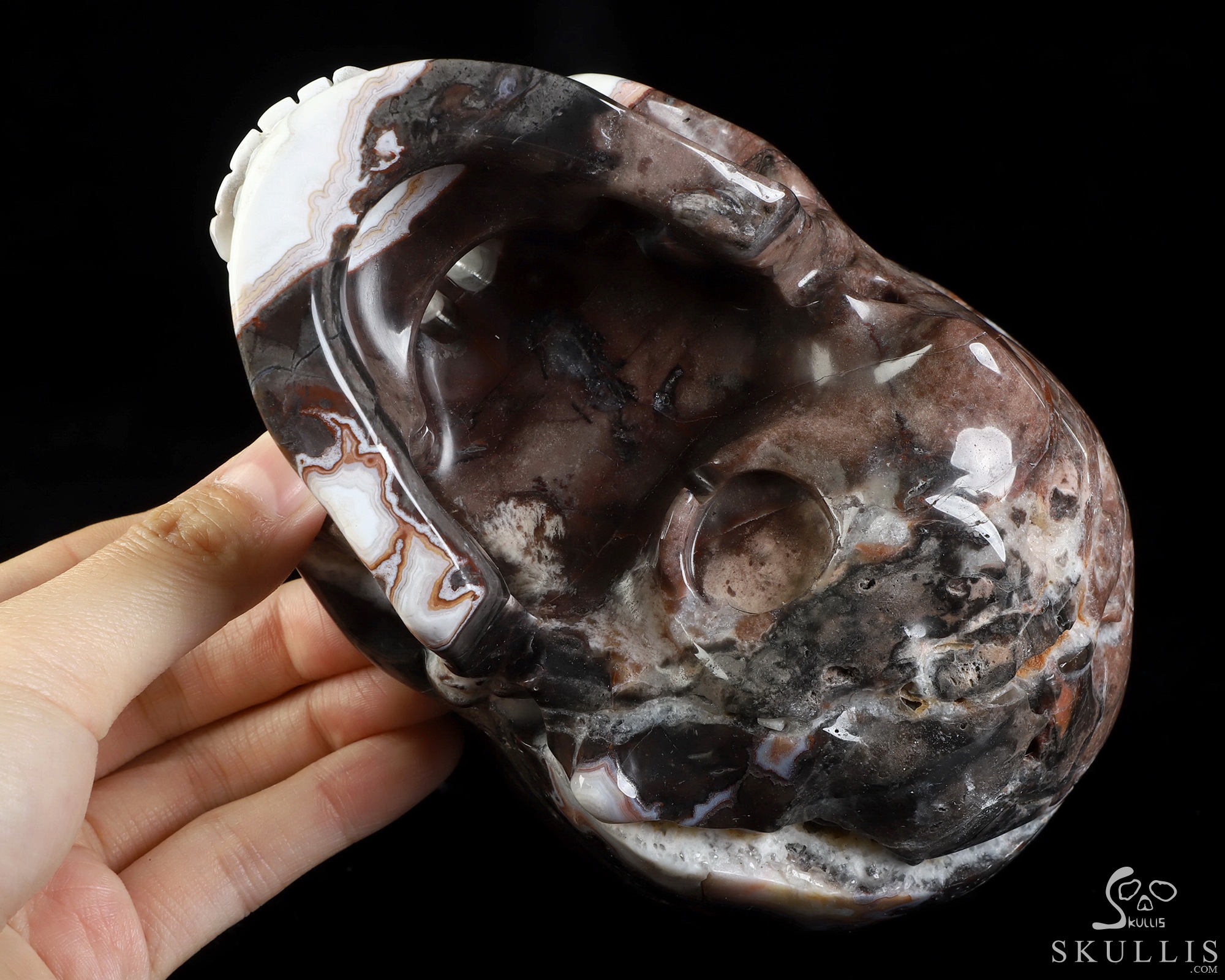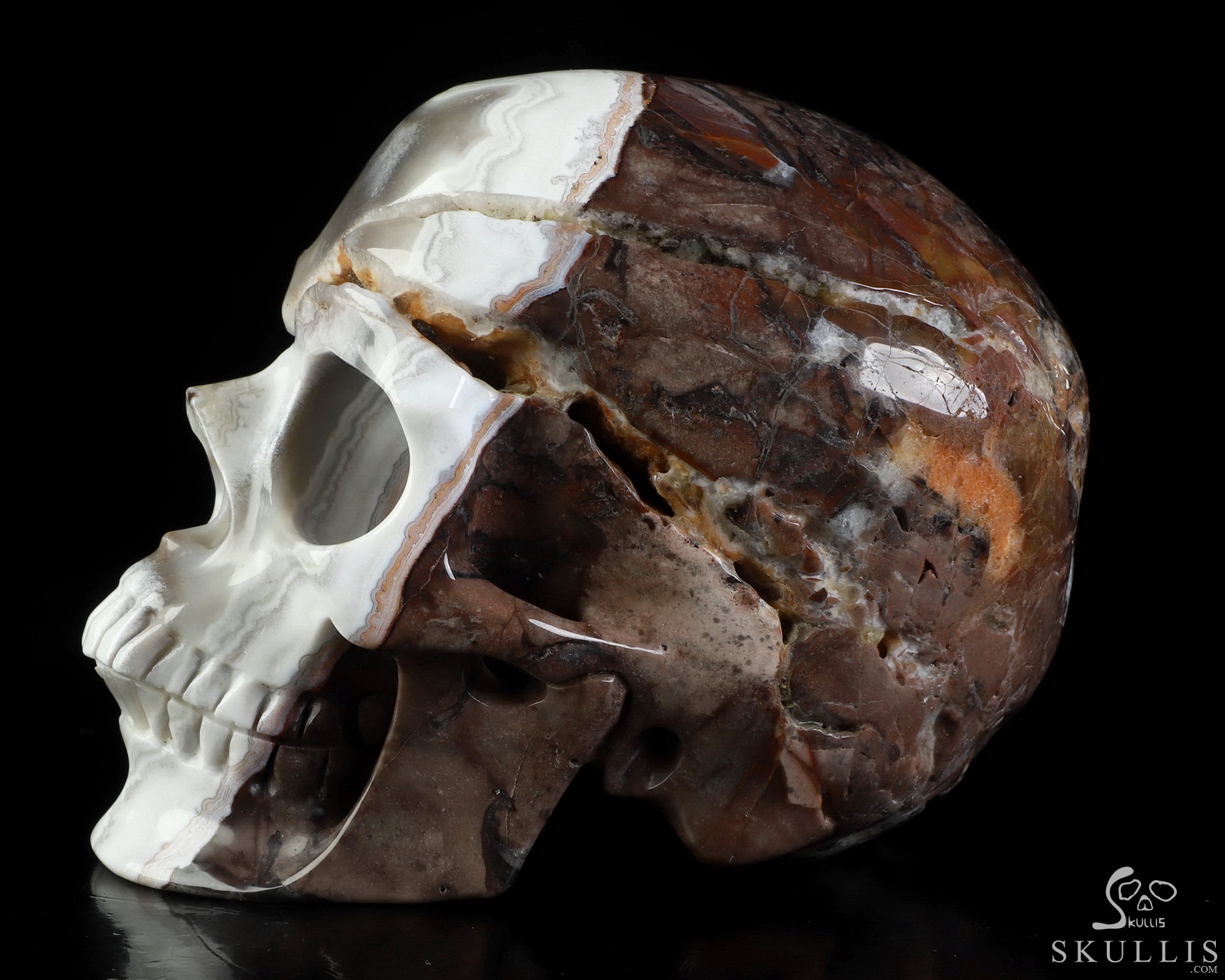 You are looking at a Red Crazy Lace Agate skull. The skull is 6 inches from front to back.