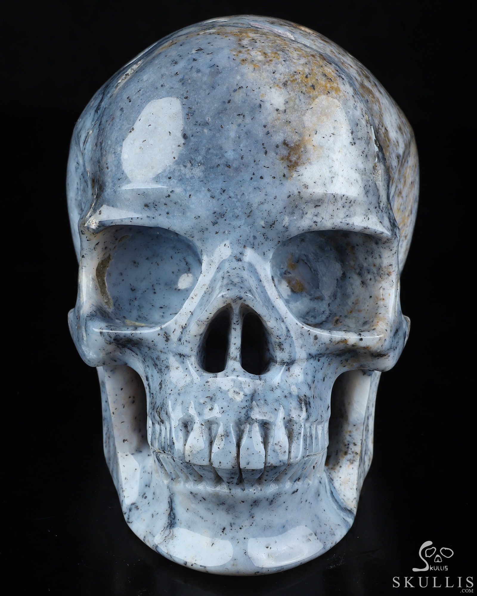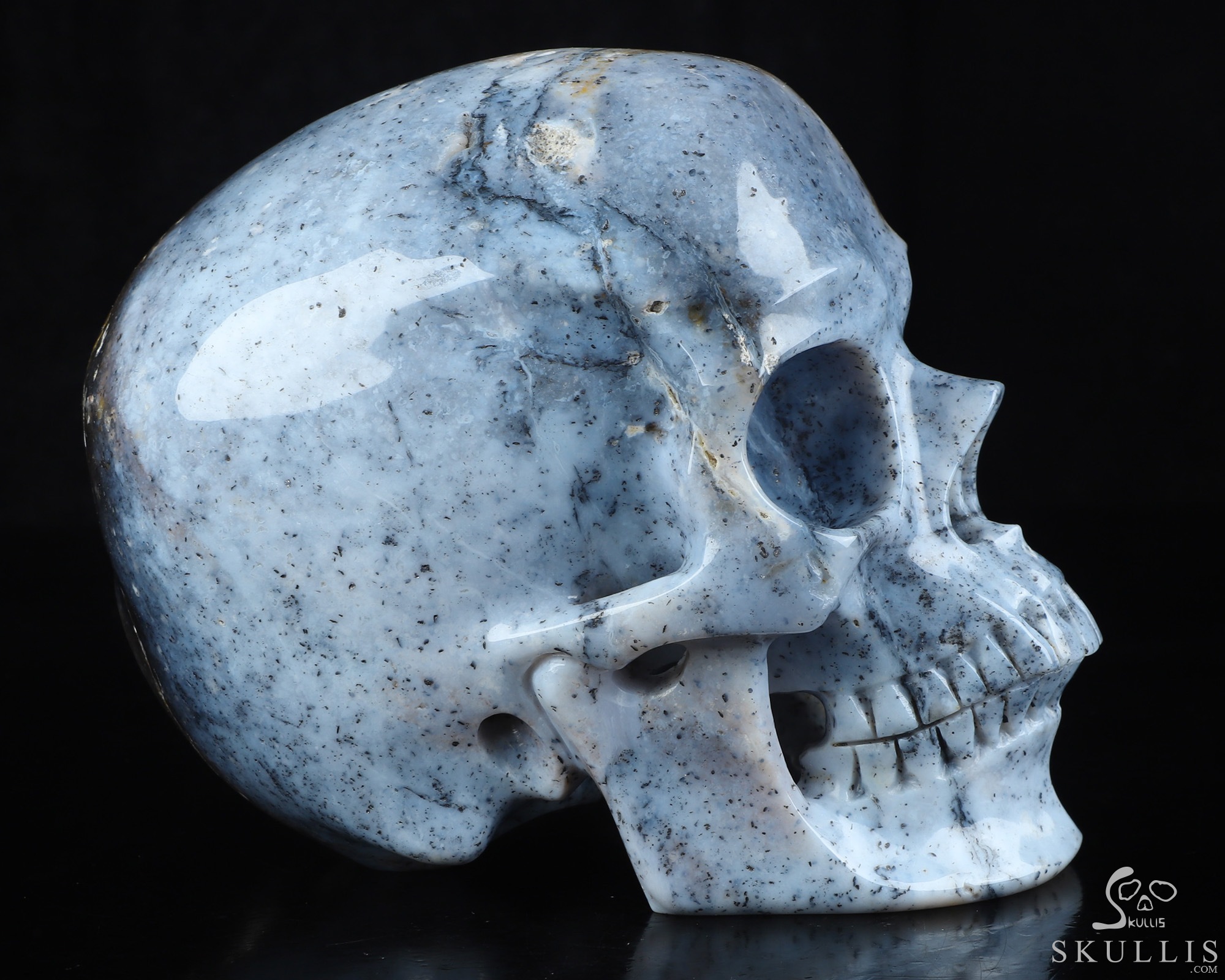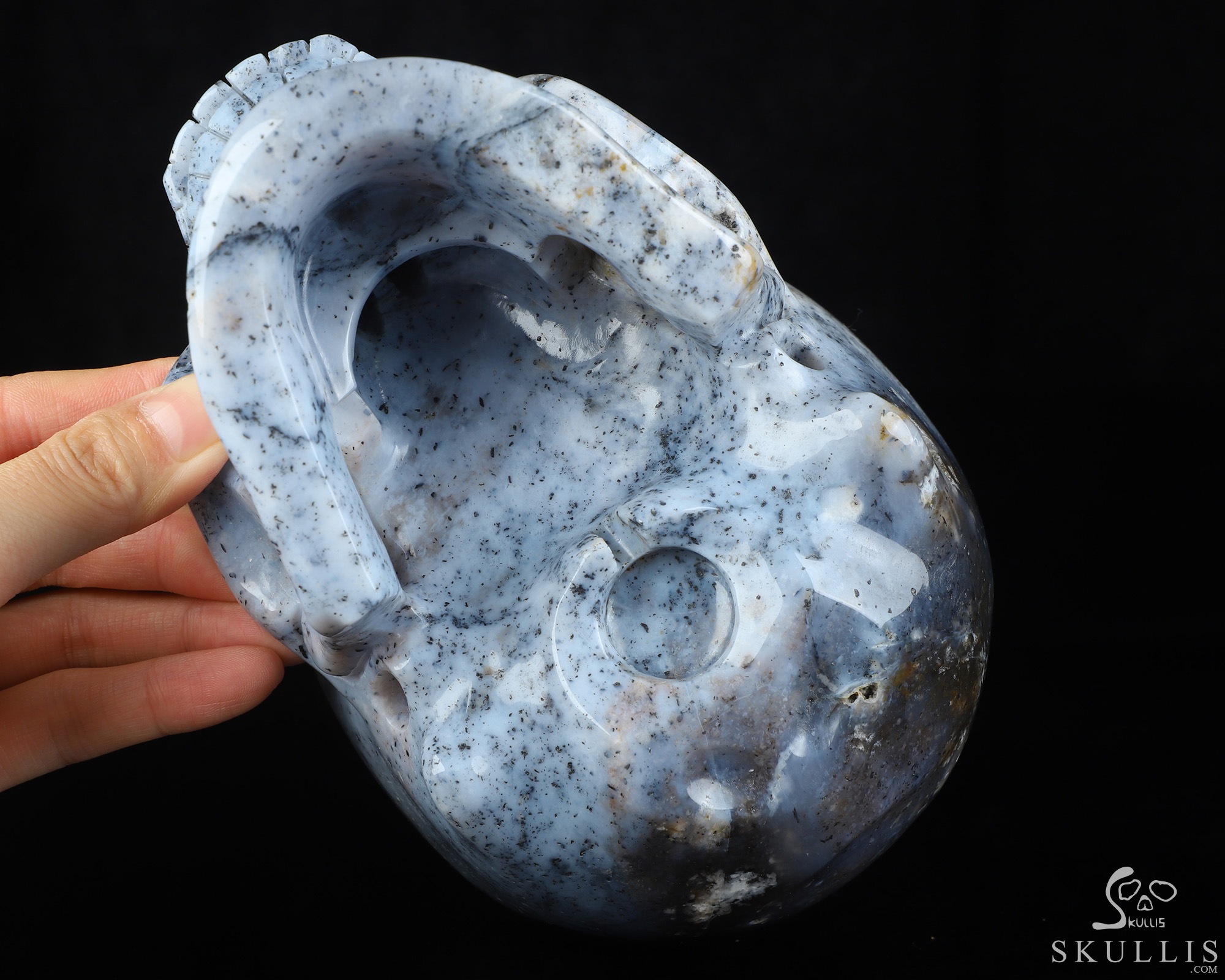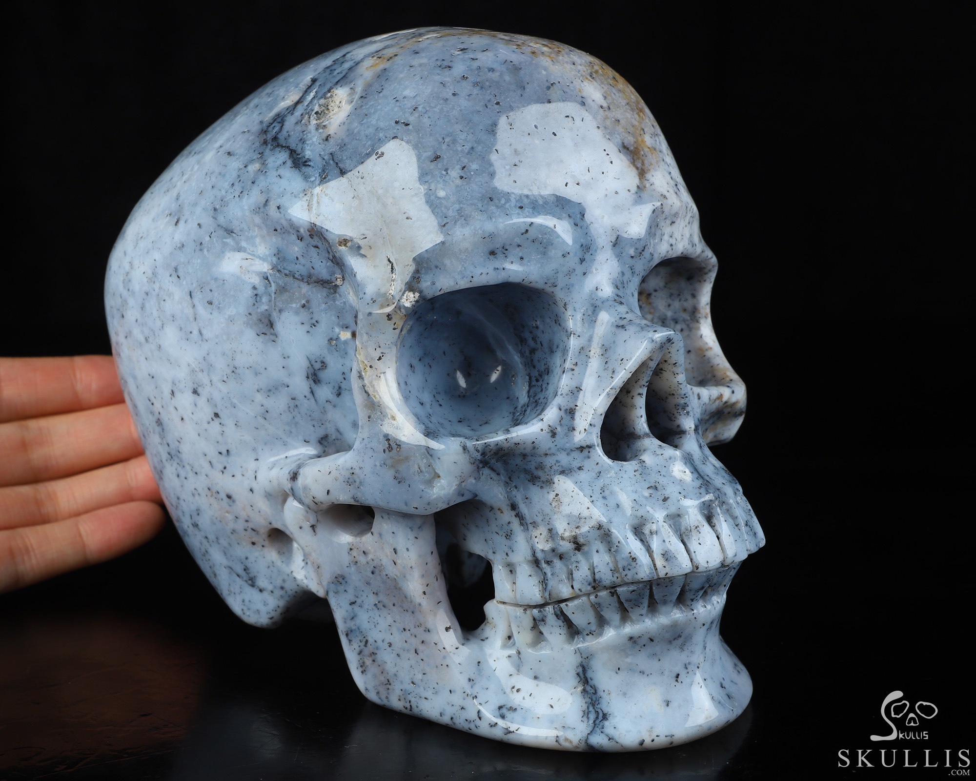 You are looking at a Flower Agate skull. The skull is 6.9 inches from front to back.