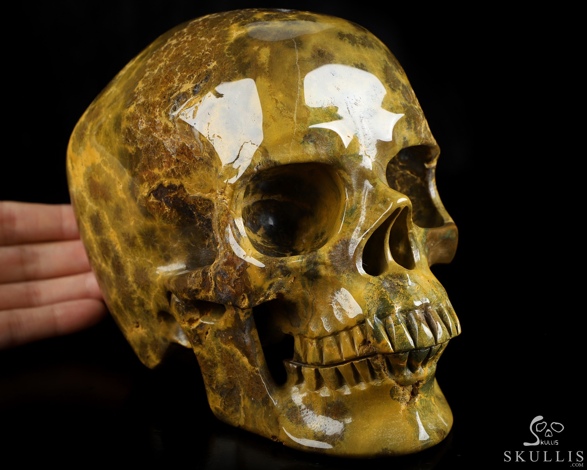 The Thinker---4.1" Ocean Jasper Hand Carved Crystal Skull & Skeletal Hand Sculpture, Crystal Healing