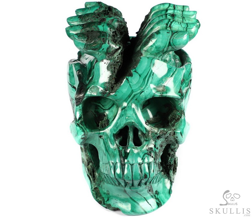 Gemstone 5.0" Malachite Hand Carved Crystal Dragon Skull Sculpture, Crystal Healing