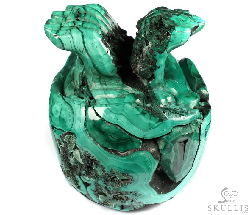 Gemstone 5.8" Malachite Hand Carved Crystal Skull Fine Art Sculpture, Crystal Healing