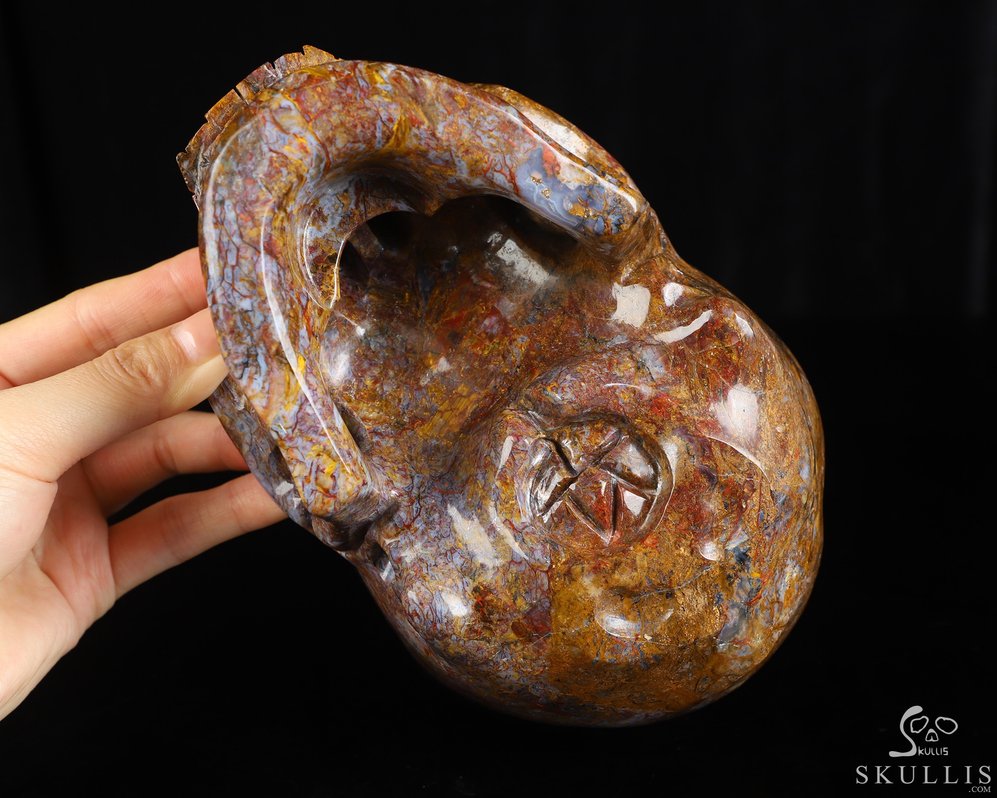 You are looking at a Pietersite skull. The skull is 7.4 inches from front to back.