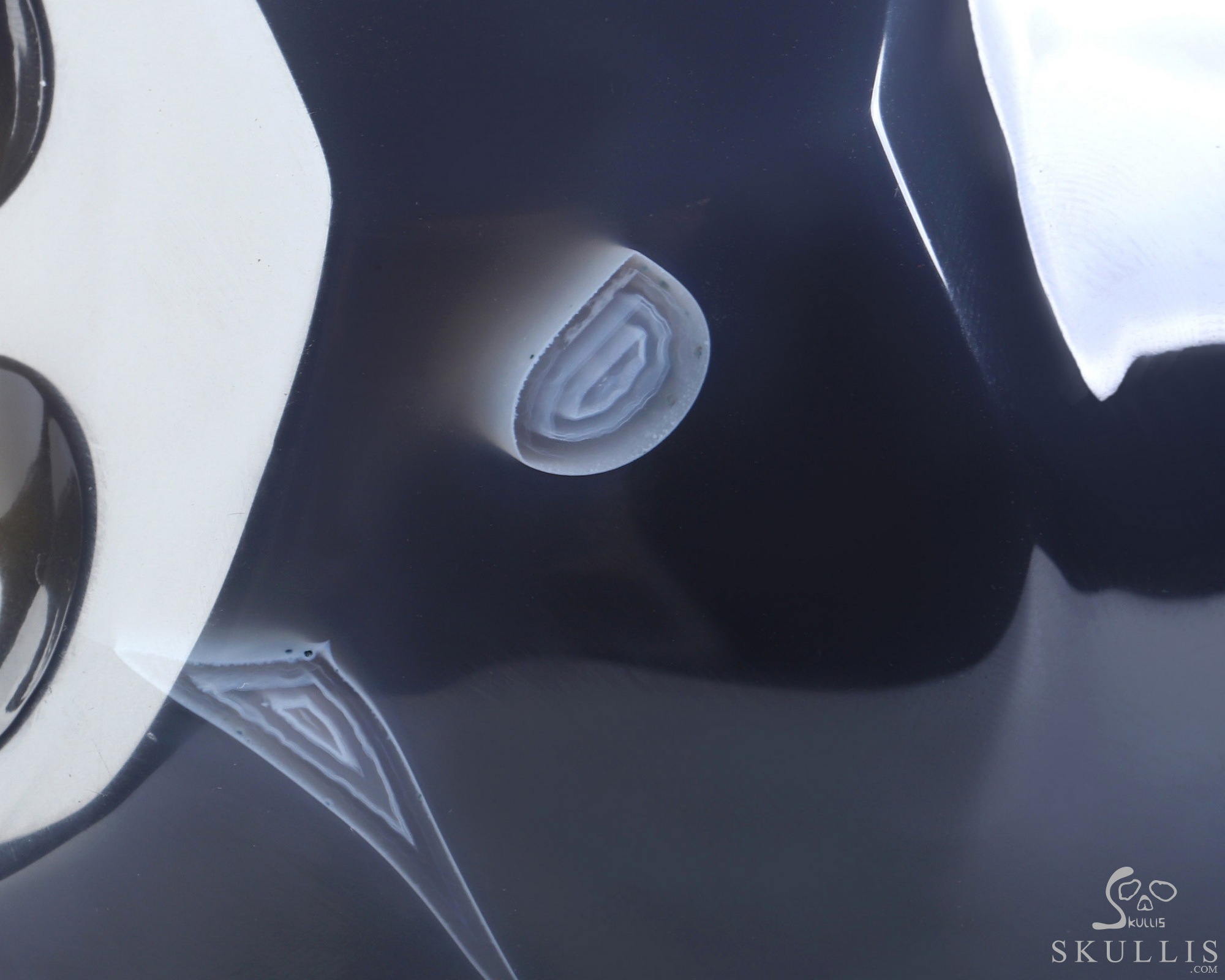You are looking at a Amethyst & Agate skull. The skull is 8.1 inches from front to back.