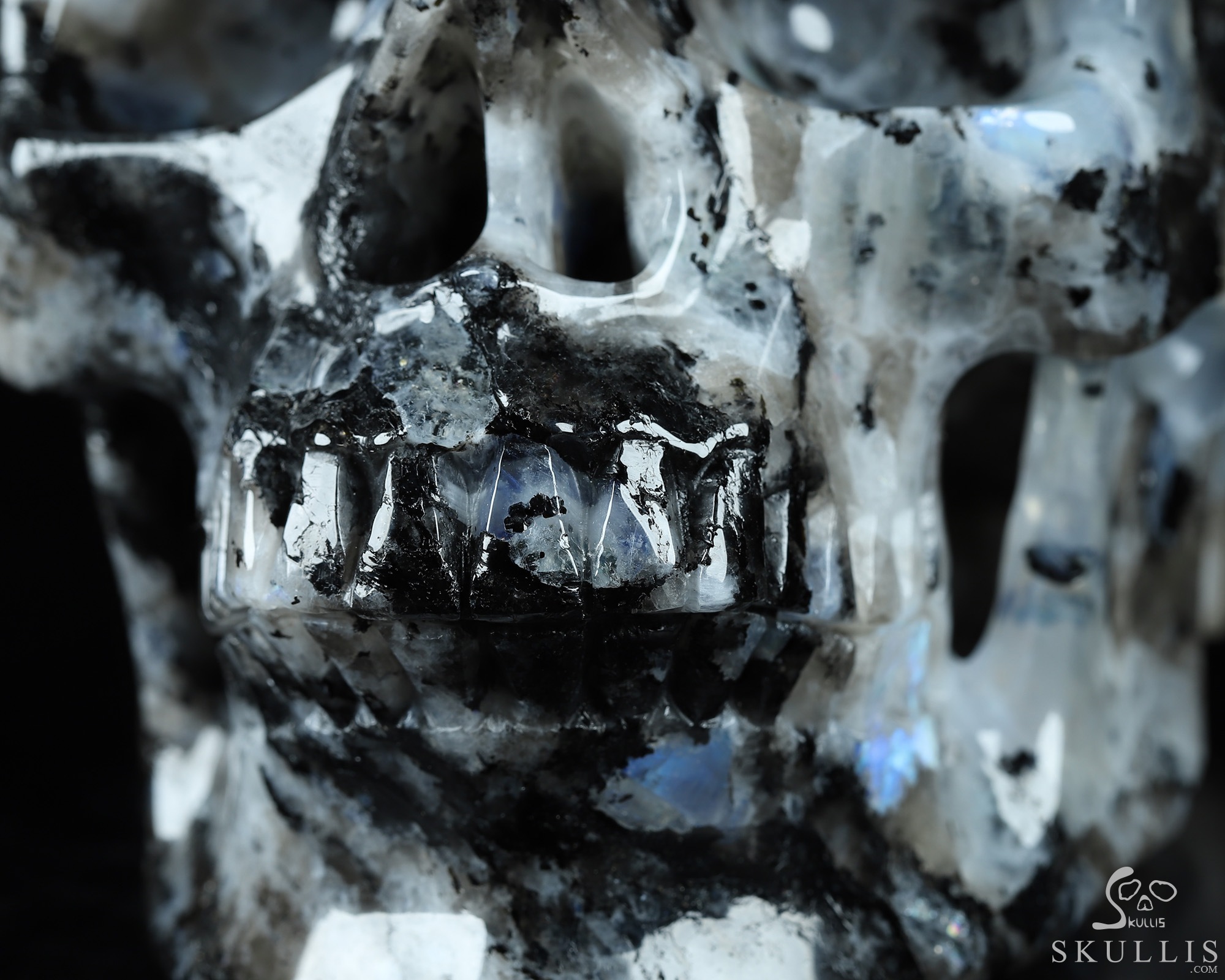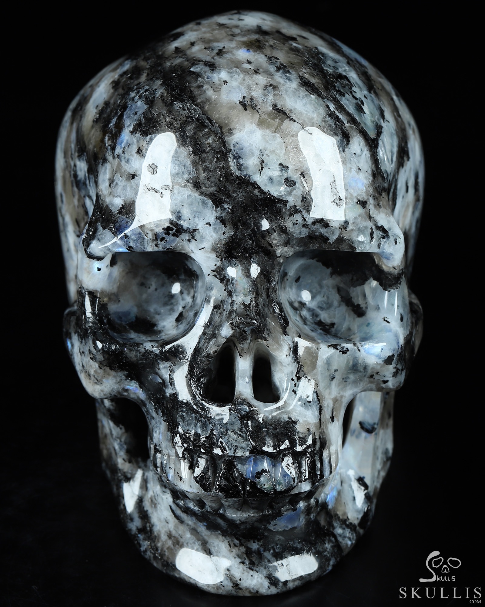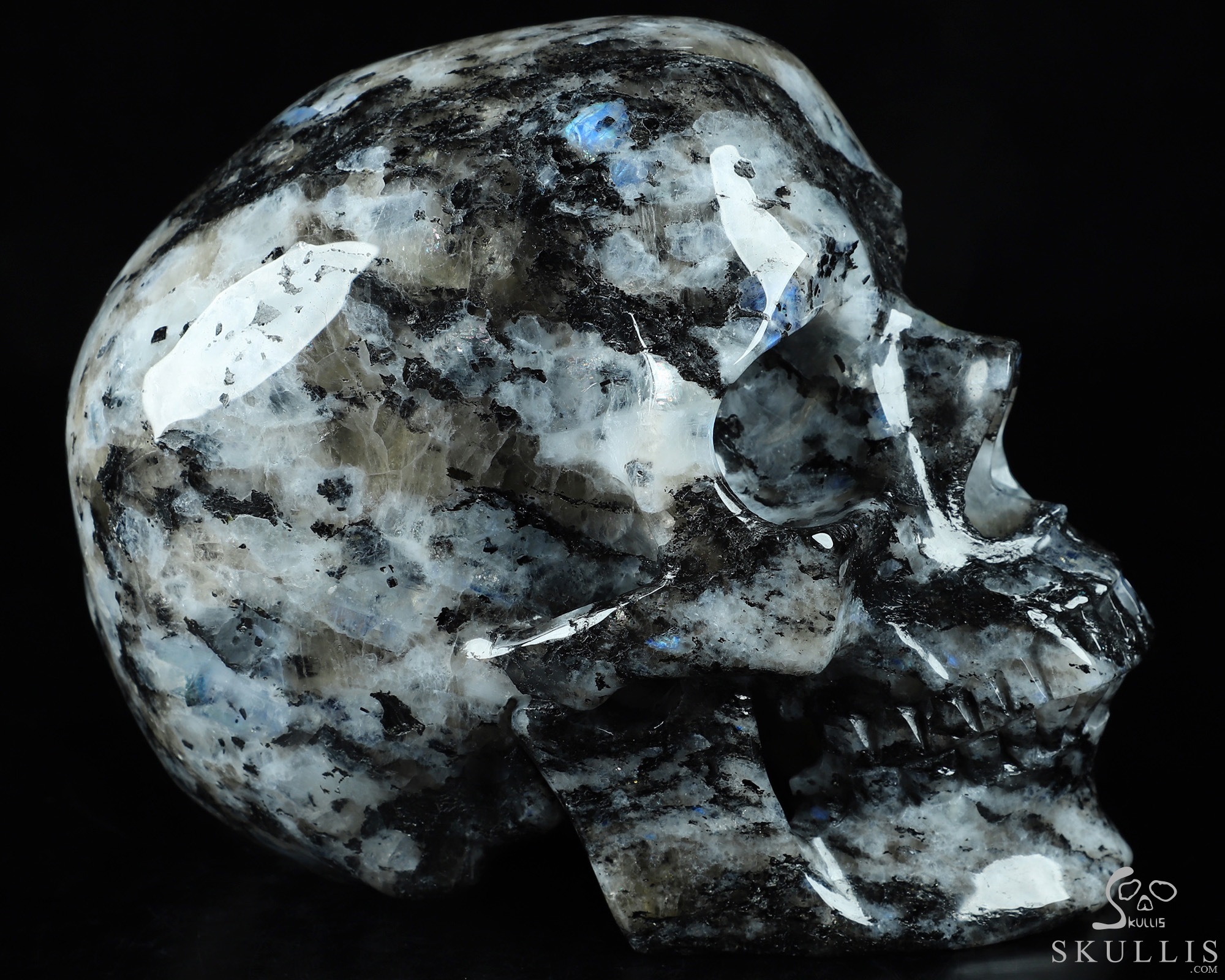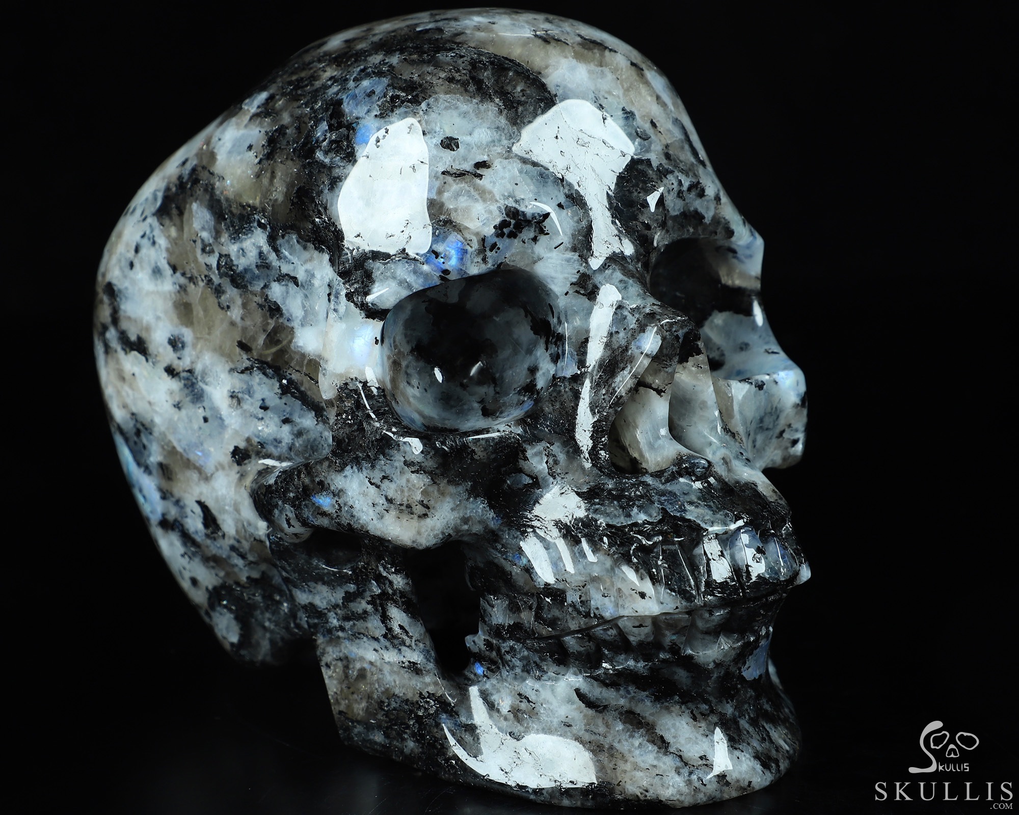 Lifesized Gemstone 6.7" Black Tourmaline and Moonstone Carved Crystal Skull,Super Realistic, Crystal Healing