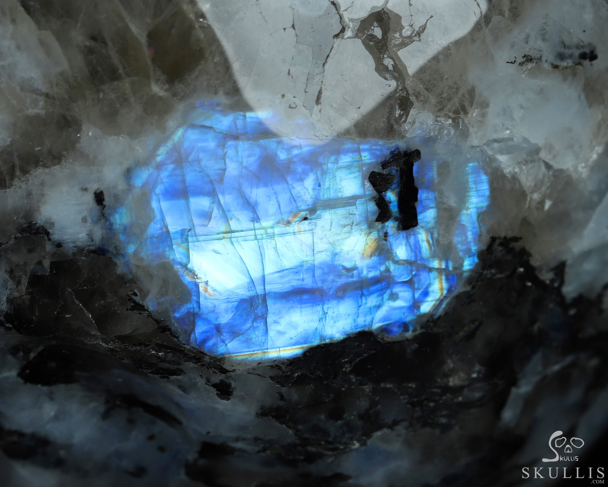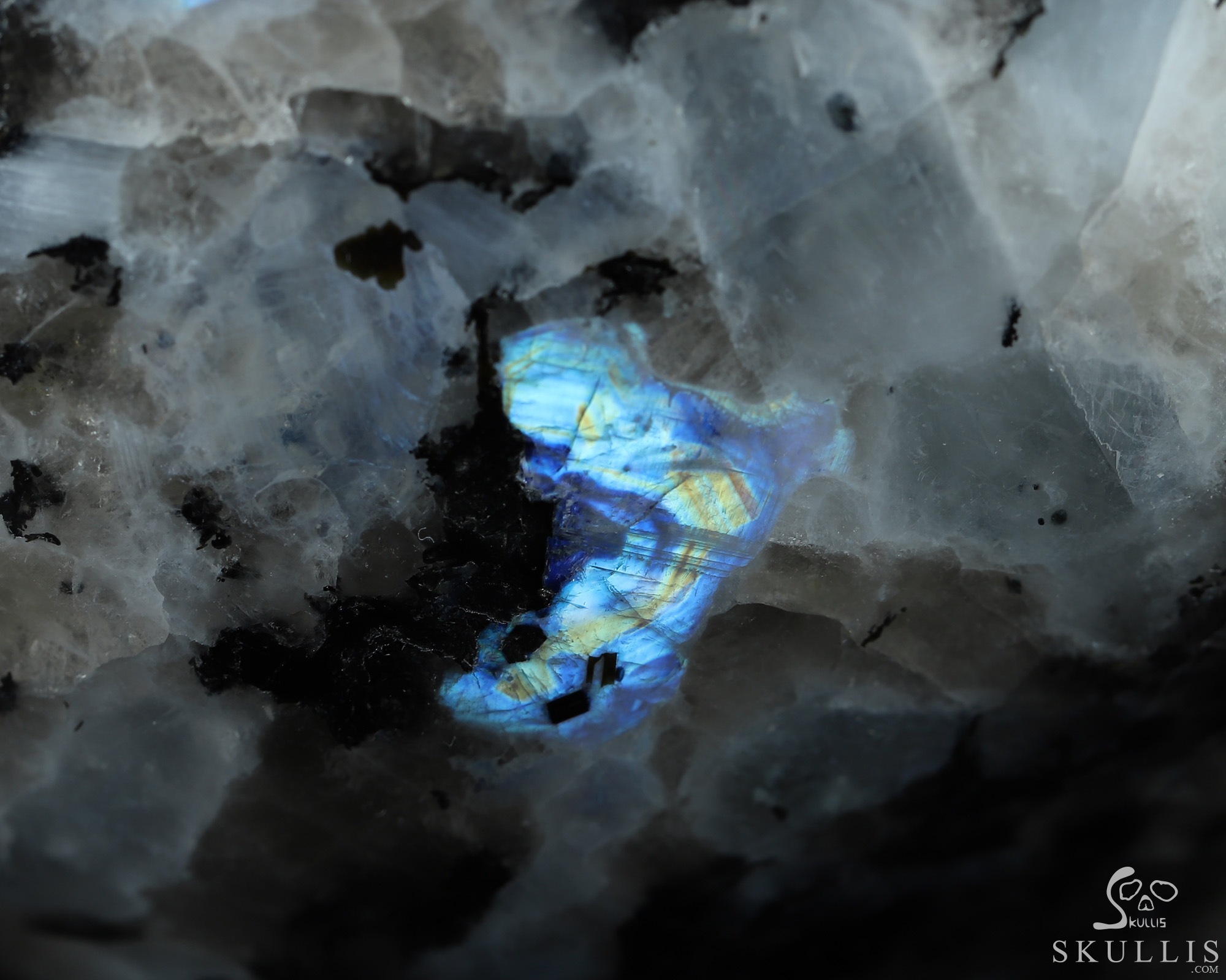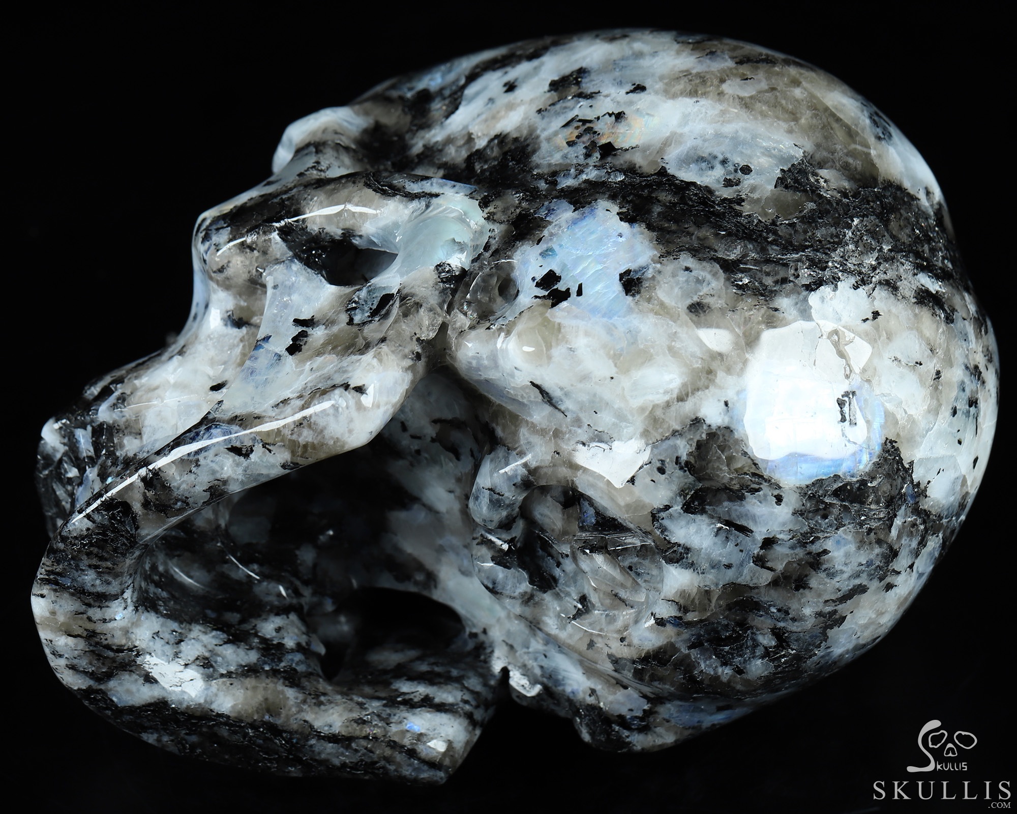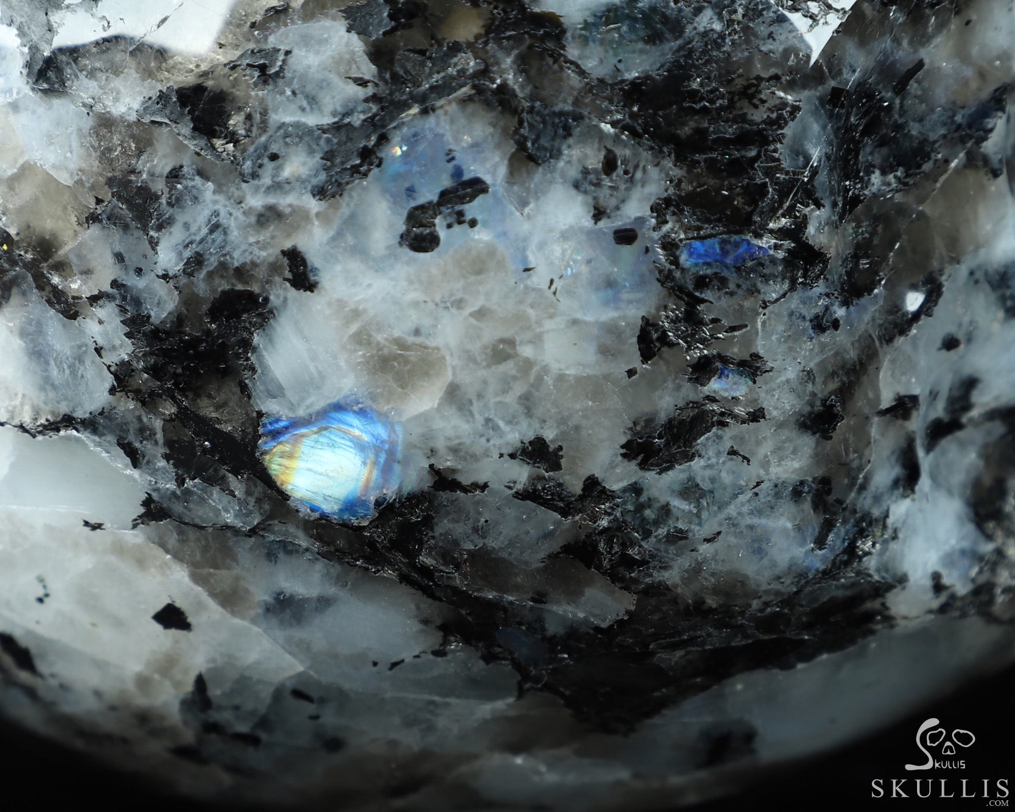 You are looking at a Black Tourmaline and Moonstone skull. The skull is 6.7 inches long from front to back.