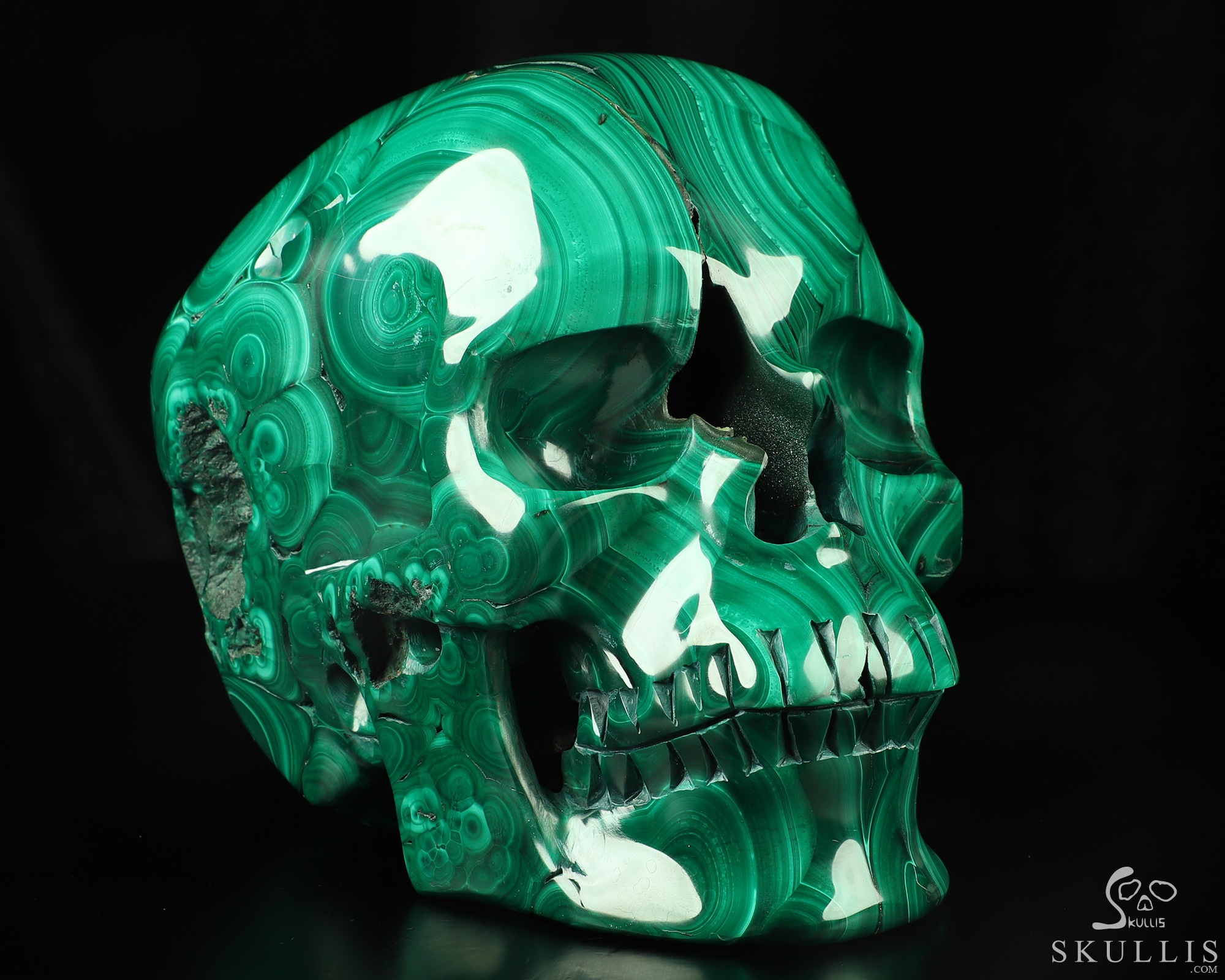 GEODE Lifesized 7.2" Malachite Carved Crystal Skull,Super Realistic, Crystal Healing