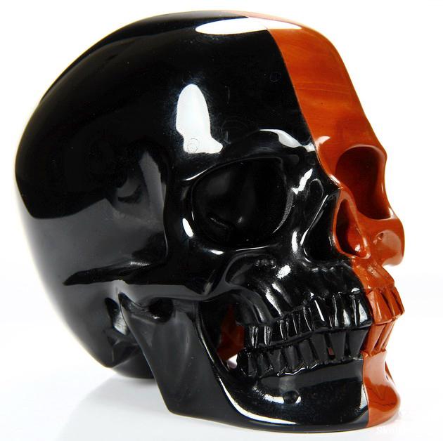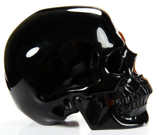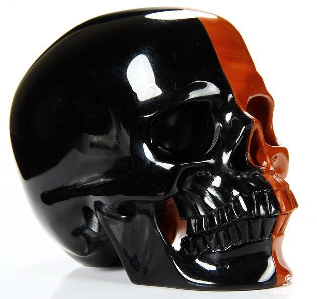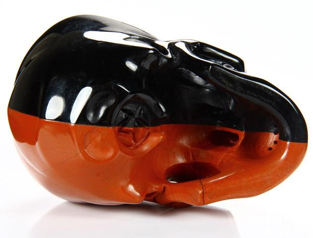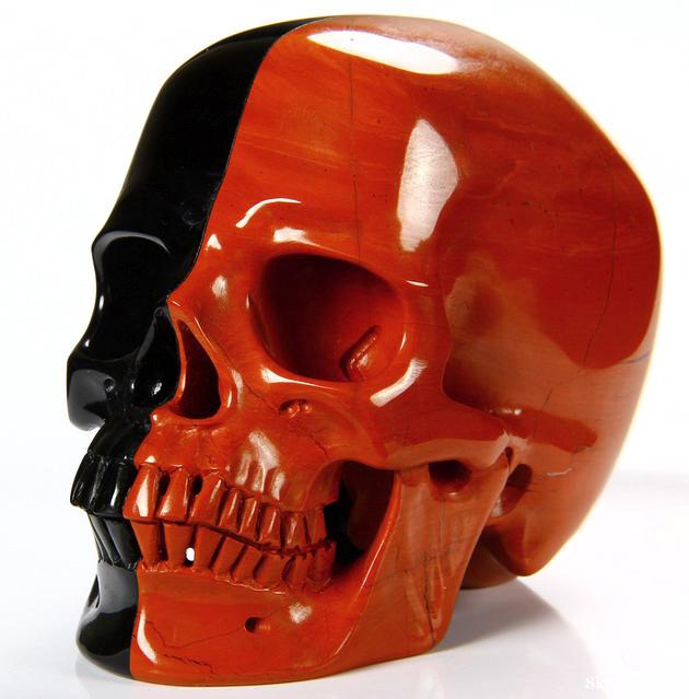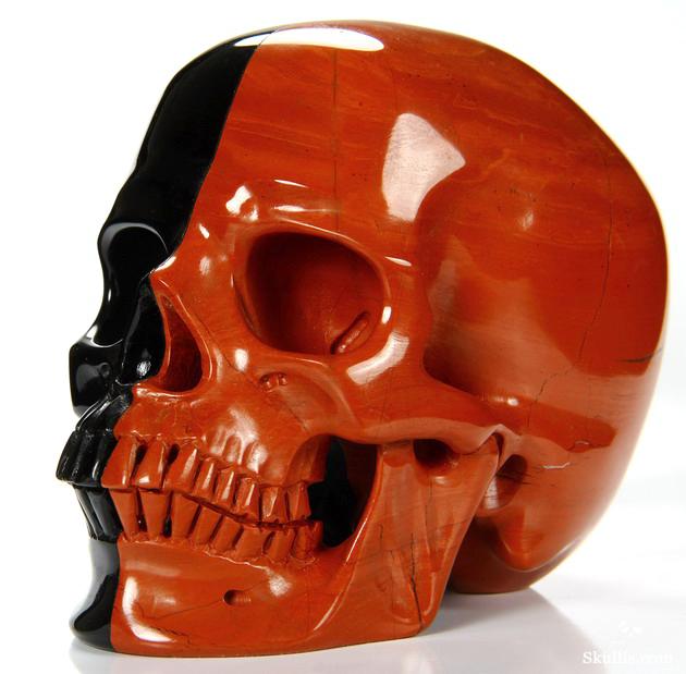 NOTE: Skullis does not prescribe treatment for medical issues. Skullis offers information for reference to assist with the selection and understanding of crystal skulls, including this black obsidian and red jasper crystal skull sculpture.