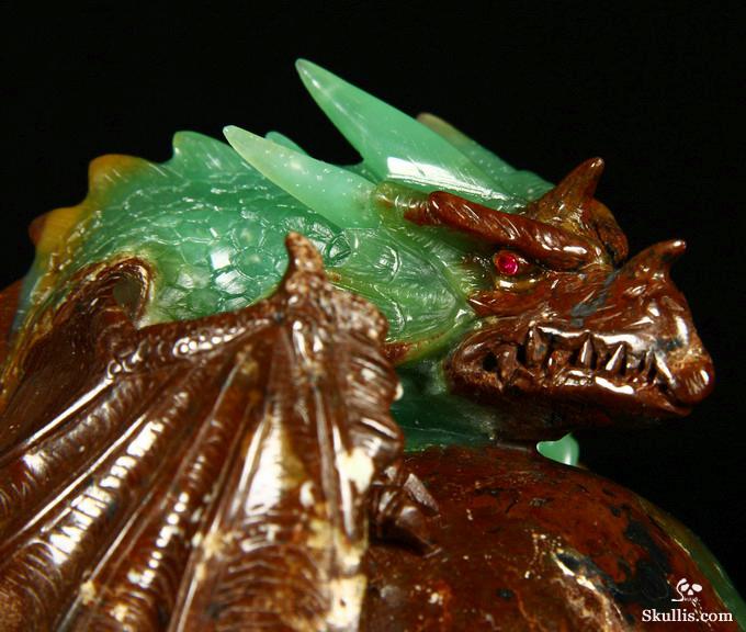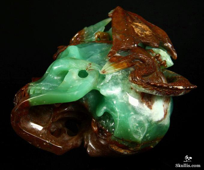 NOTE: Skullis does not prescribe treatment for medical issues. Skullis offers information for reference to assist with the selection and understanding of crystal skulls, including this chrysoprase gemstone crystal skull and dragon with ruby eyes sculpture.