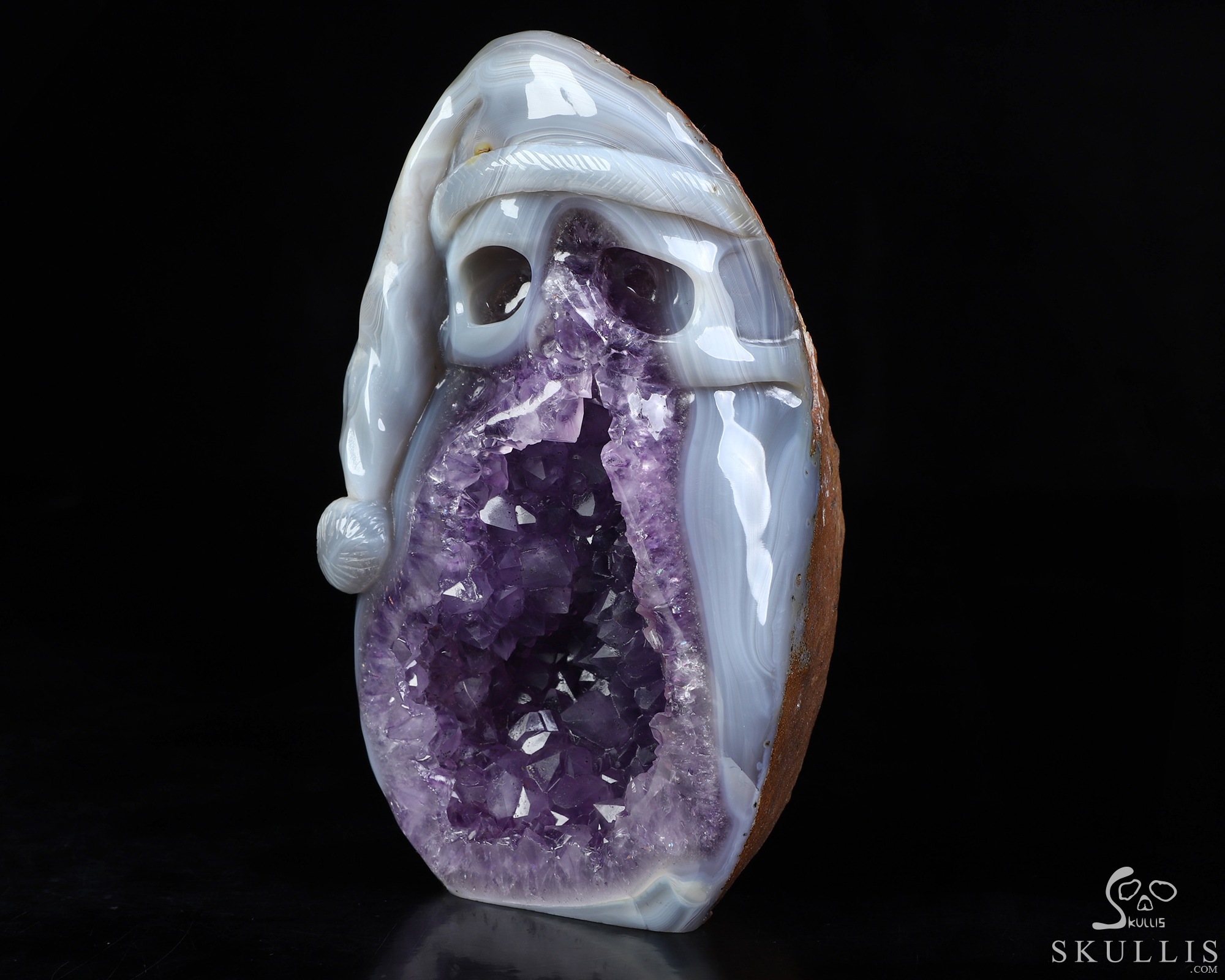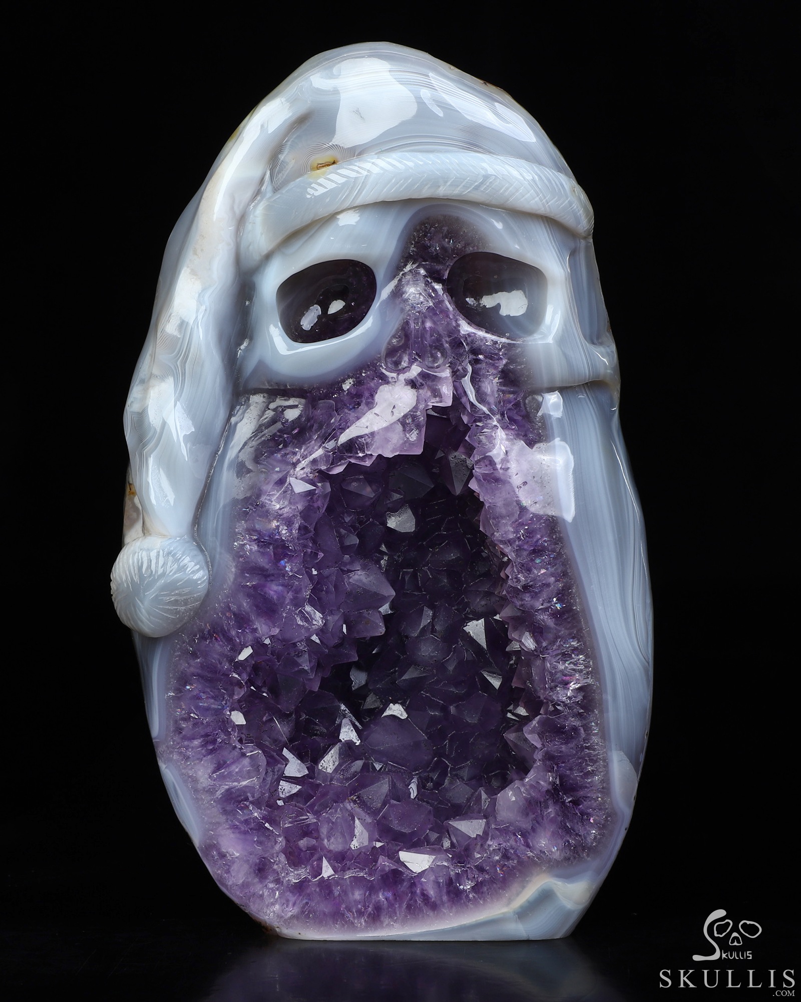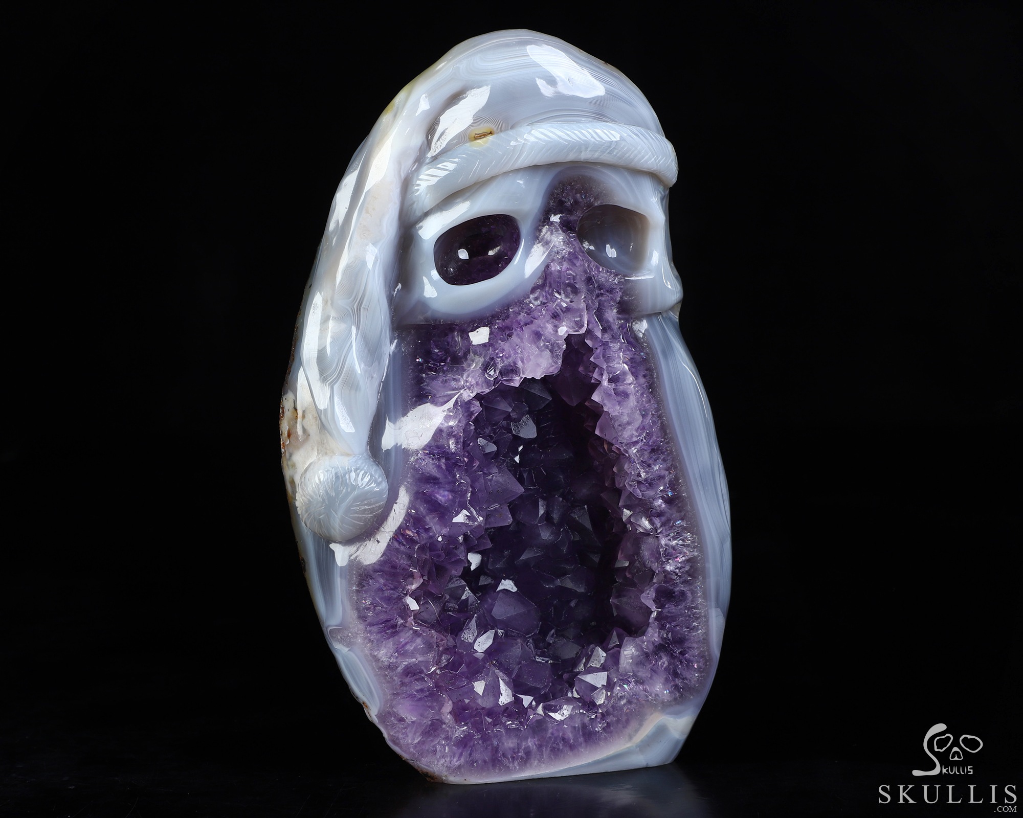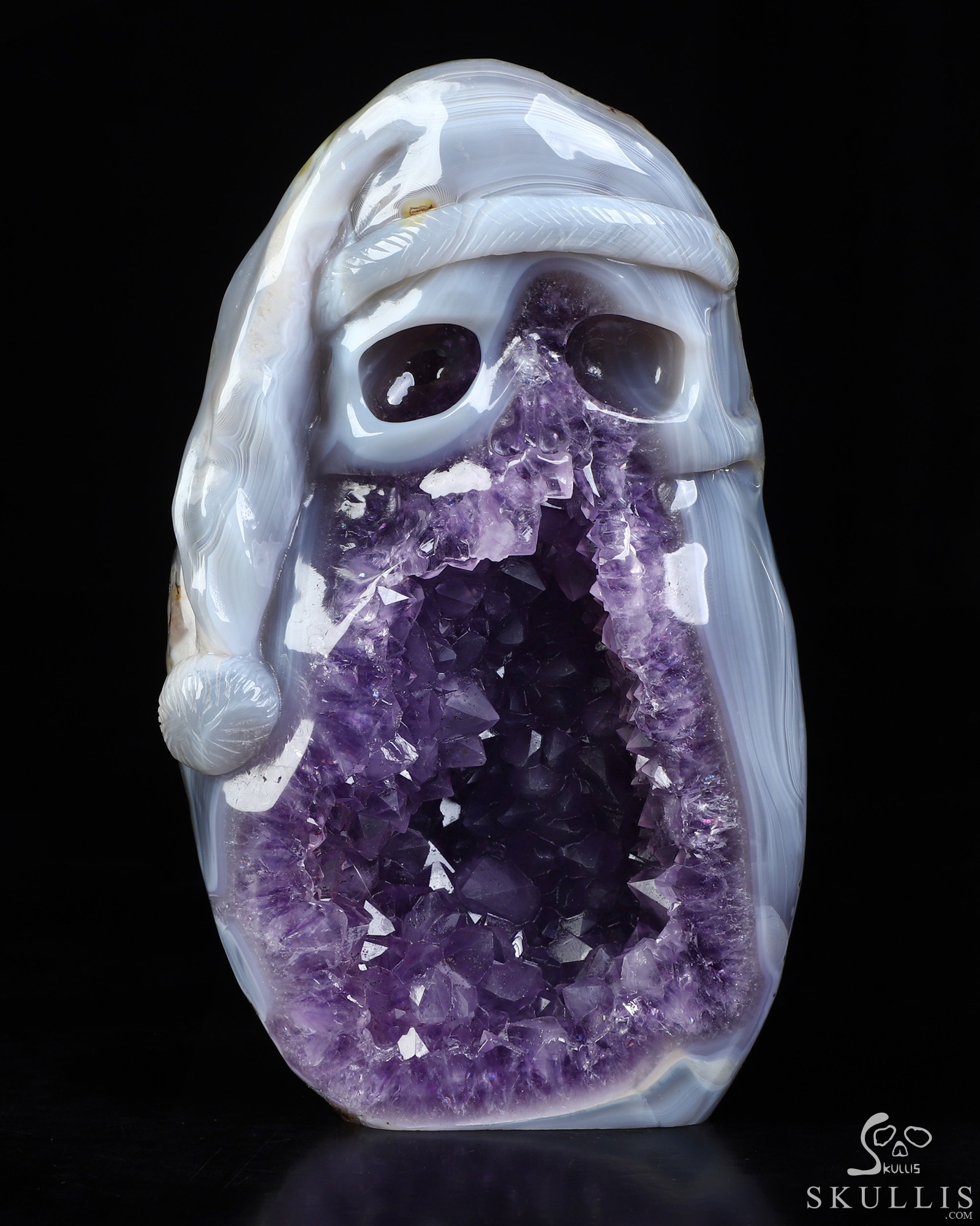 Merry Christmas! 5.3" Agate Amethyst Geode Hand Carved Crystal Skull Fine Art Sculpture, Crystal Healing