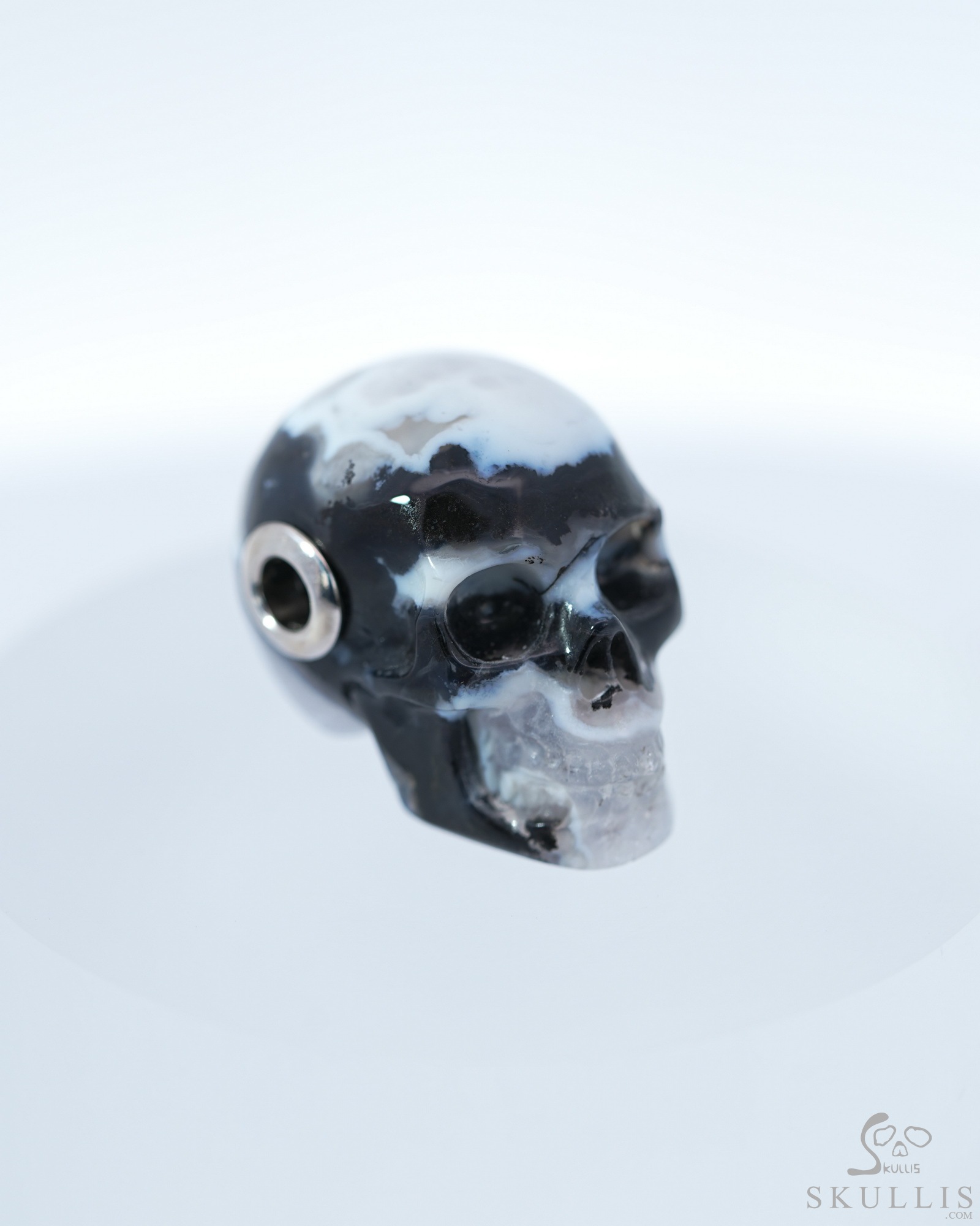 You are looking at a Black Zebra Agate skull. The skull is 1.1 inches from front to back.