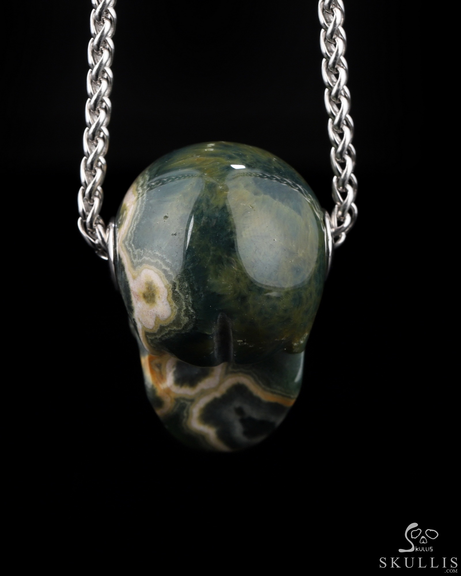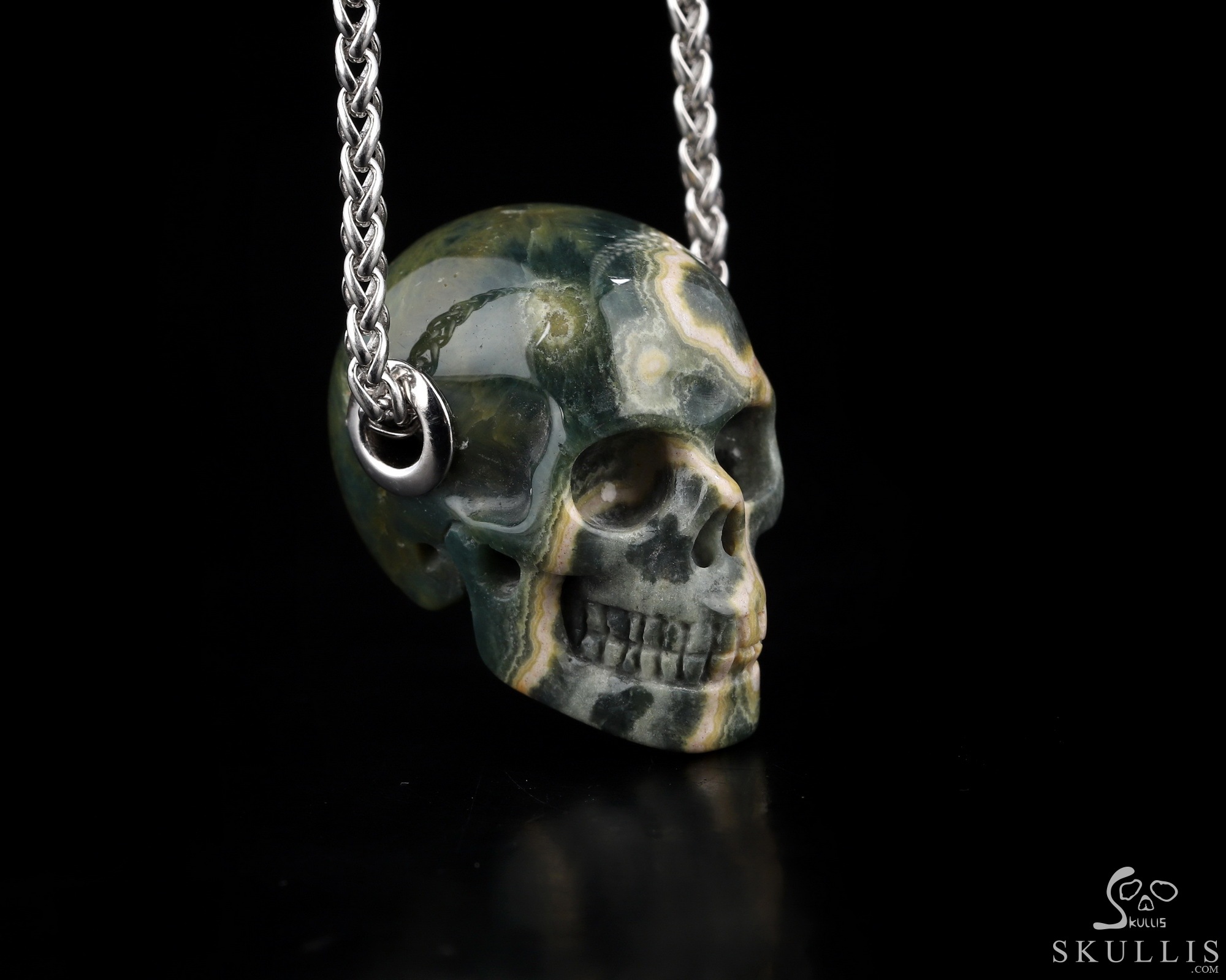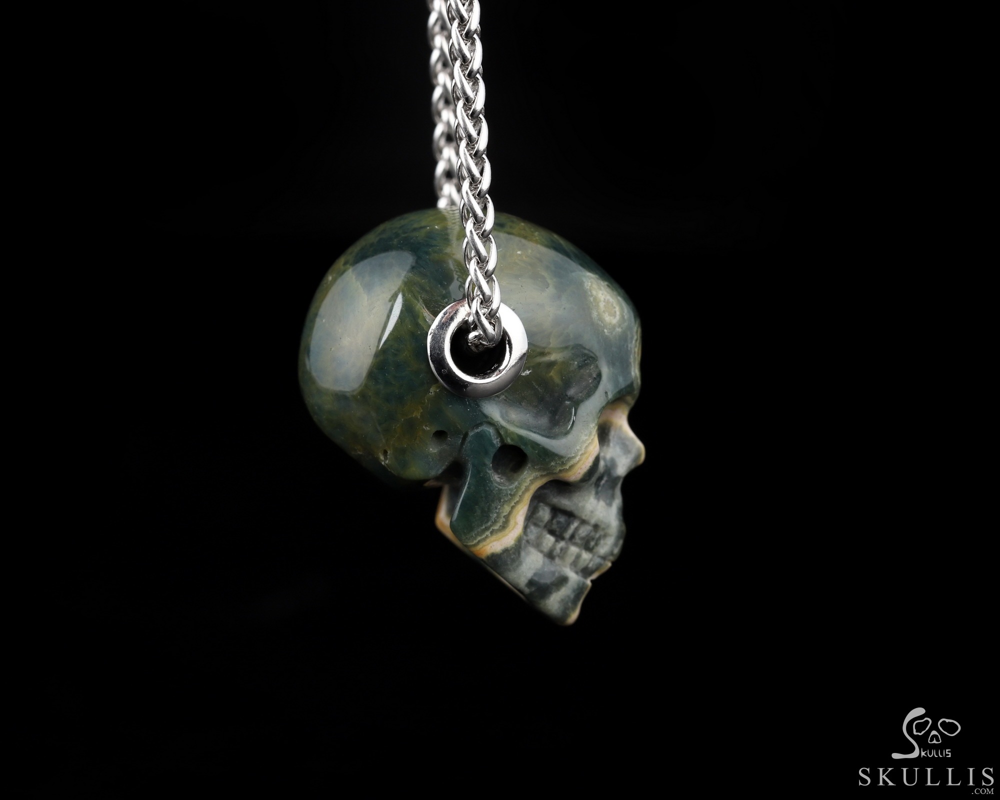 Necklace of 1.1" Ocean Jasper Hand Carved Crystal Skull Pendant, Skull Jewelry