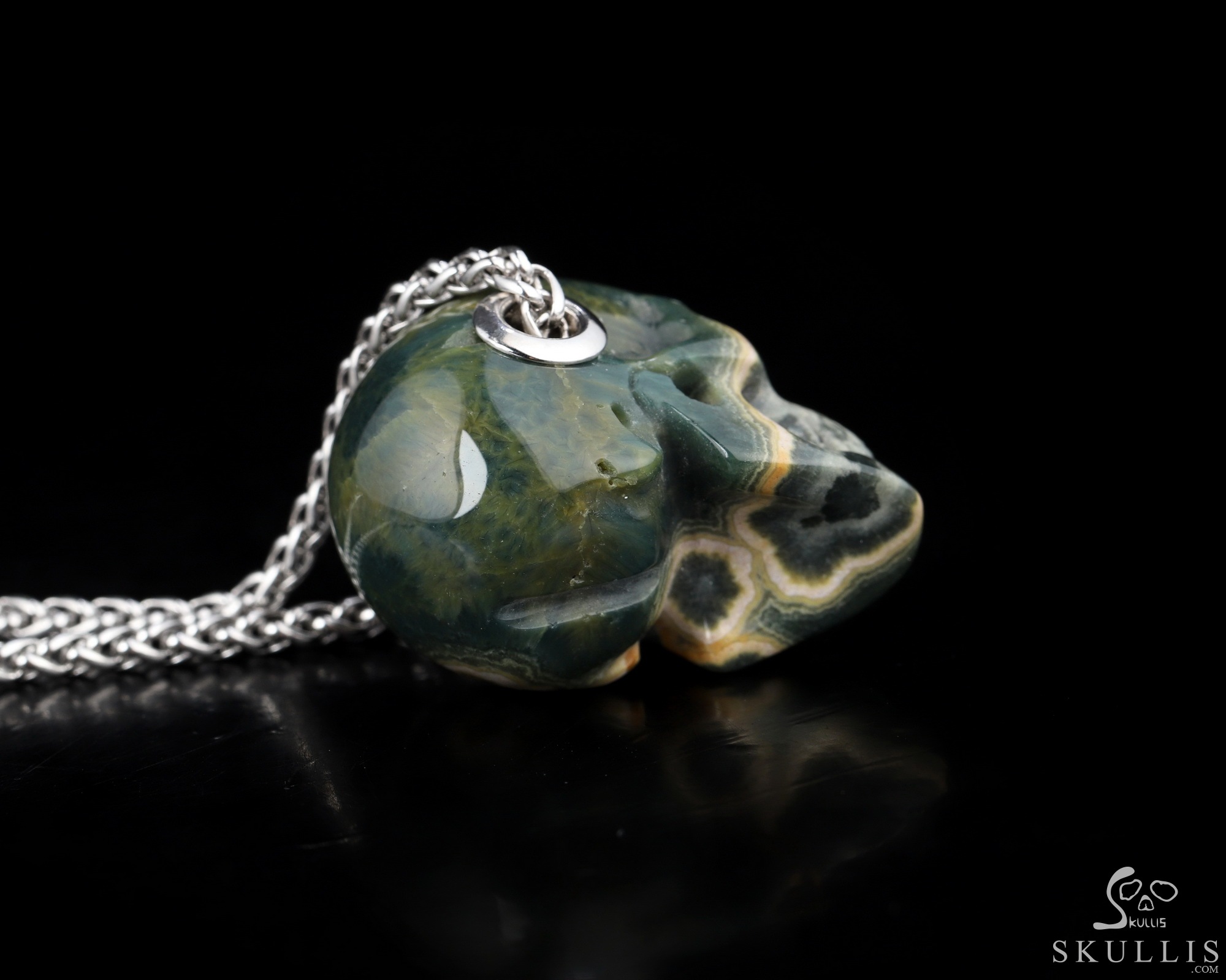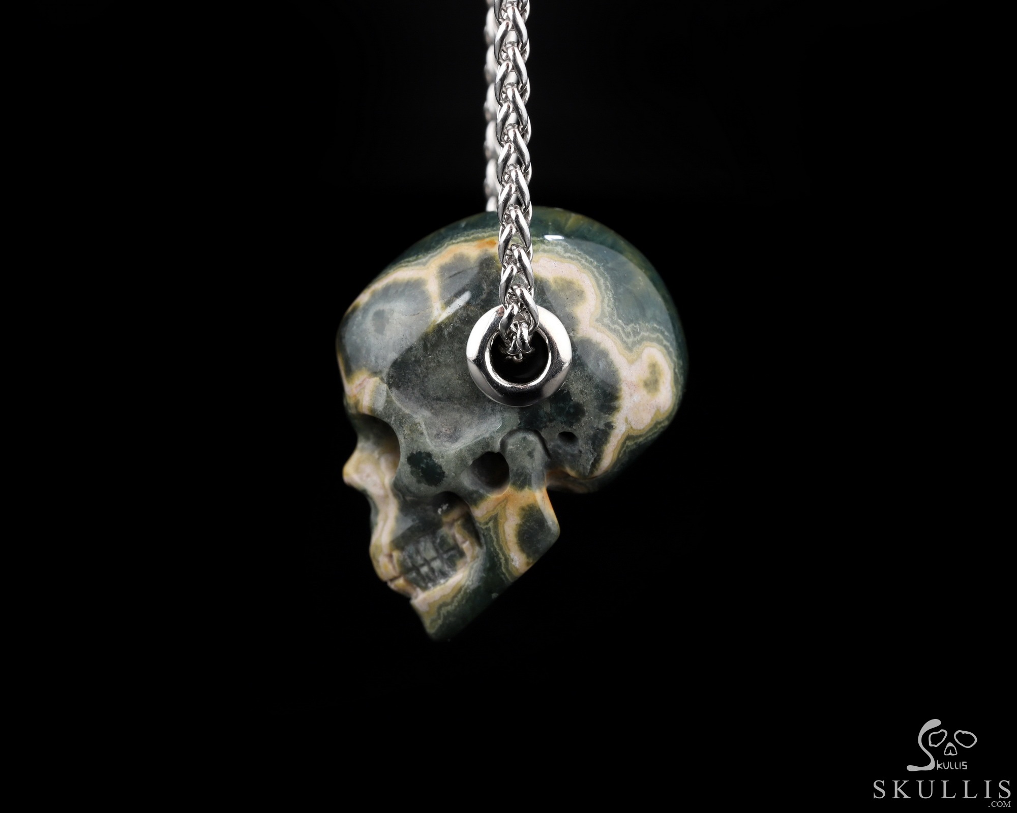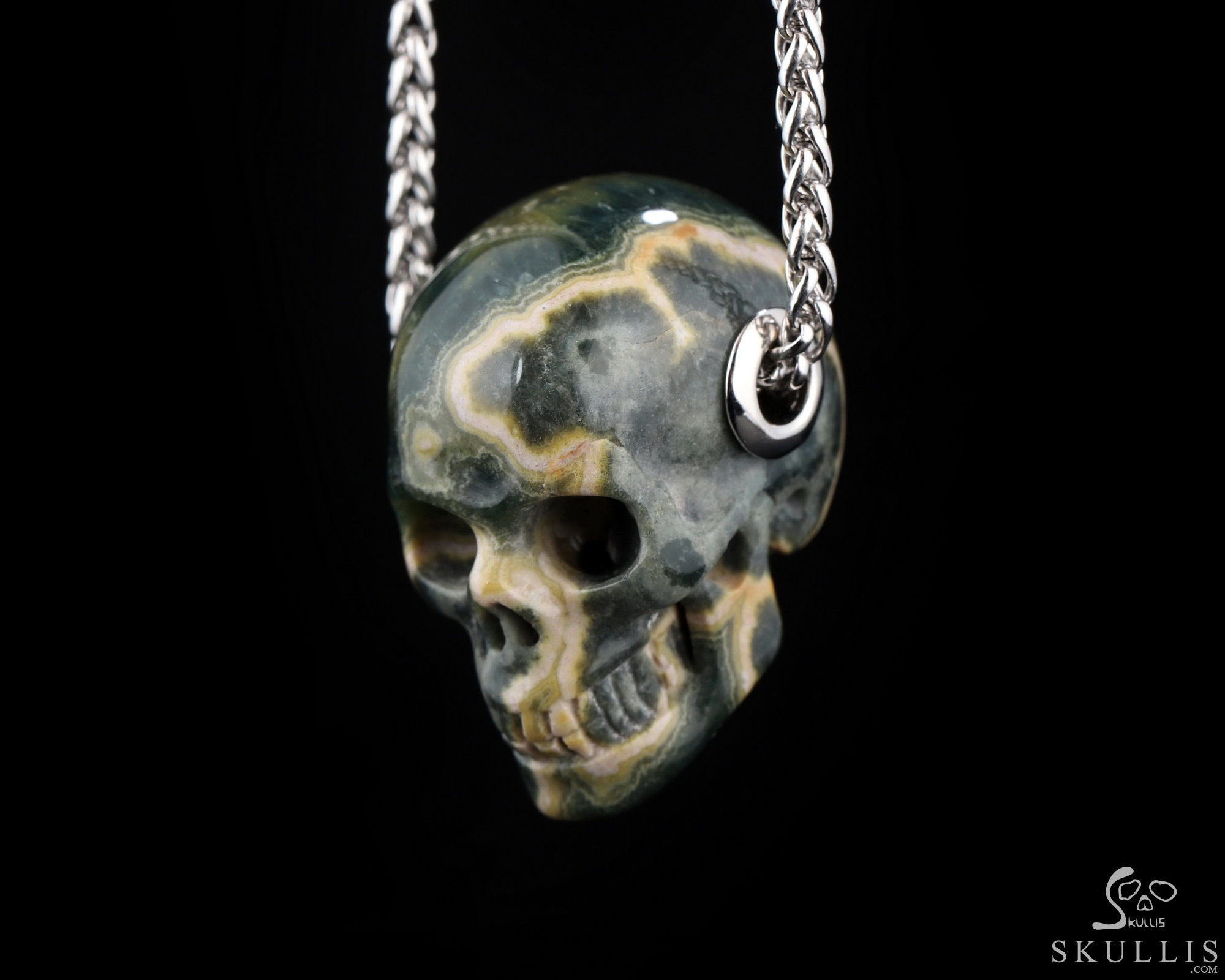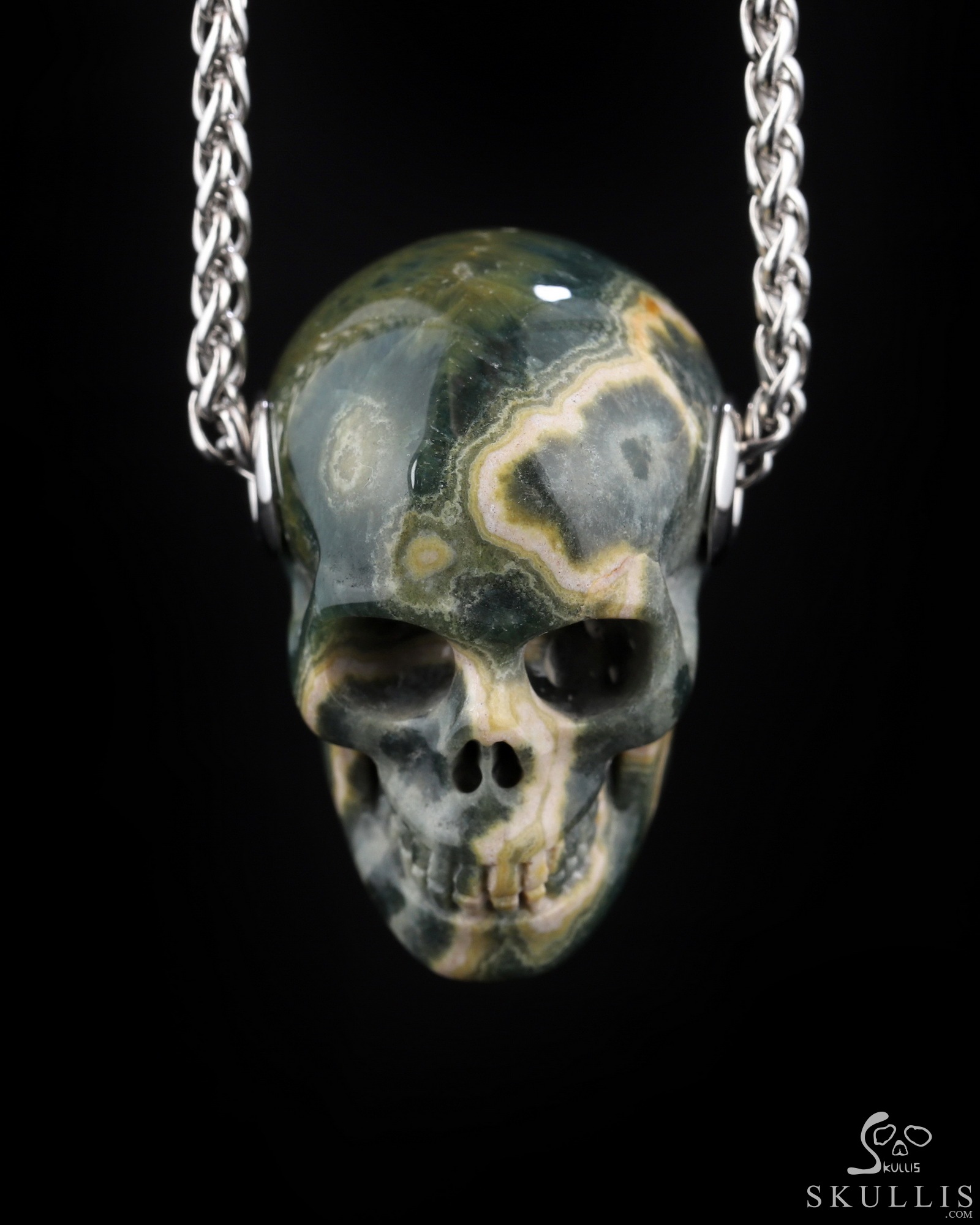Necklace of 1.1" Ocean Jasper Hand Carved Crystal Skull Pendant, Skull Jewelry