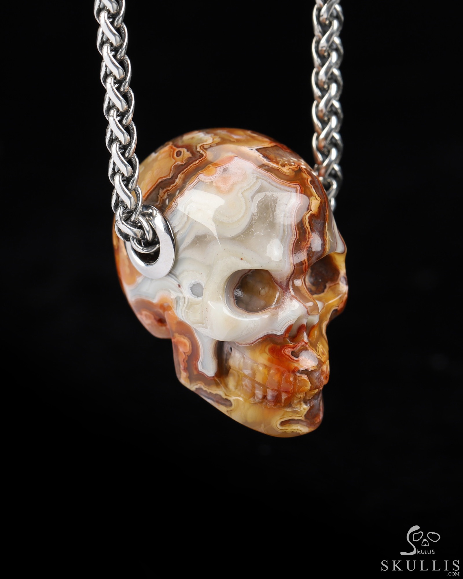 Necklace of 1.1" Red Crazy Lace Agate Hand Carved Crystal Skull Pendant, Skull Jewelry