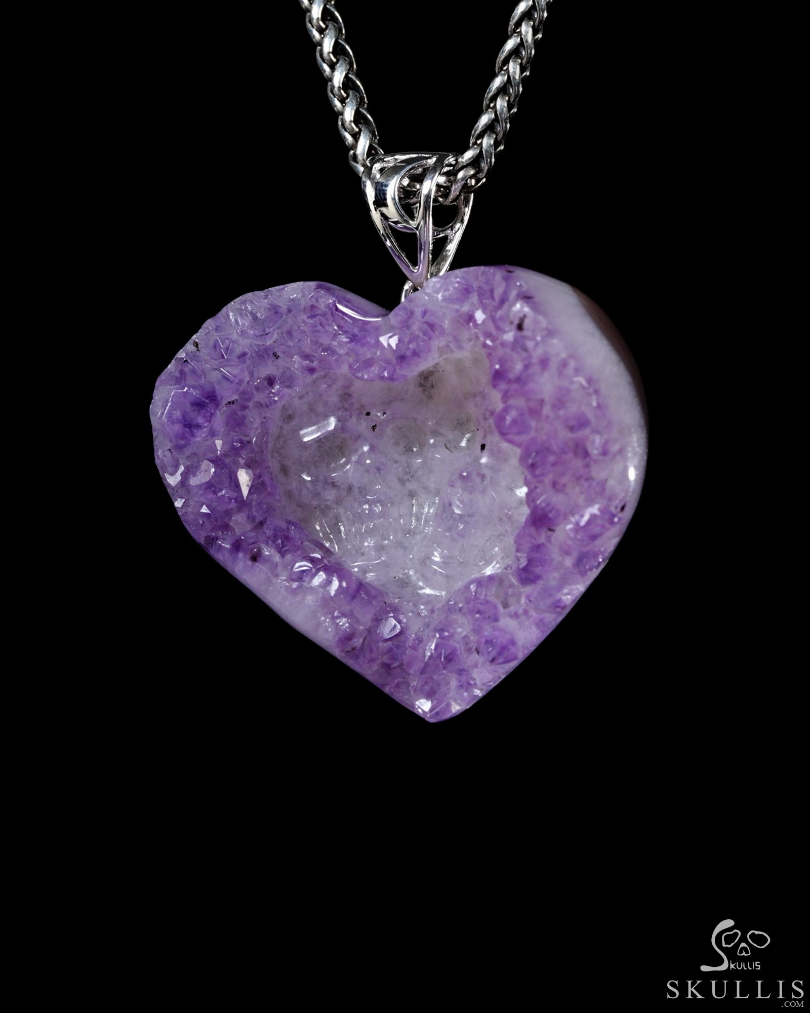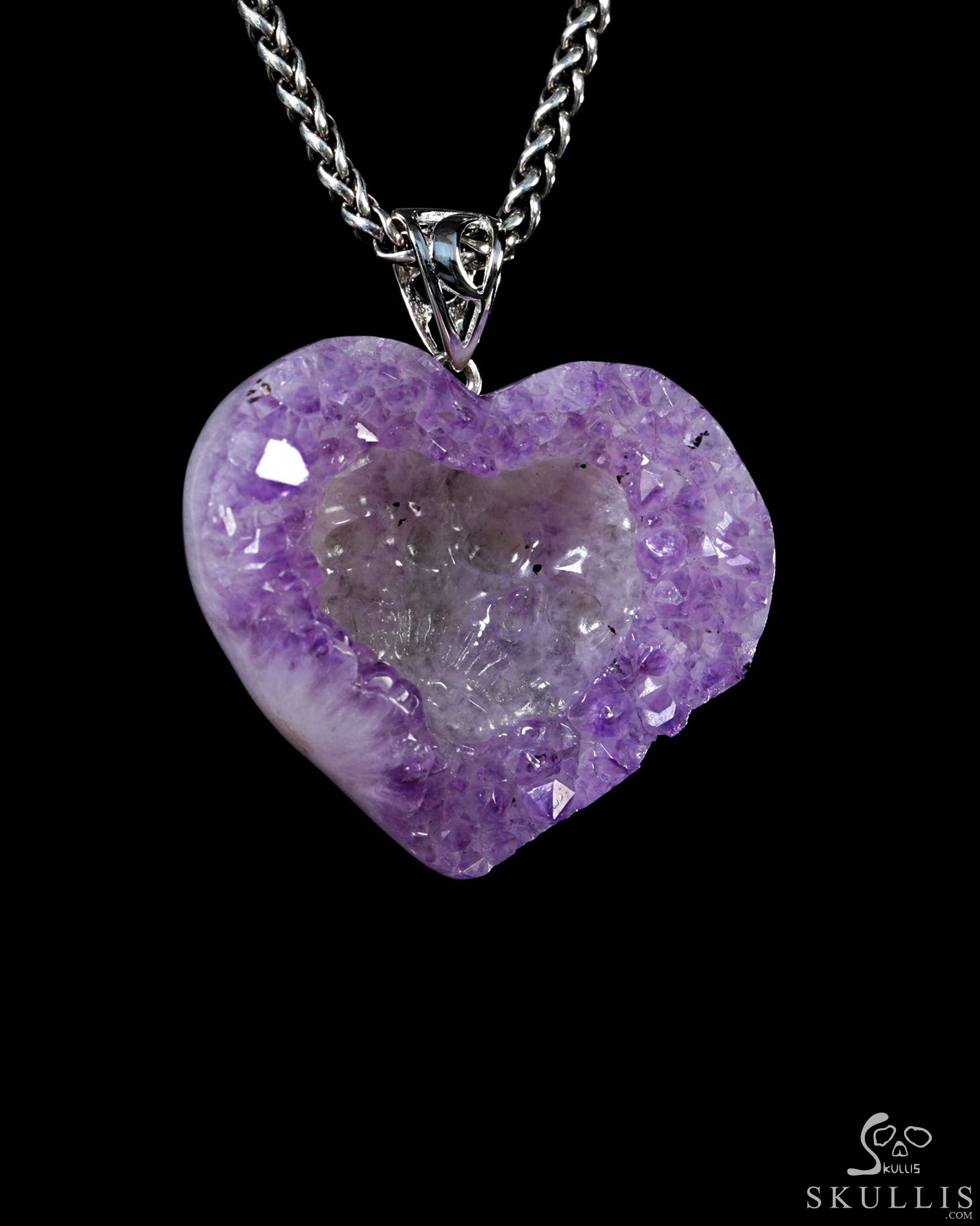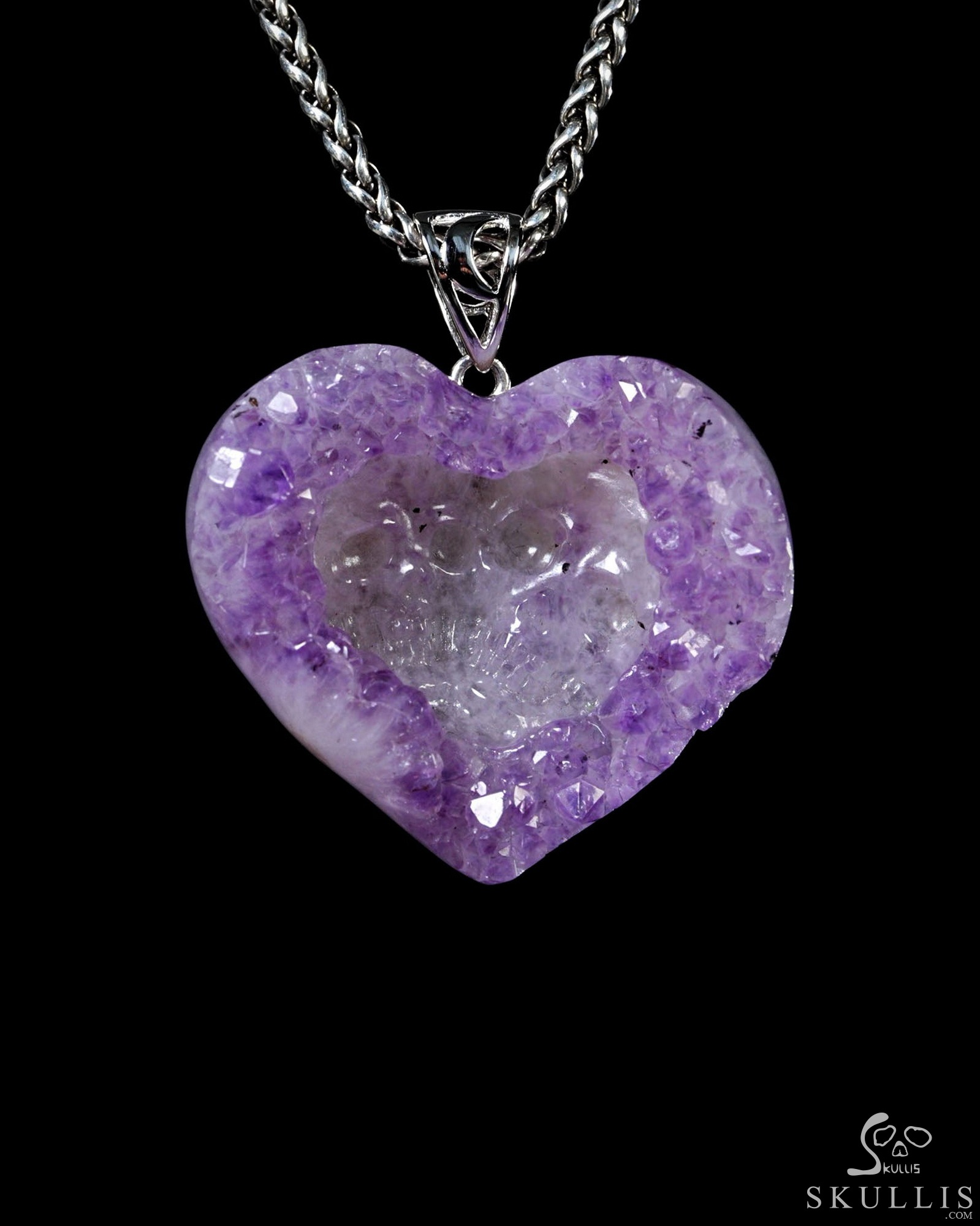 Necklace of 1.7" Agate Amethyst Druse Hand Carved Crystal Skull Pendant, Skull Jewelry