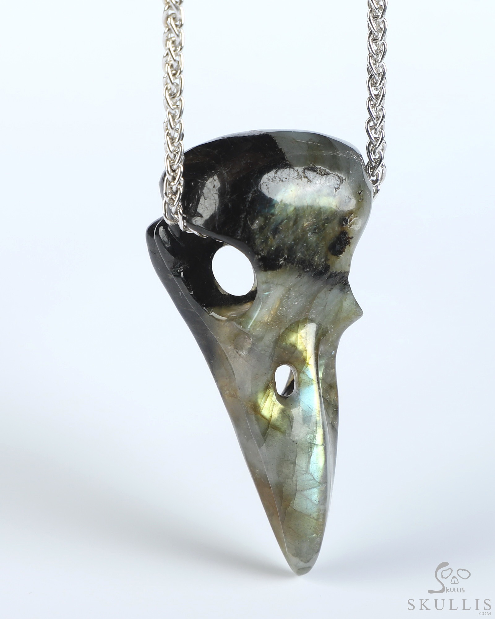 Necklace of 2.1" Labradorite Hand Carved Crystal Skull Pendant, Skull Jewelry