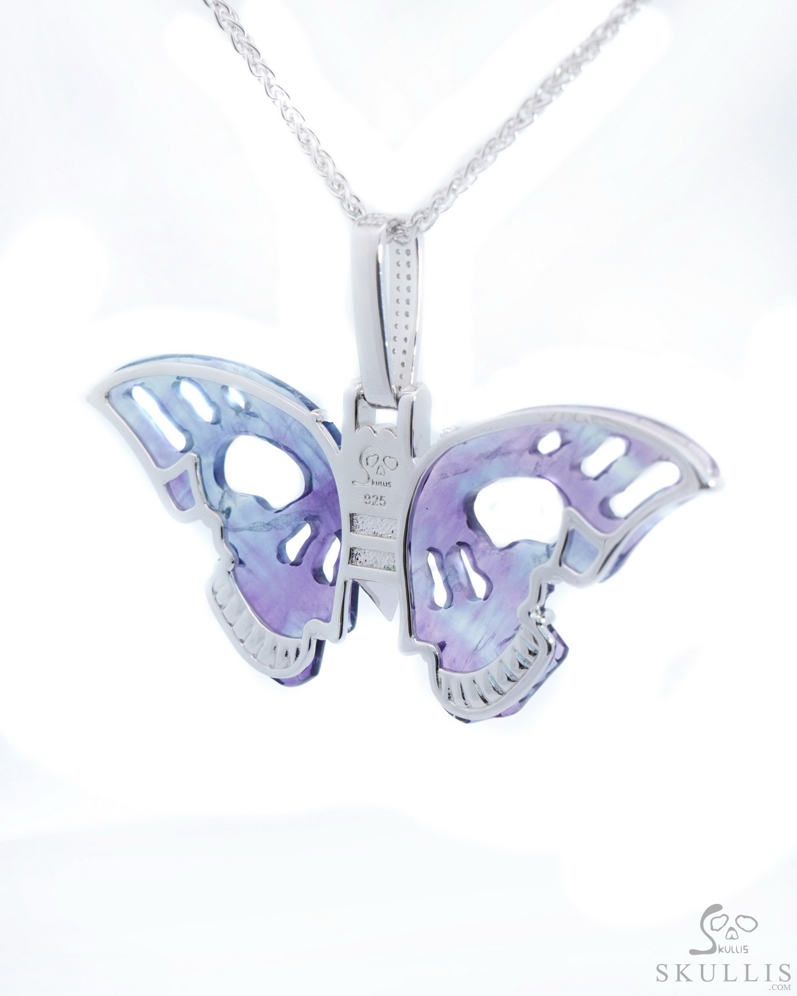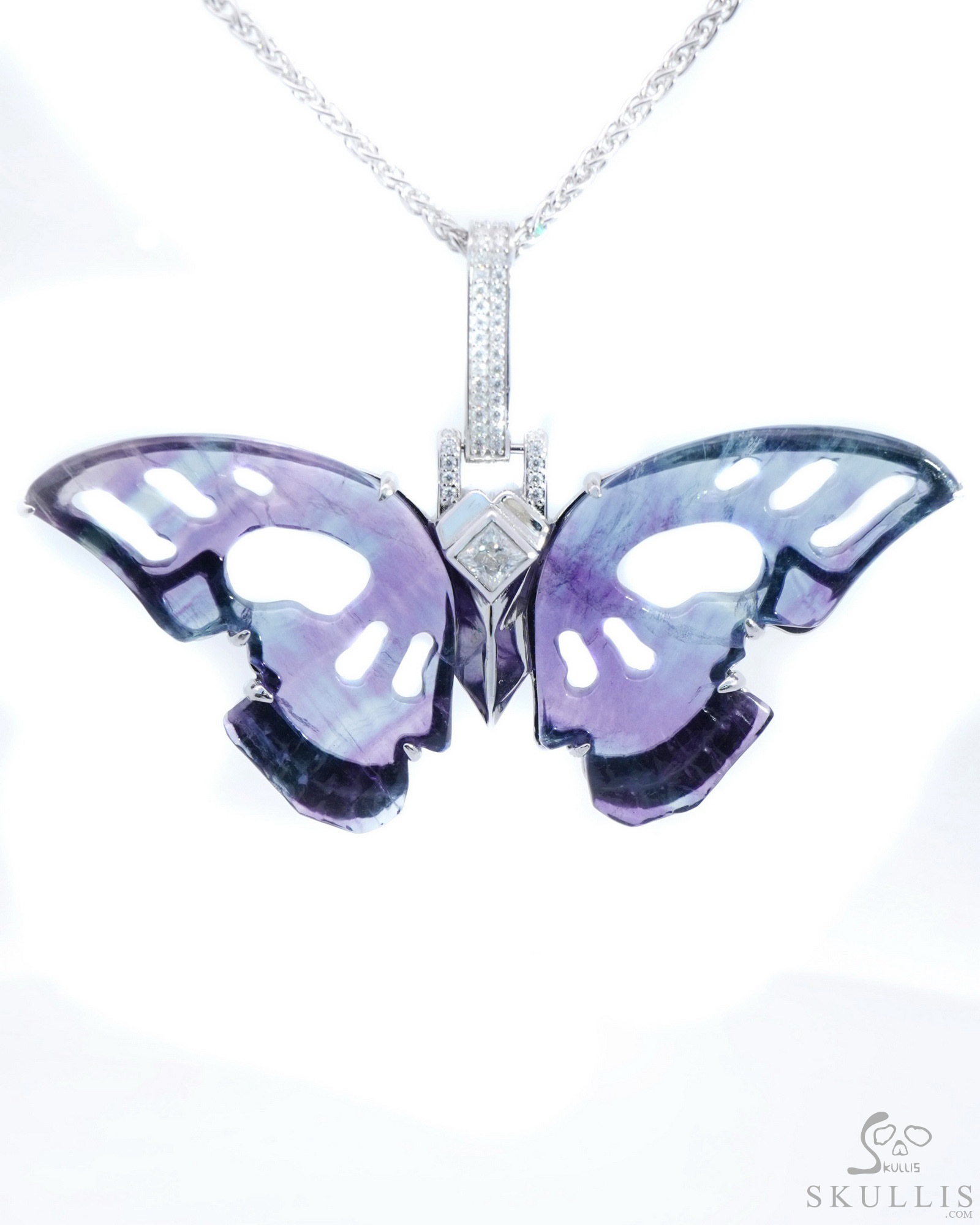 Necklace of 3.3" Gem Skull Pendant Necklace of Fluorite Butterfly Carved Skull, Skull Jewelry