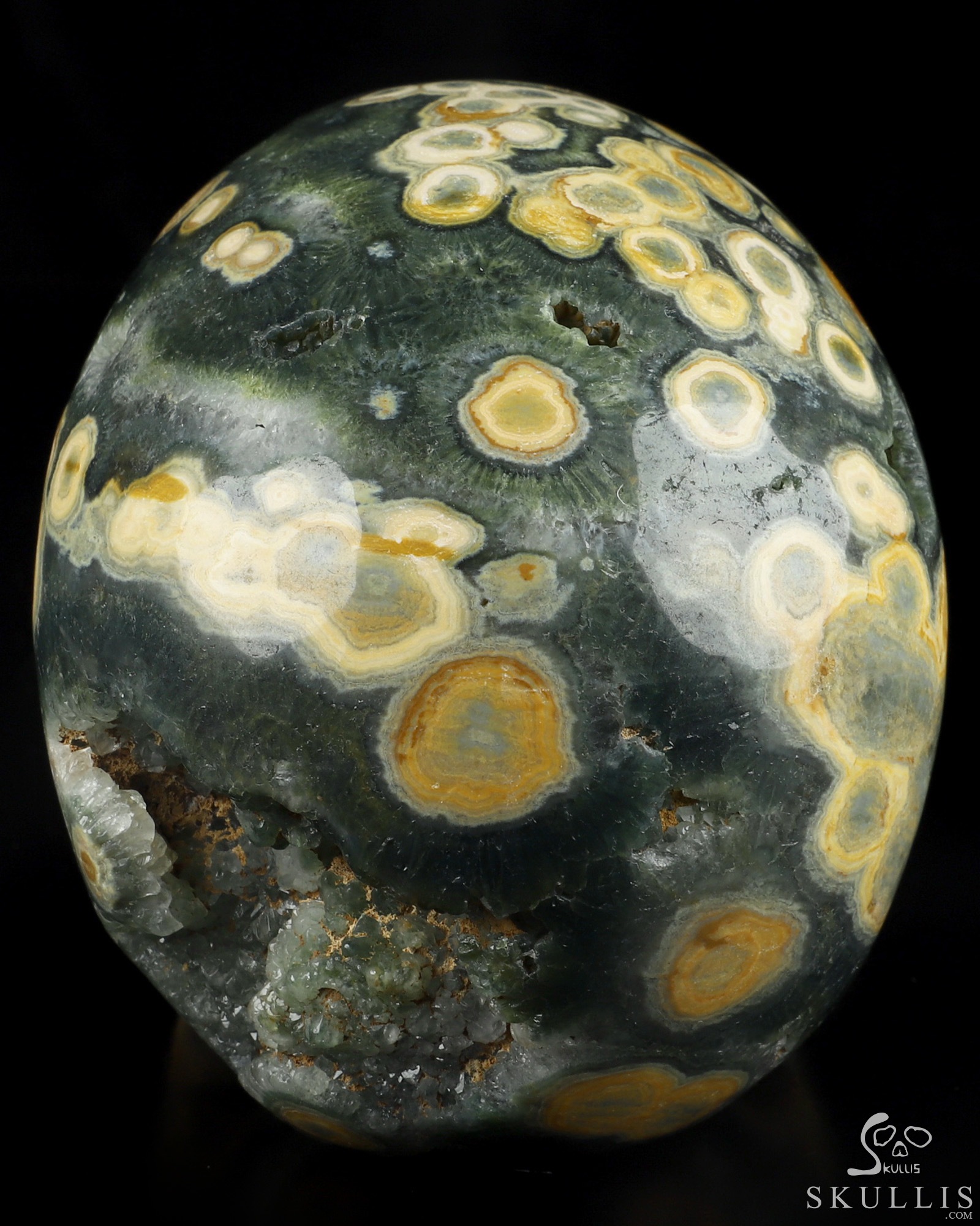 Another exceptional quality of Ocean Jasper is translucency. Many specimens are opaque and still very beautiful while others, when held in front of a strong light source, display what can only be described as another world! When viewed in front of a bright light the translucent, clear, or just foggy background illuminates and displays the contrasting solid perfect circles –the orbs- which then reveal exactly why Ocean Jasper is sometimes called "Fish Eye Jasper". These solid, soft looking spheres appear suspended in the illuminated quartz, and they can make one tempted to reach in and try to touch them!