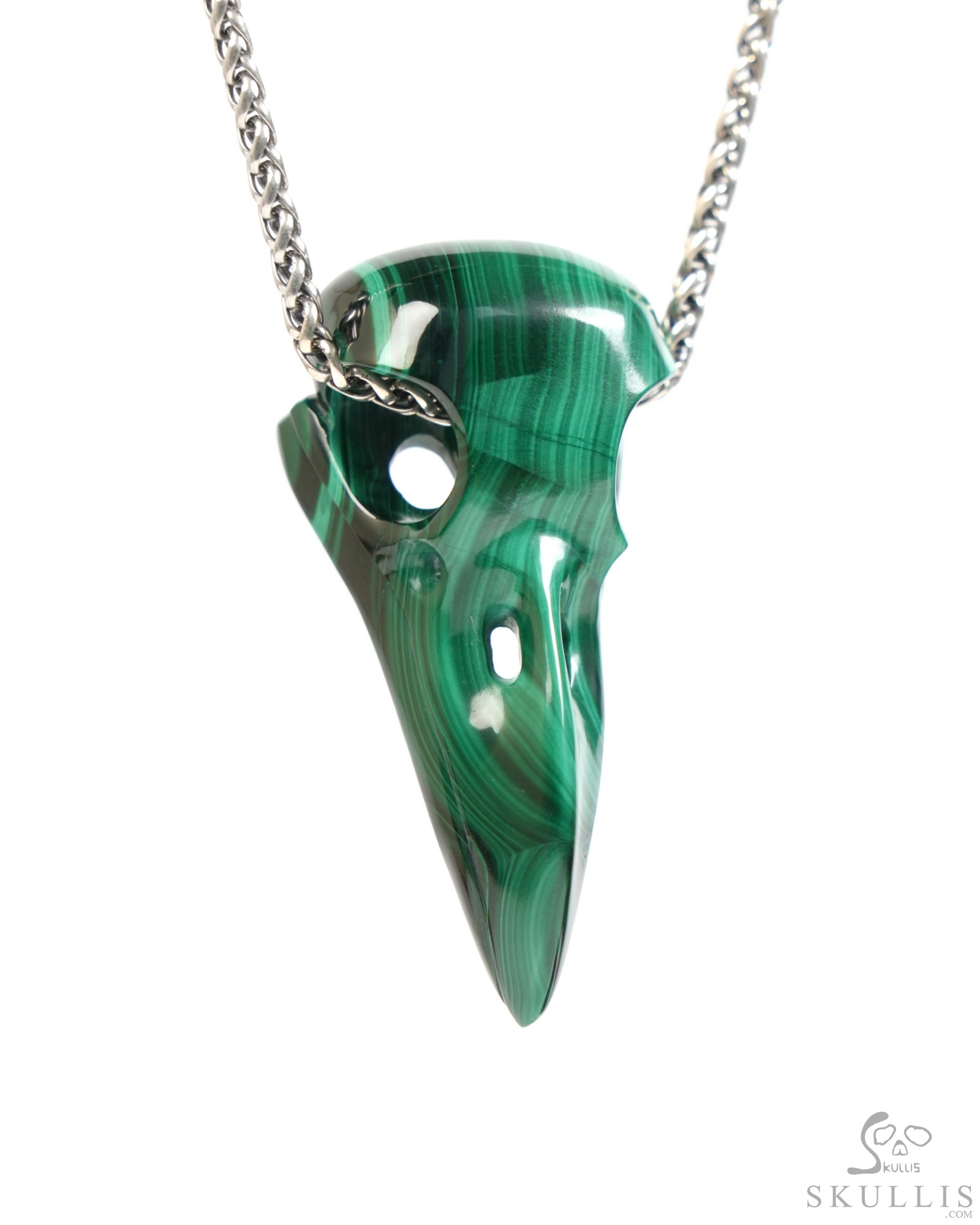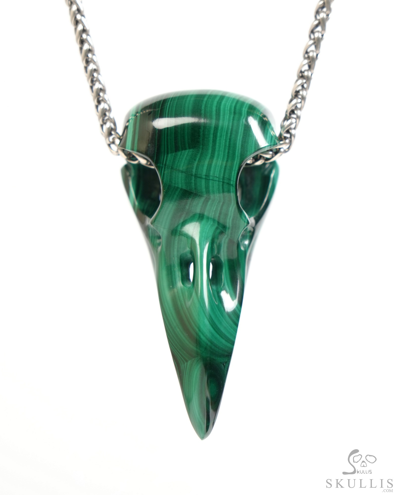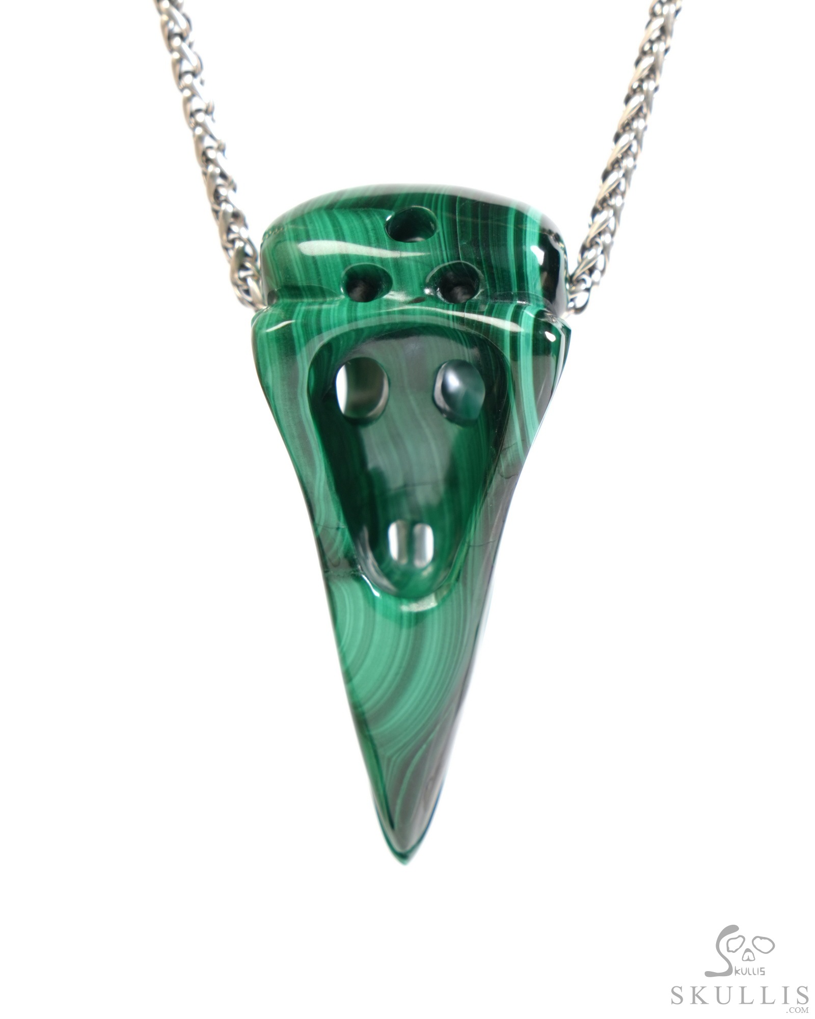 Necklace of 1.5" Malachite Hand Carved Crystal Skull and Silver Snake Pendant, Skull Jewelry