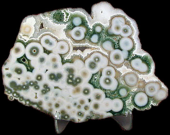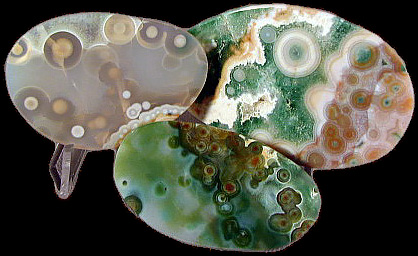 Another exceptional quality of Ocean Jasper is translucency. Many specimens are opaque and still very beautiful while others, when held in front of a strong light source, display what can only be described as another world! When viewed in front of a bright light the translucent, clear, or just foggy background illuminates and displays the contrasting solid perfect circles –the orbs- which then reveal exactly why Ocean Jasper is sometimes called "Fish Eye Jasper". These solid, soft looking spheres appear suspended in the illuminated quartz, and they can make one tempted to reach in and try to touch them!
