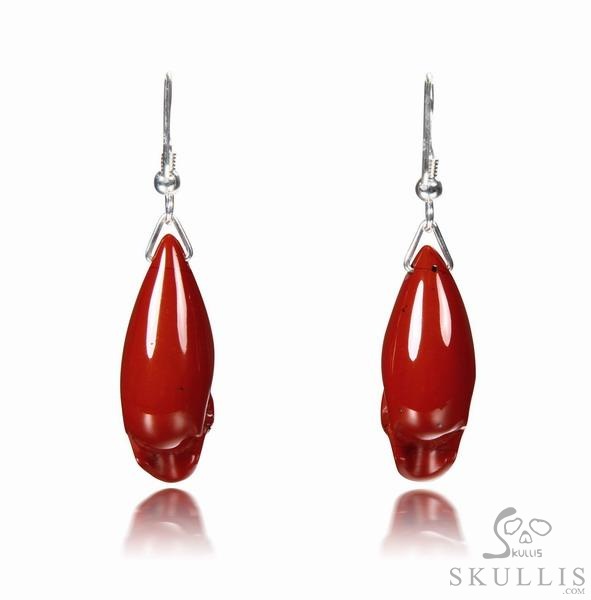 Red Jasper & 925 Sterling Silver Carved Elongated Skull Earrings with 925 Sterling Silver Hooks